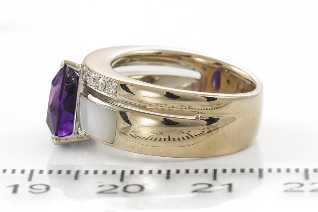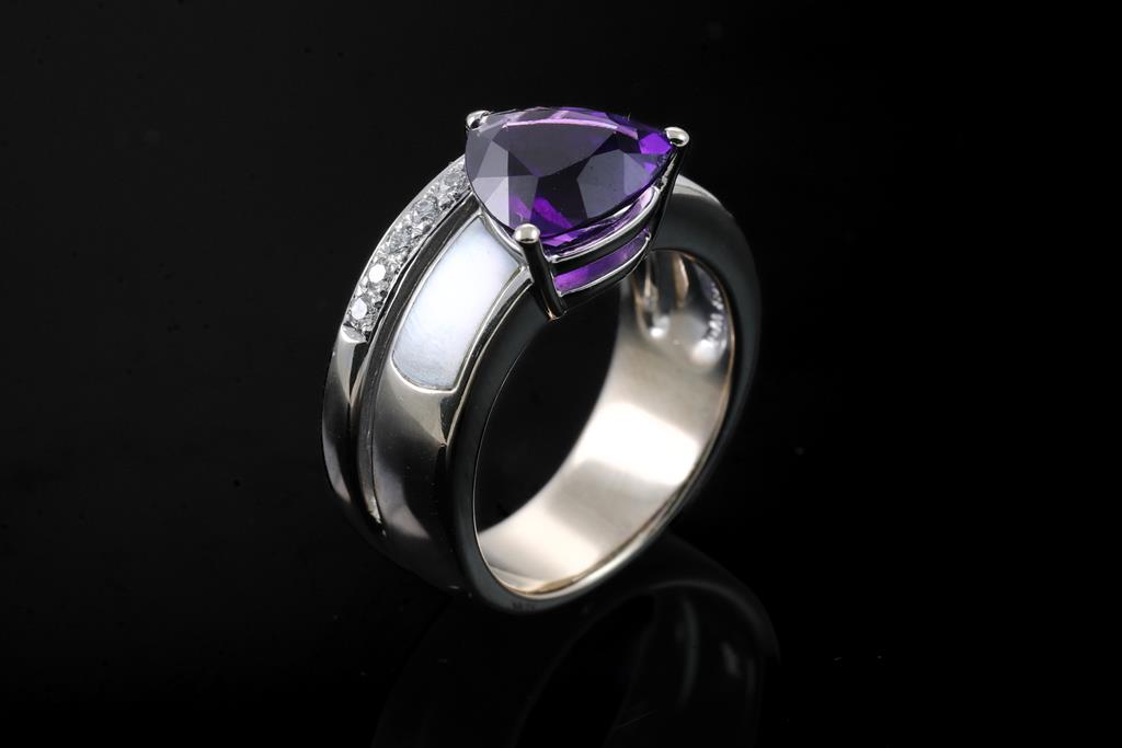 Tasaki Amethyst, Mother of Pearl and Diamond ring with trilliant cut Amethyst of approximately 2.70cts and 10 Diamonds totalling approximately 0.15cts. 18ct white gold. Ring size K - ring resizing not recommended. Weight: 10.6g. Width of ring: 8mm (Pre-owned)
