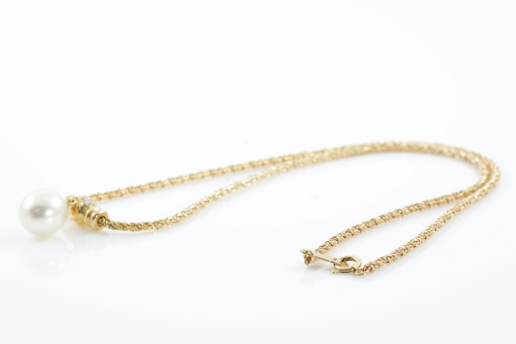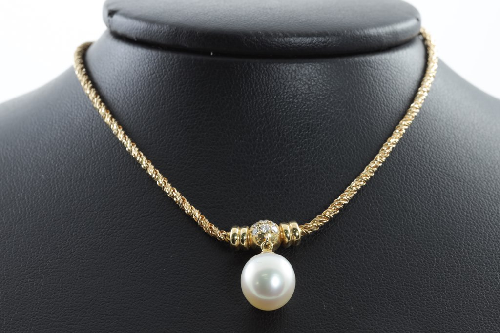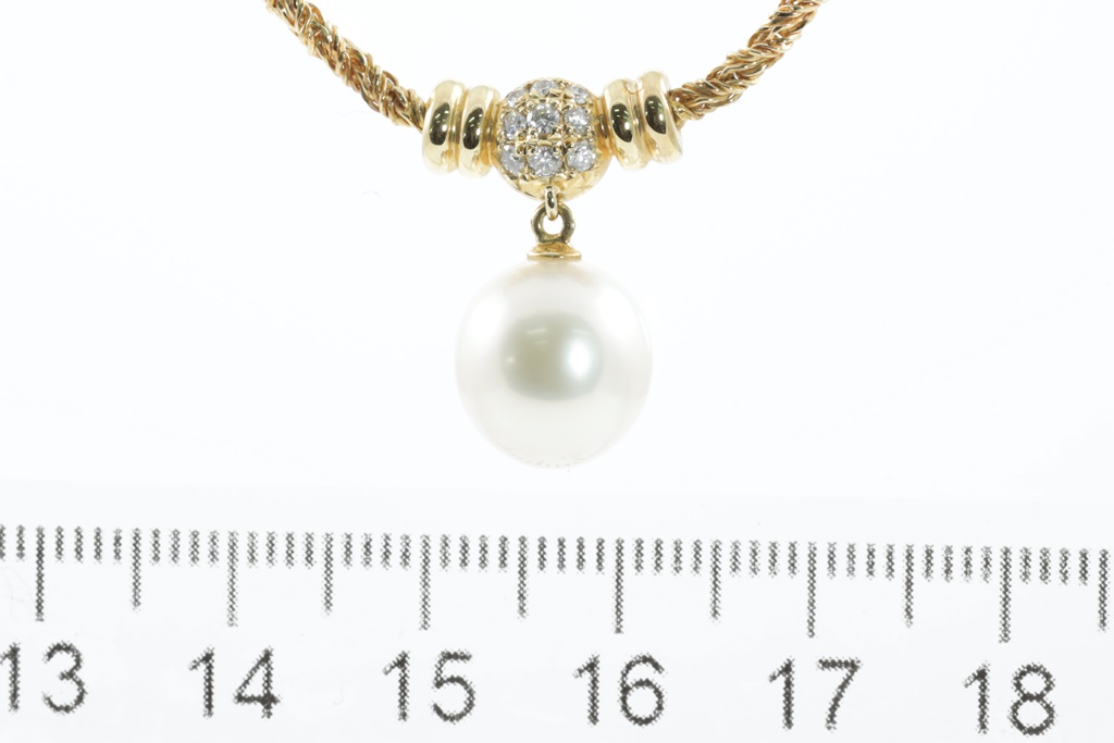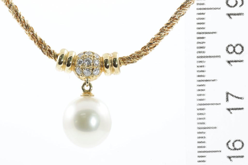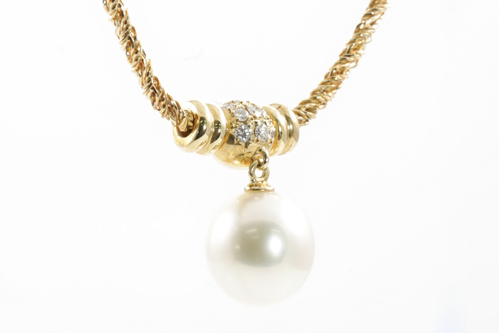 Tasaki Pearl and Diamond pendant with a South Sea Pearl of 10mm and Diamonds totalling 0.12cts. 18ct yellow gold with attached chain. Length: 42cm. Weight: 13.6g. (Pre-owned)