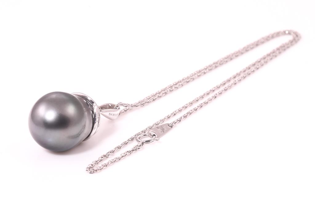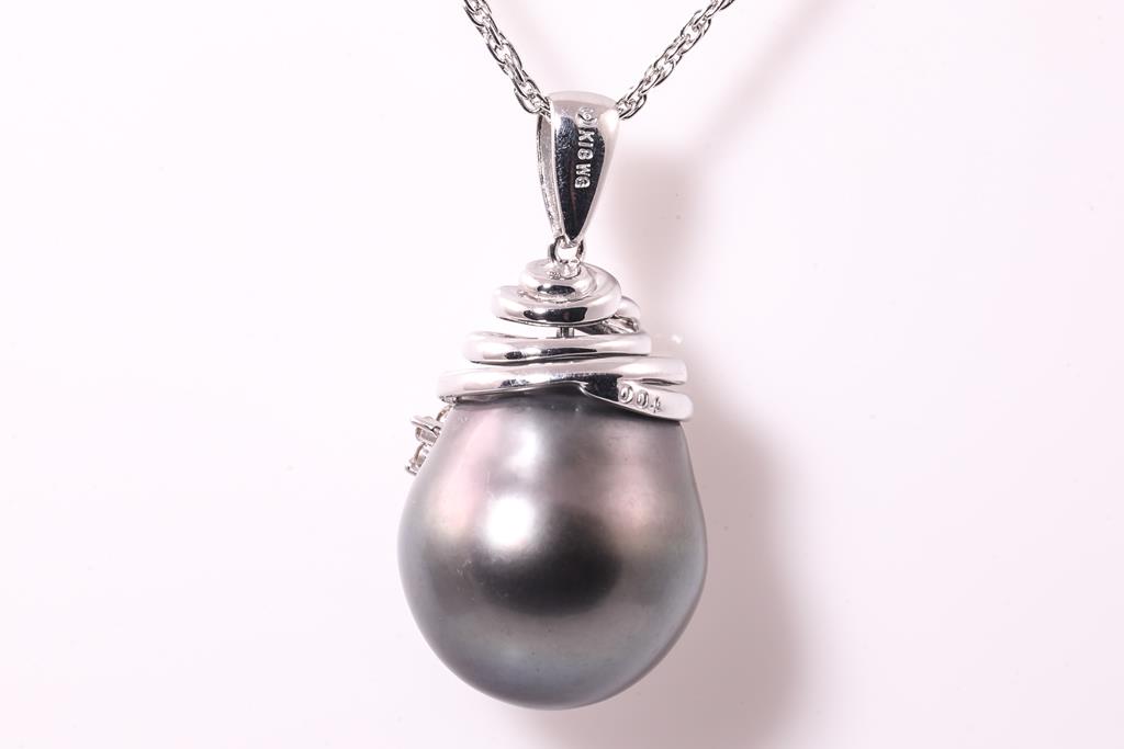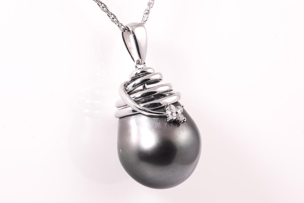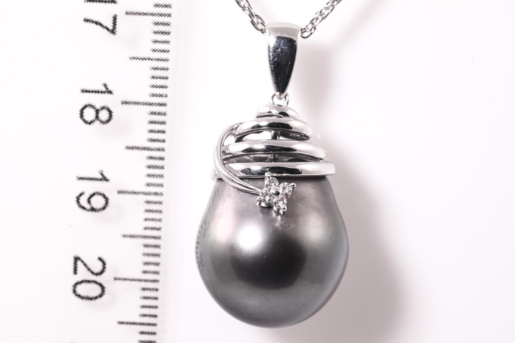 Tasaki Pearl and Diamond pendant with drop shape Tahitian Parl of 16.7mm and round Diamonds totalling 0.04cts. 18ct white gold with 40cm platinum chain. Weight: 14.2g. (Pre-owned)