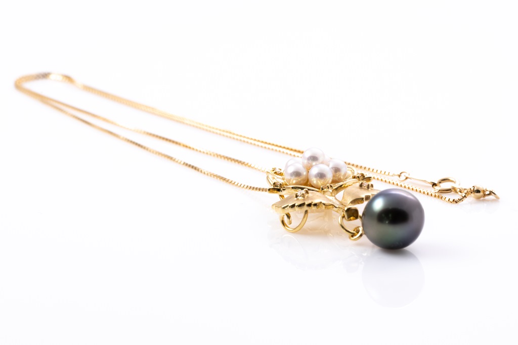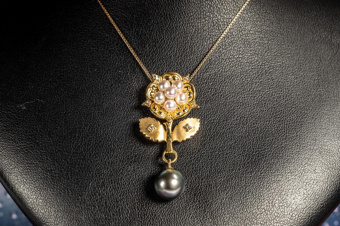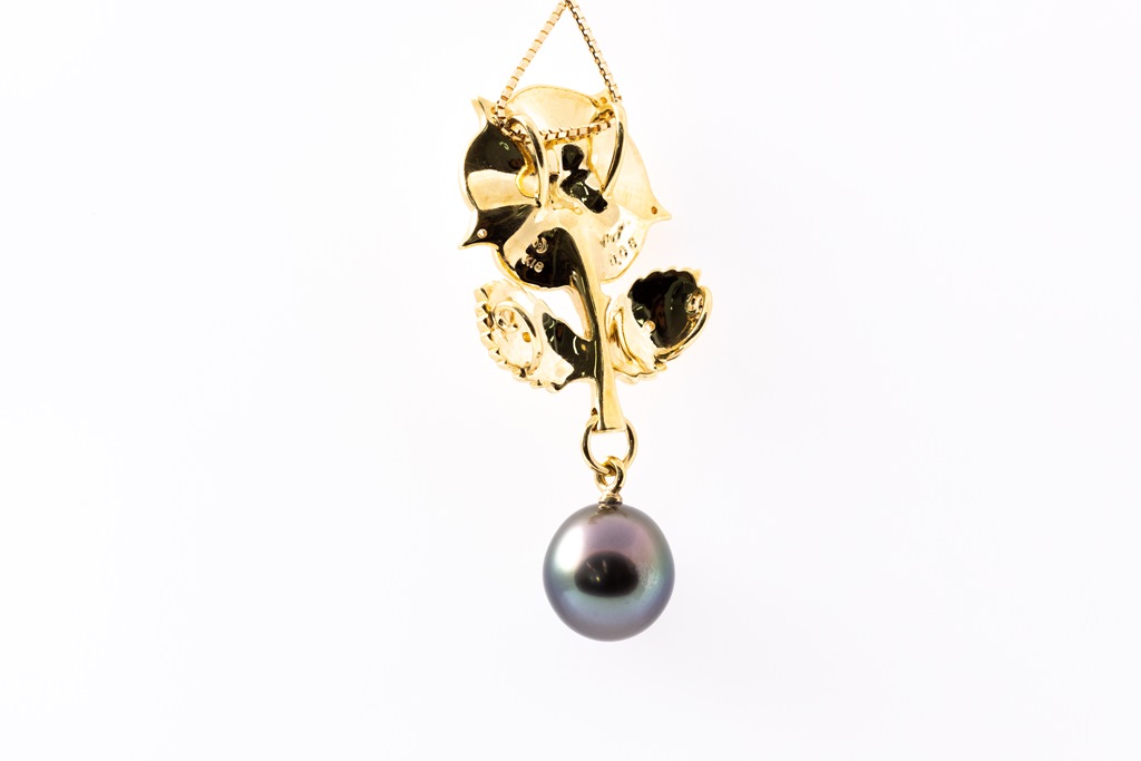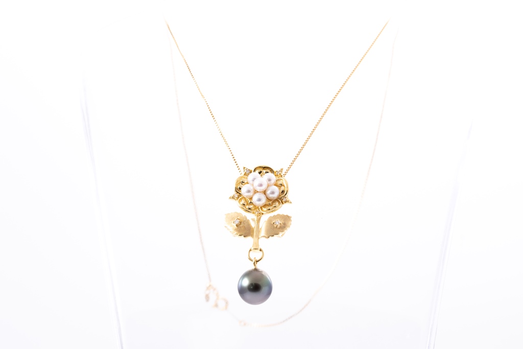 Tasaki Pearl and Diamond Pendant with Tahitian Pearl of 10mm, cultured pearls of 4.5mm and round Diamonds totalling 0.06cts. 18ct yellow gold with 44cm adjustable unbranded 18ct yellow gold chain. Weight: 12.1g. (Pre-owned)