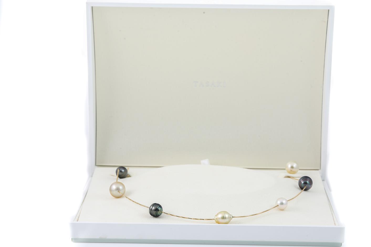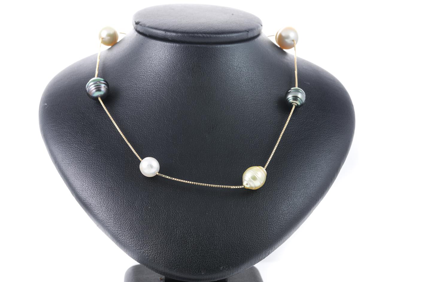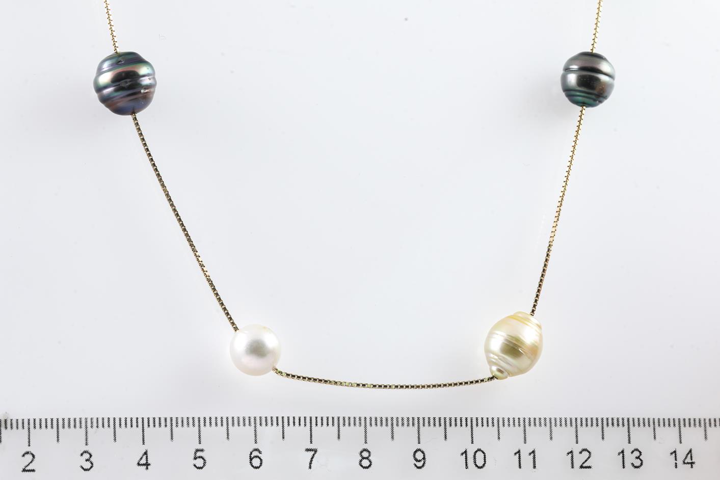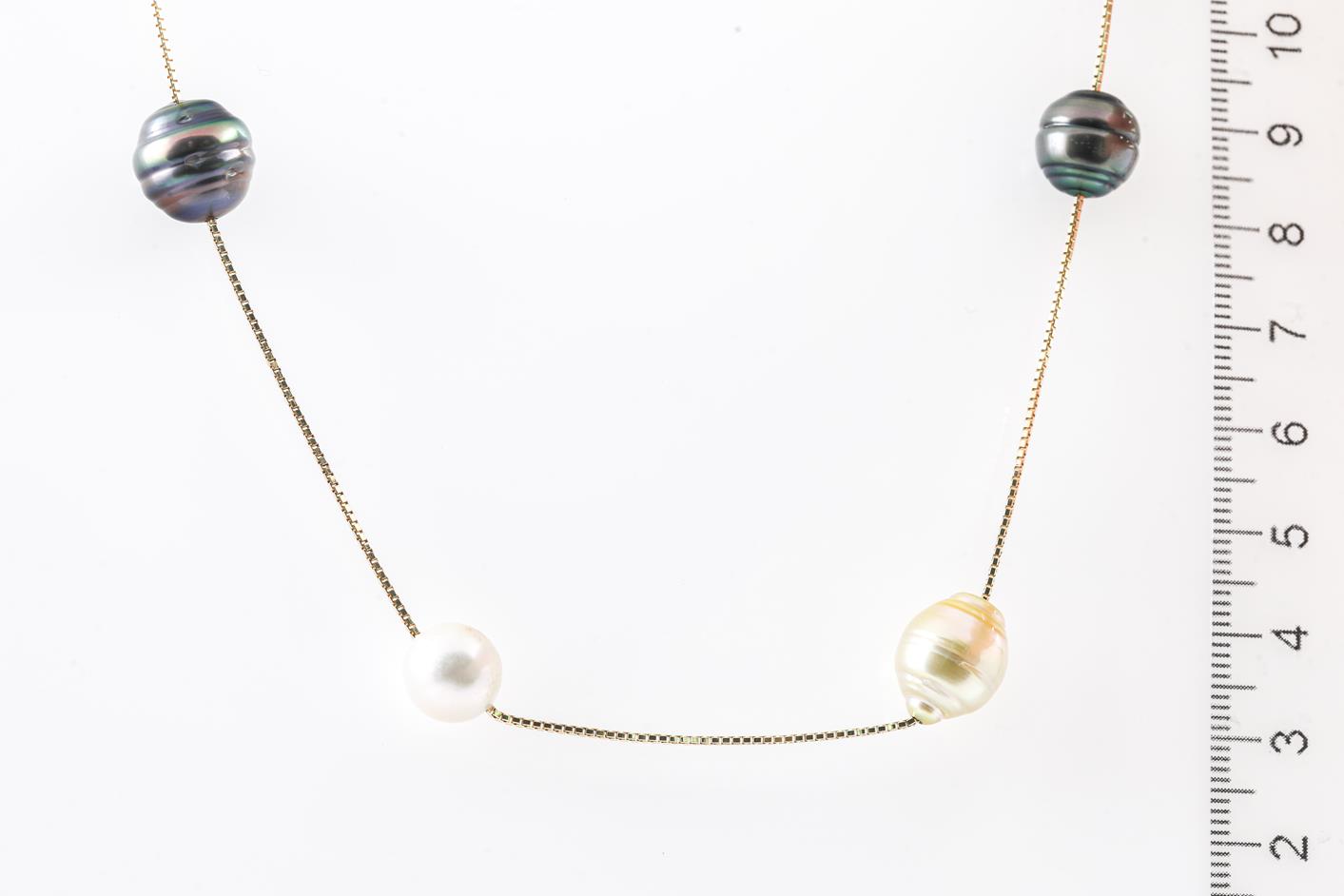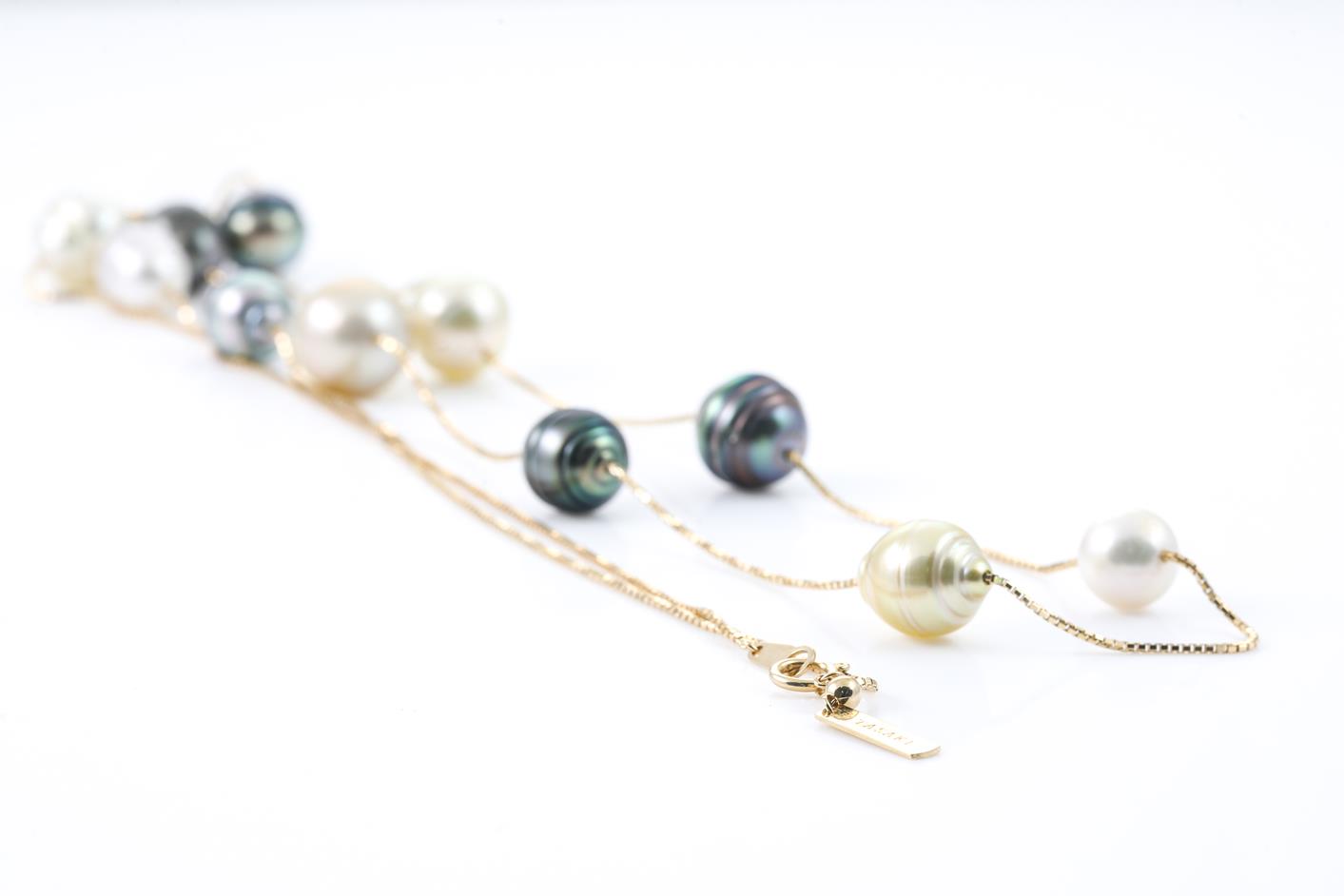 Tasaki pearl station necklace with 11 Tahitian, Golden and South Sea circle pearls of 9.1mm-12.4mm. 18ct yellow gold. Adjustable max length: 80cm (note very minor kink in chain). Weight: 24.4g. With Tasaki box (Pre-owned)