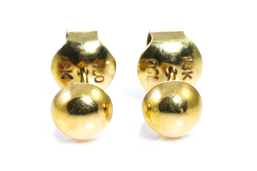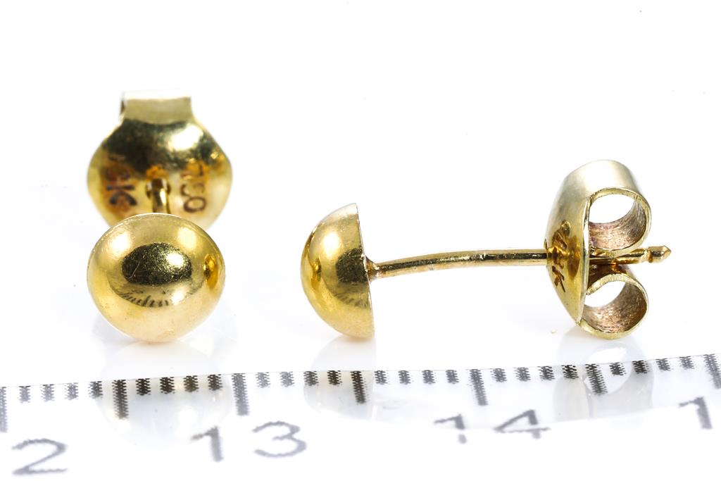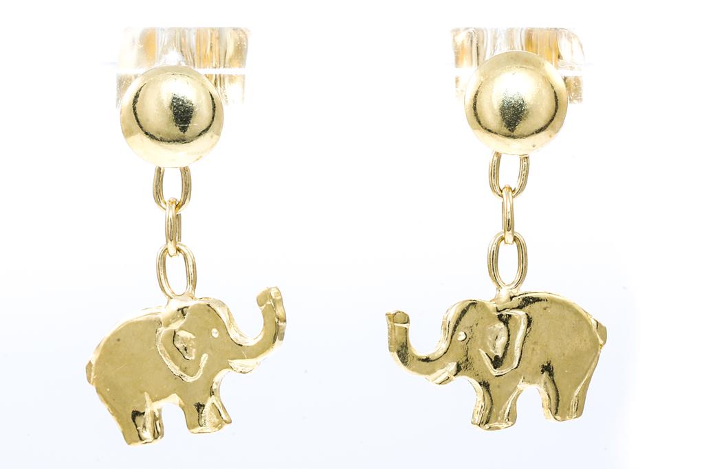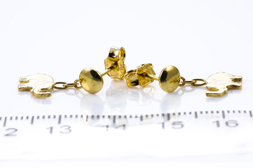 Three Pairs of gold earrings, comprising Elephant drop earrings, half-ball studs and hoops earrings. Diameter of hoops earrings: 2.3cm. 18ct yellow gold. Weight combined 5.6g. (Pre-owned)