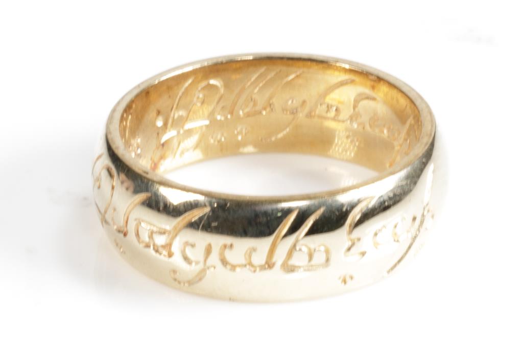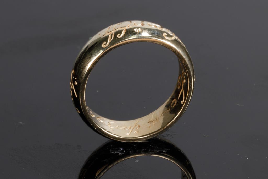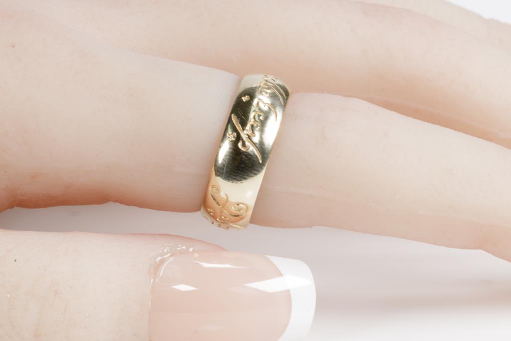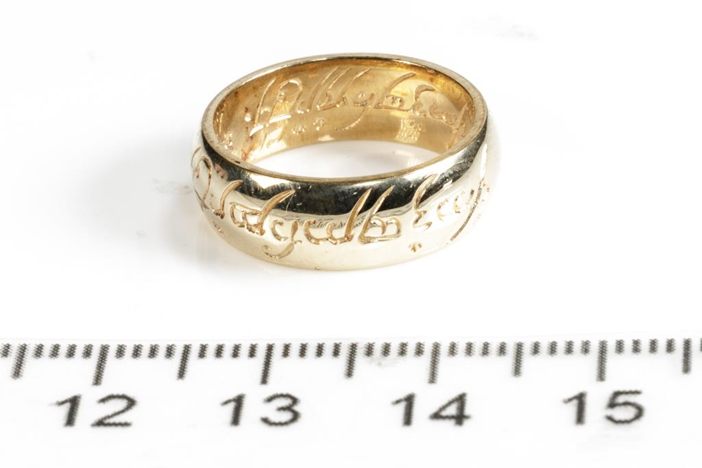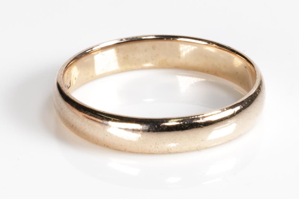 Three wedding rings with two plain bands and one with engravings. Tow rings with 9ct yellow and one ring with rose gold. Ring size I 1/2, J 1/2, Q 1/2. Combined weight 11.1g. (Pre-owned)