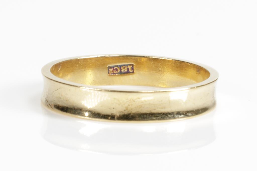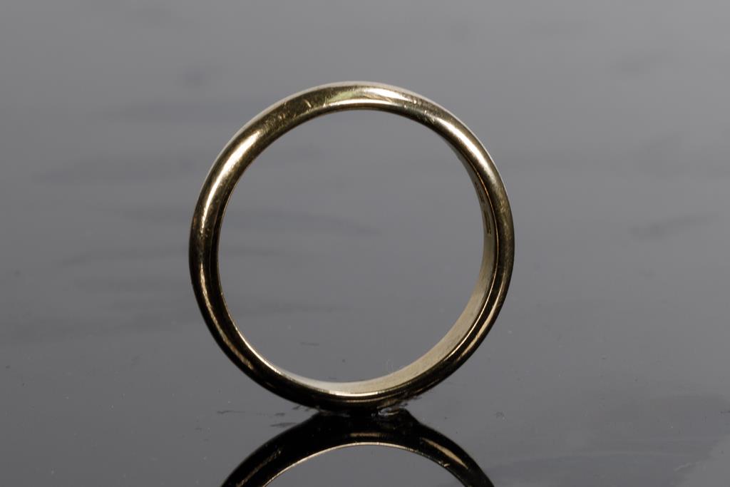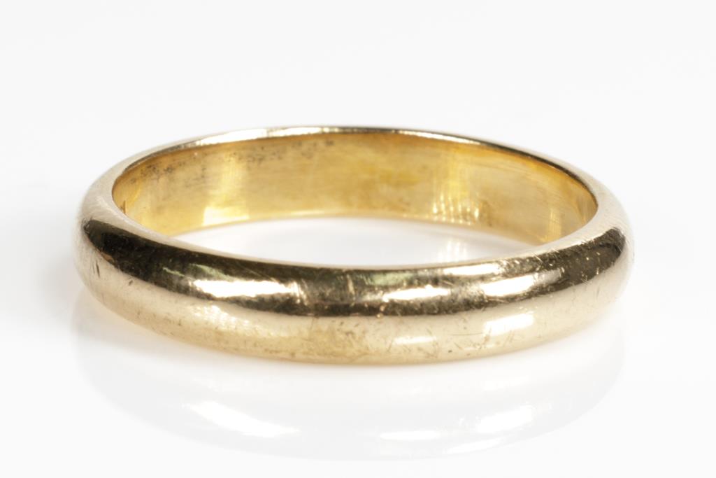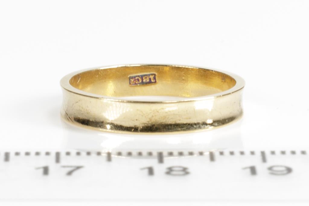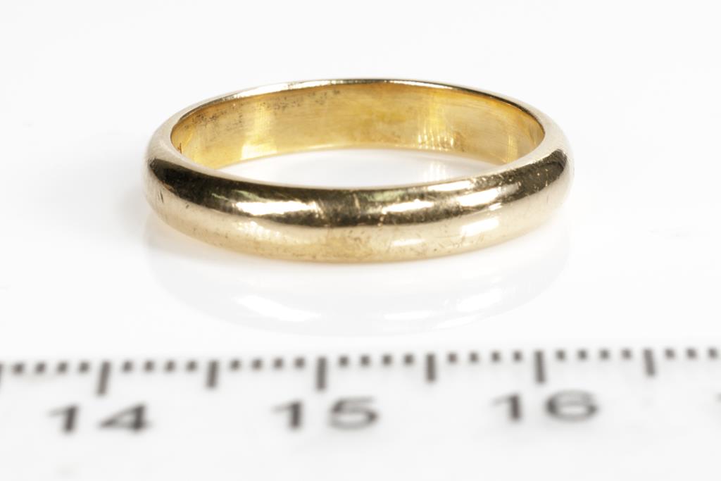 Three Wedding Rings. Plain design. 18ct yellow gold. Ring sizes K 1/2, L, Q 1/2. Combined weight 10.6g. (Pre-owned)