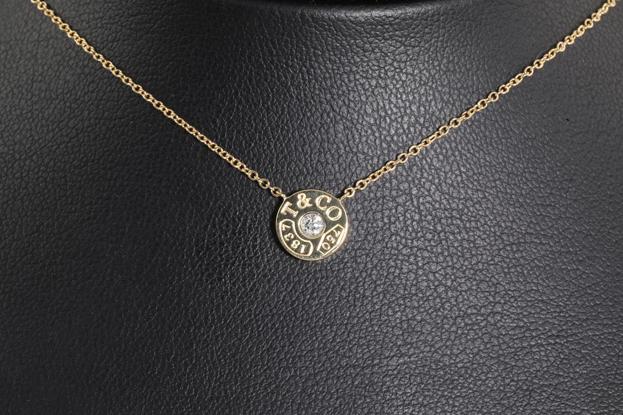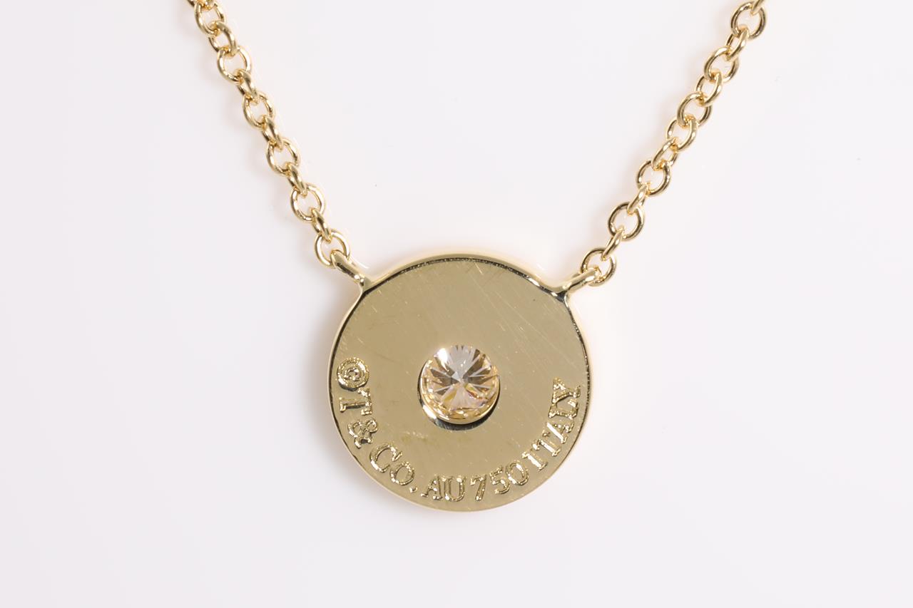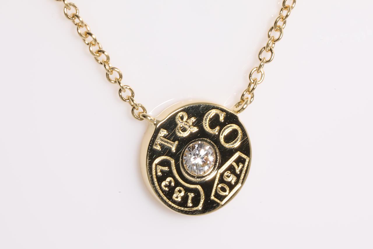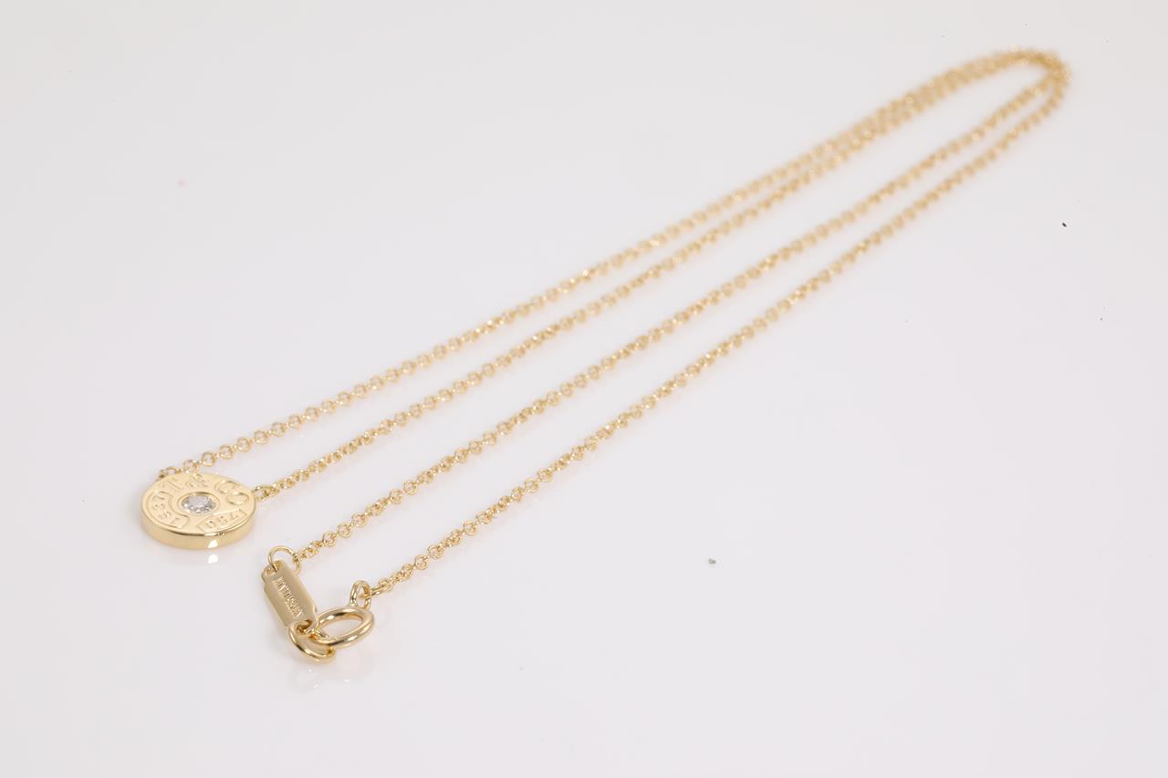 Tiffany & Co 1837 Circle Diamond pendant with a round Diamond of approximately 0.04ct. 18ct yellow gold with attached chain. Length 41cm. Weight: 2.4g (Pre-owned)