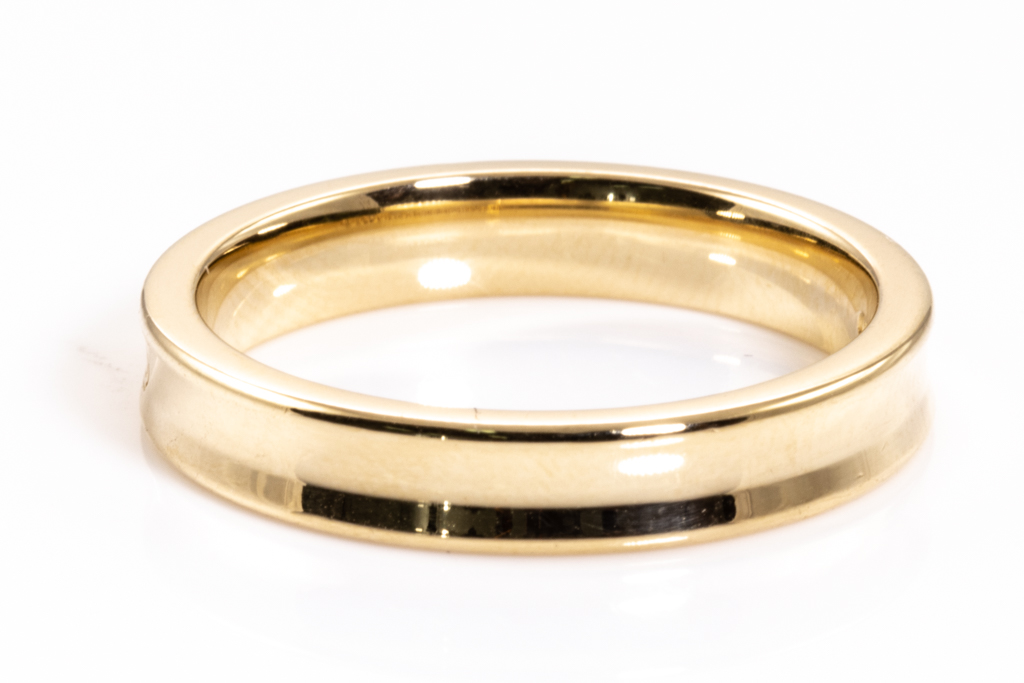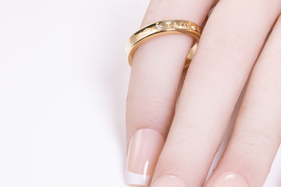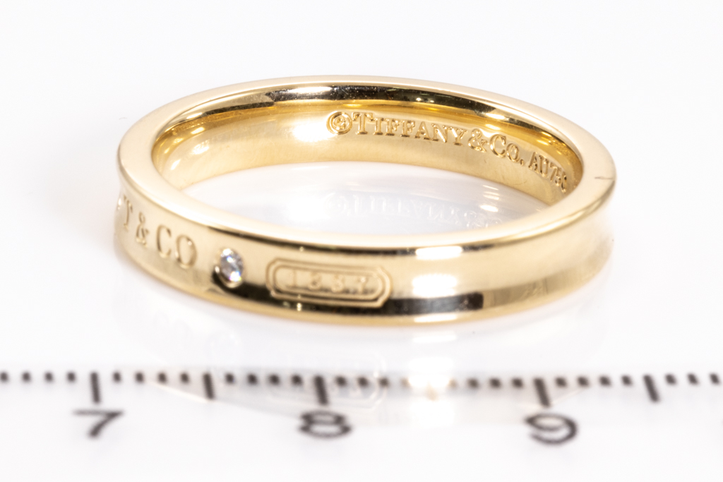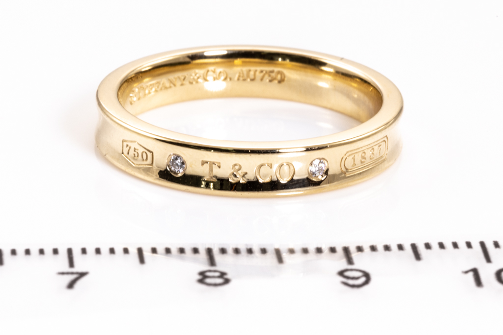 Tiffany & Co 1837 narrow mens ring with 2 round Diamonds totalling approxmately 0.02cts. 18ct yellow gold. Ring size T – ring resizing not recommended. Width 4mm. Weight: 7.6g. (Pre-owned)