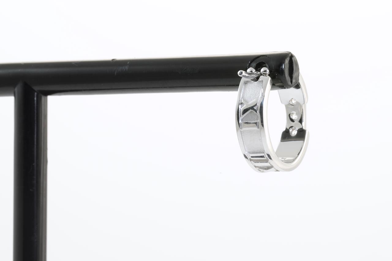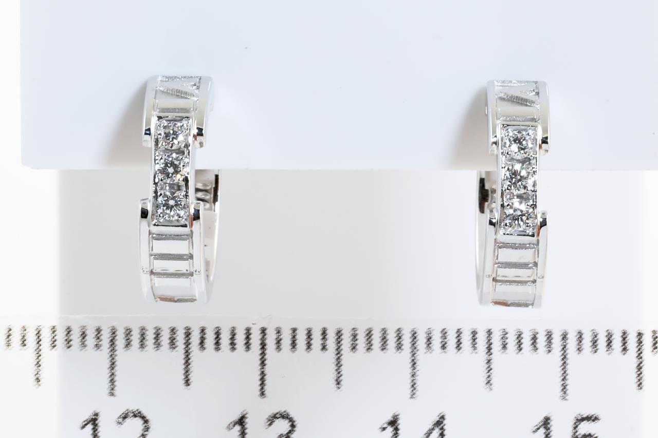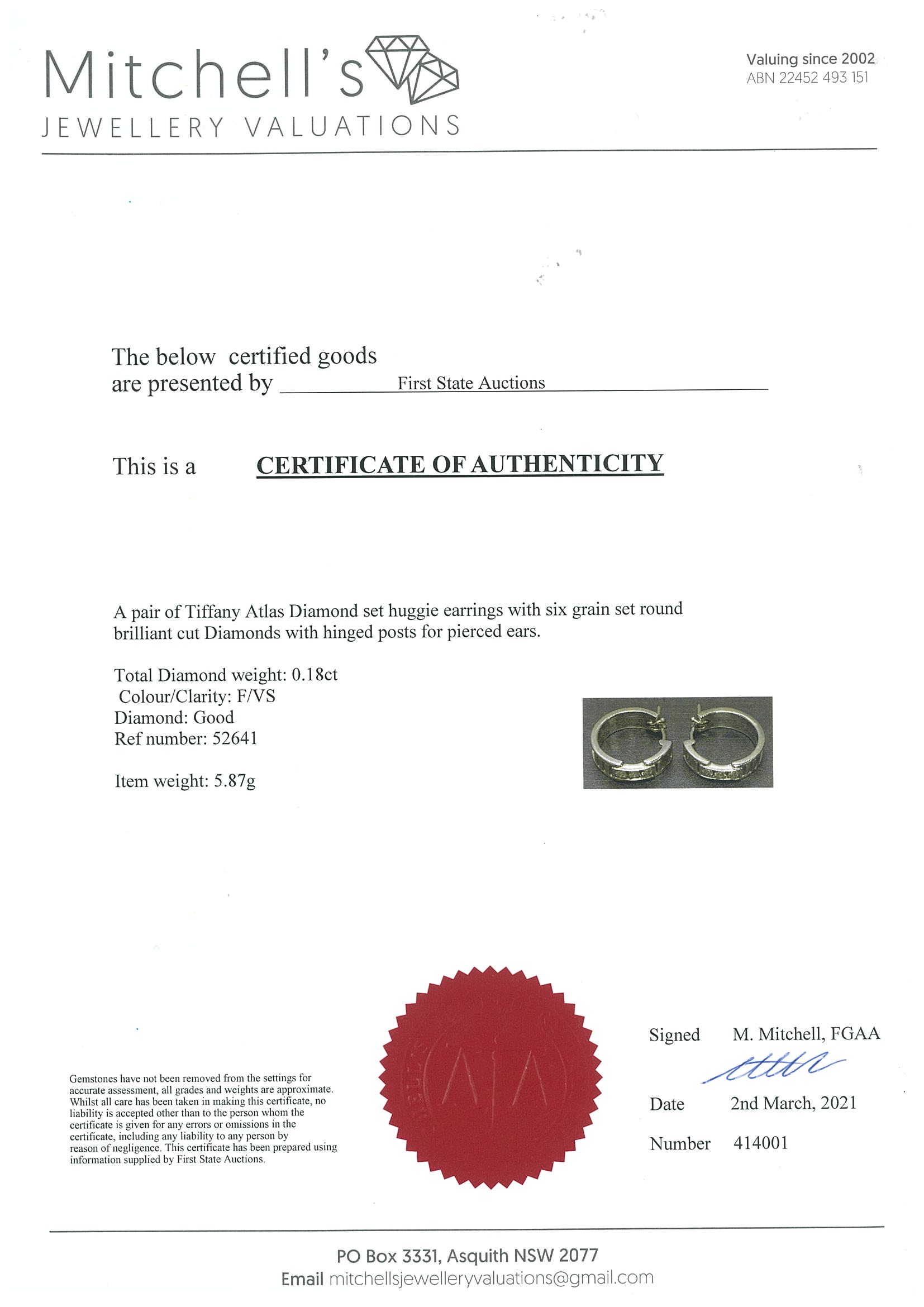 Tiffany & Co Atlas Huggie Diamond Earrings with round Diamonds totalling approximately 0.18cts. 18ct white gold. With certificate #414001. Weight: 5.8g (Pre-owned)