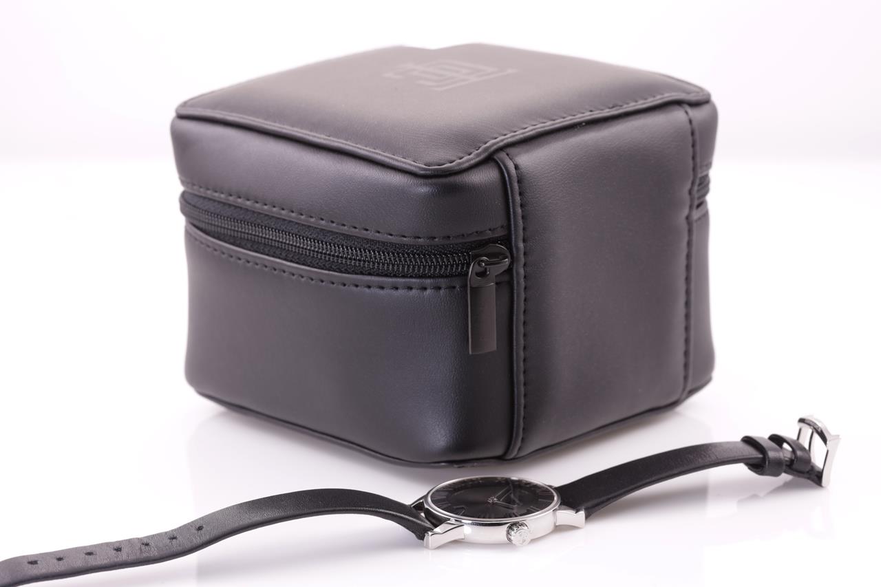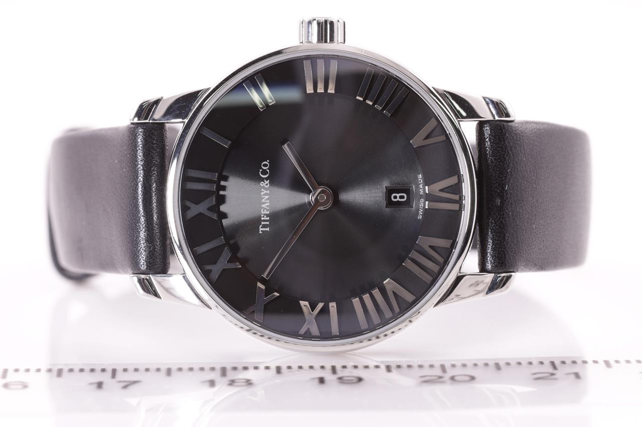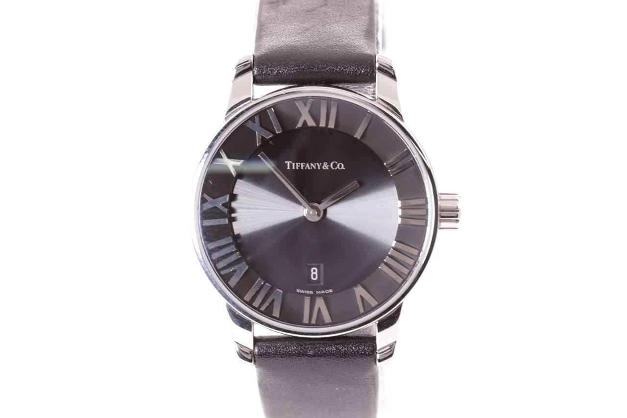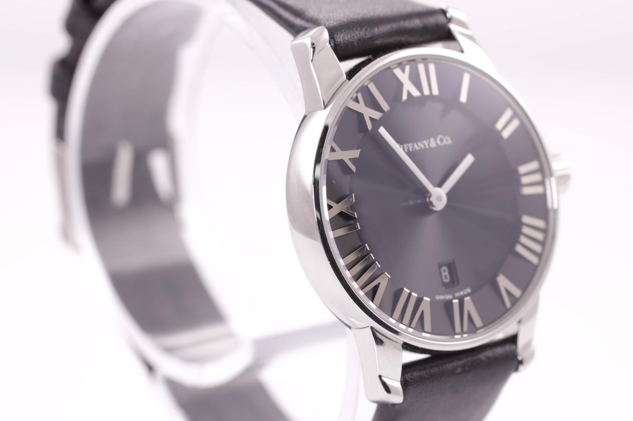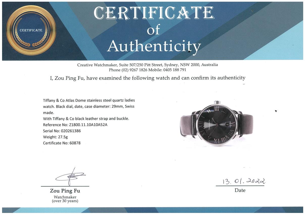 Tiffany & Co Atlas Dome stainless steel quartz ladies watch. Black dial, date, case diameter: 29mm, length: 18cm, Swiss made. Ref# Z1800.11.10A10A52A. With Tiffany & Co black leather strap and buckle. With Certificate of Authenticity and Tiffany & Co case. 3 month FSA warranty. (Pre-owned)