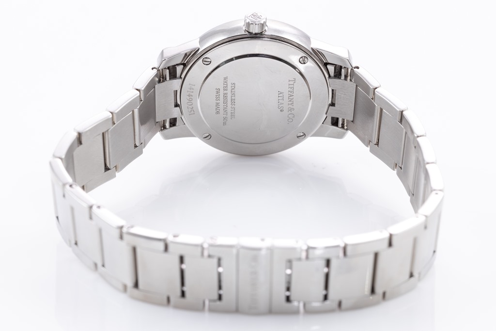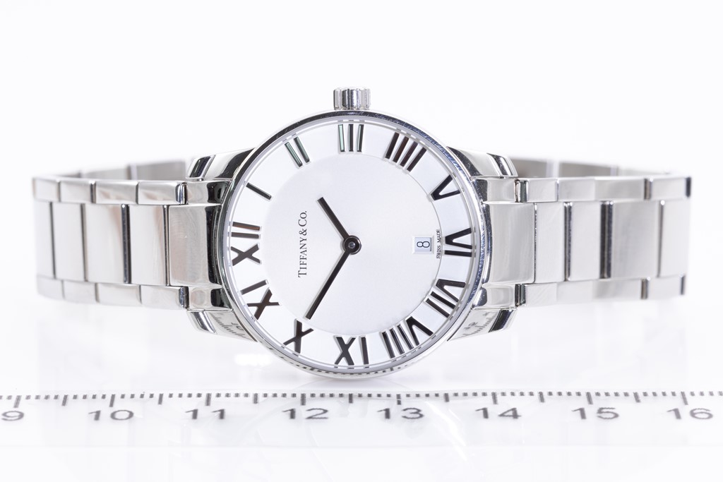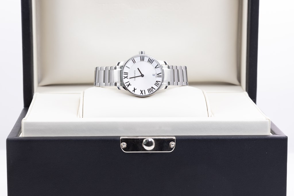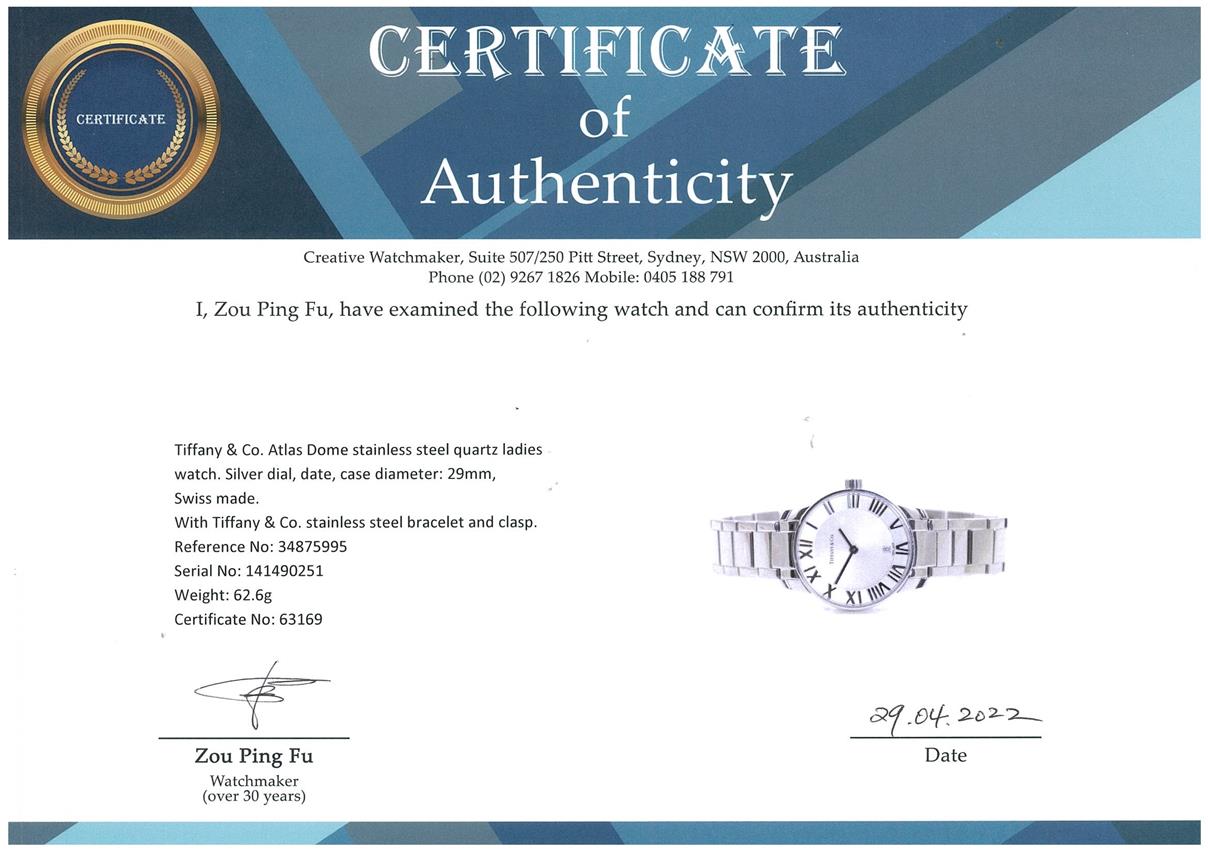 Tiffany & Co. Atlas Dome stainless steel quartz ladies watch. Silver dial, date, case diameter: 29mm, wrist size: 17.5cm, Swiss made. Ref #34875995. With Tiffany & Co. stainless steel bracelet and clasp. With Certificate of Authenticity, Tiffany & Co. International and Limited Warranty Card dated 22/1/2021 and Tiffany & Co. box. 3 month FSA warranty. (Pre-owned)