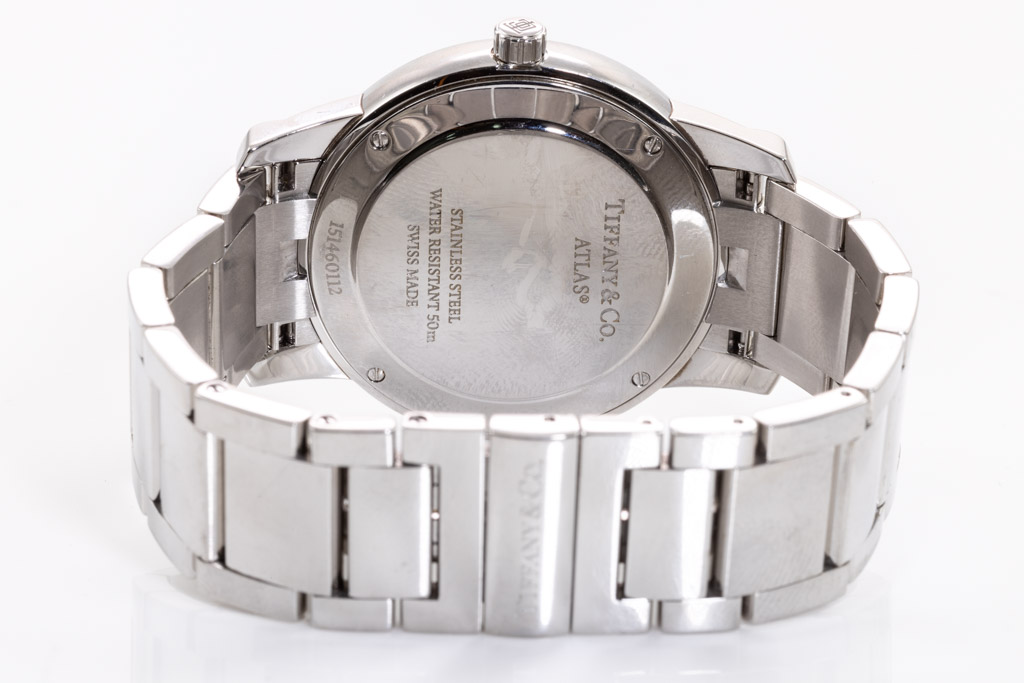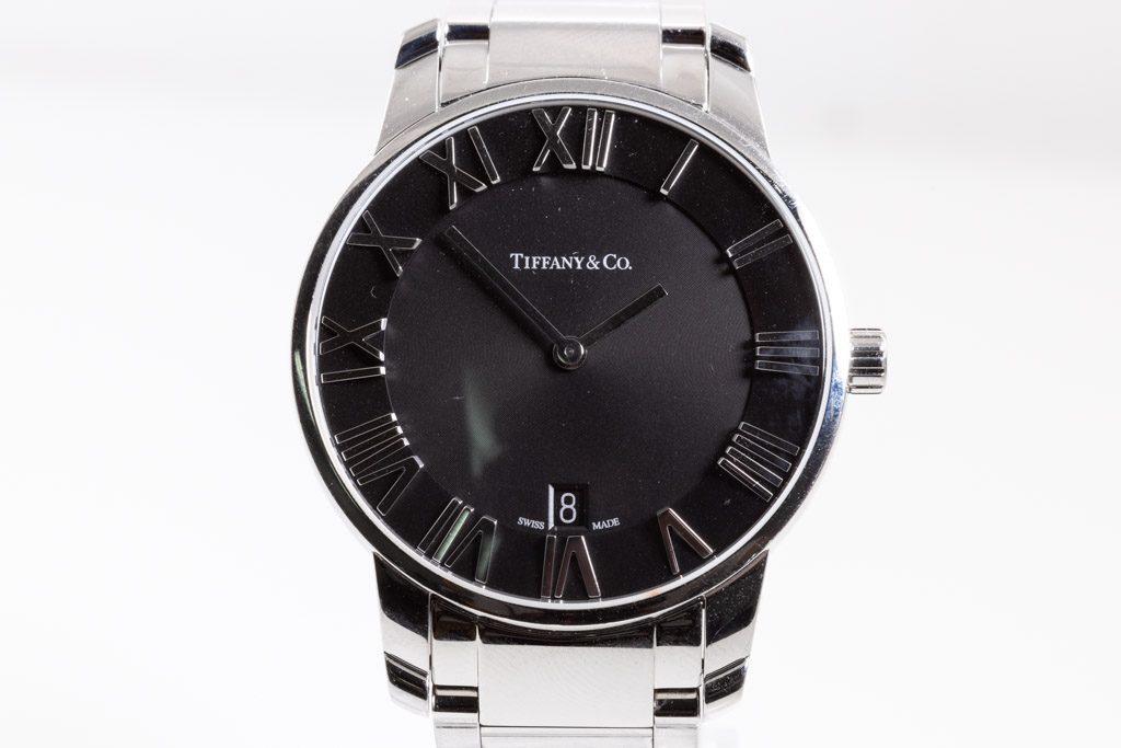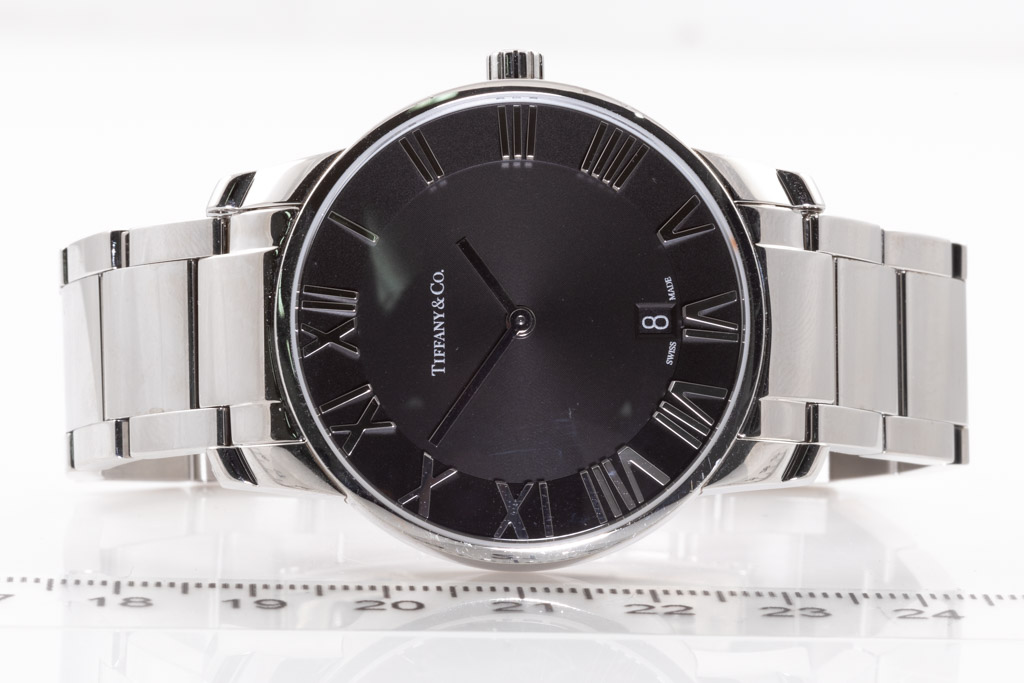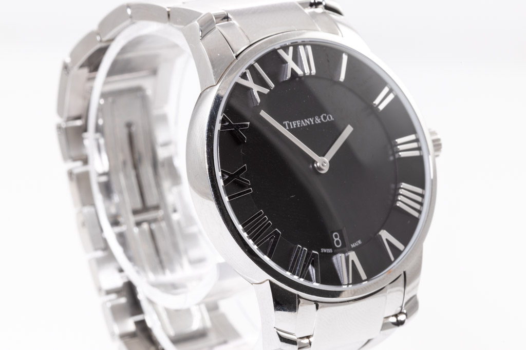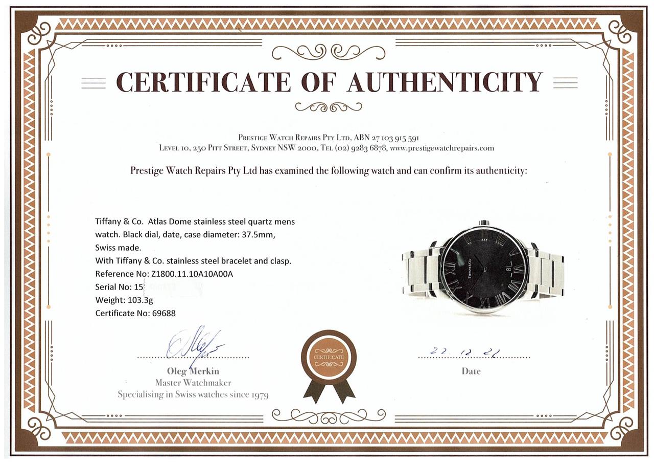 Tiffany & Co. Atlas Dome stainless steel quartz mens watch. Black dial, date, case diameter: 37.5mm, wrist size: 15.5cm, Swiss made. Ref# Z1800.11.10A10A00A. With Tiffany & Co. stainless steel bracelet and clasp. With Certificate of Authenticity. 3 month FSA warranty. (Pre-owned)