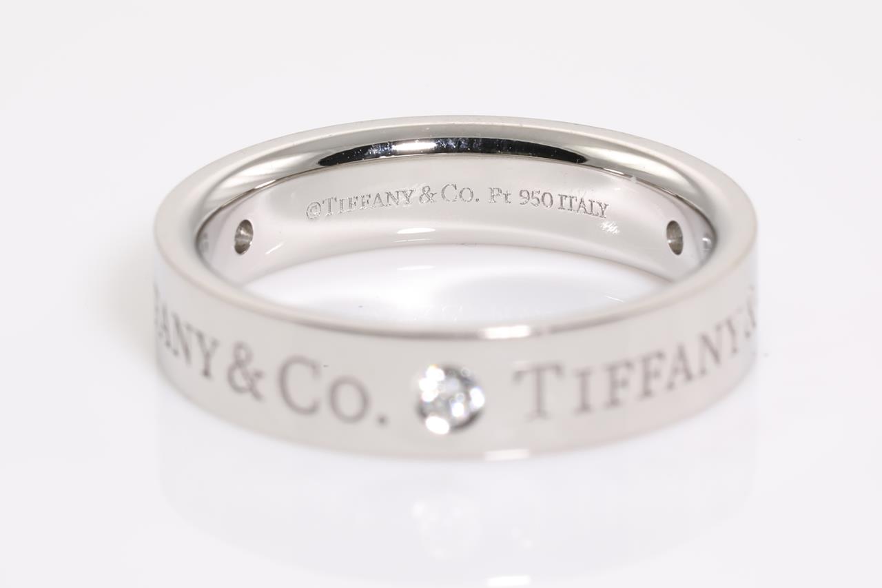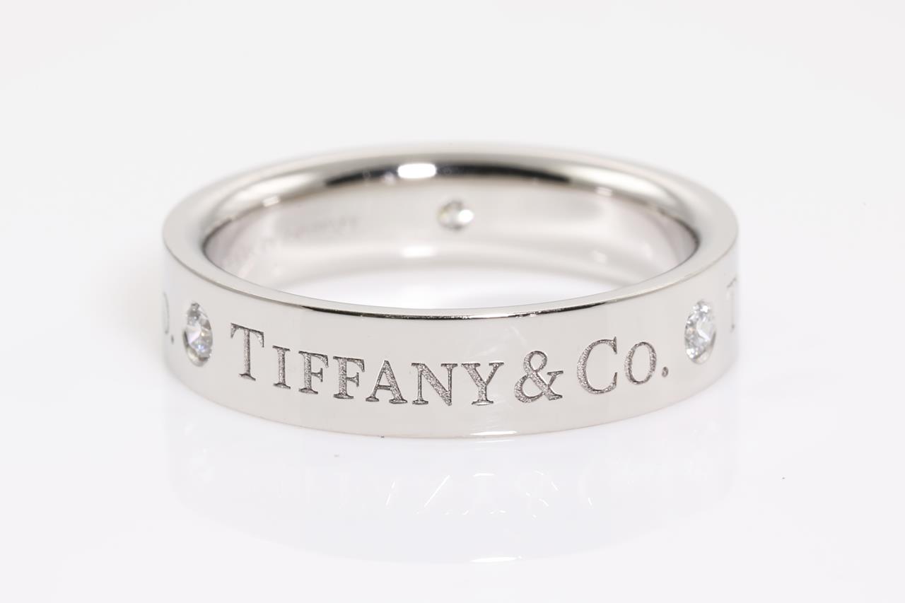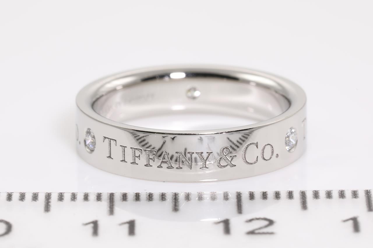 Tiffany & Co Band ring with 3 Diamonds totalling 0.15cts. Width 4mm. Platinum. Ring size I1/2 - ring resizing is not recommended. Made in Italy. Weight: 6.4g. With Tiffany & Co box. (Pre-owned)