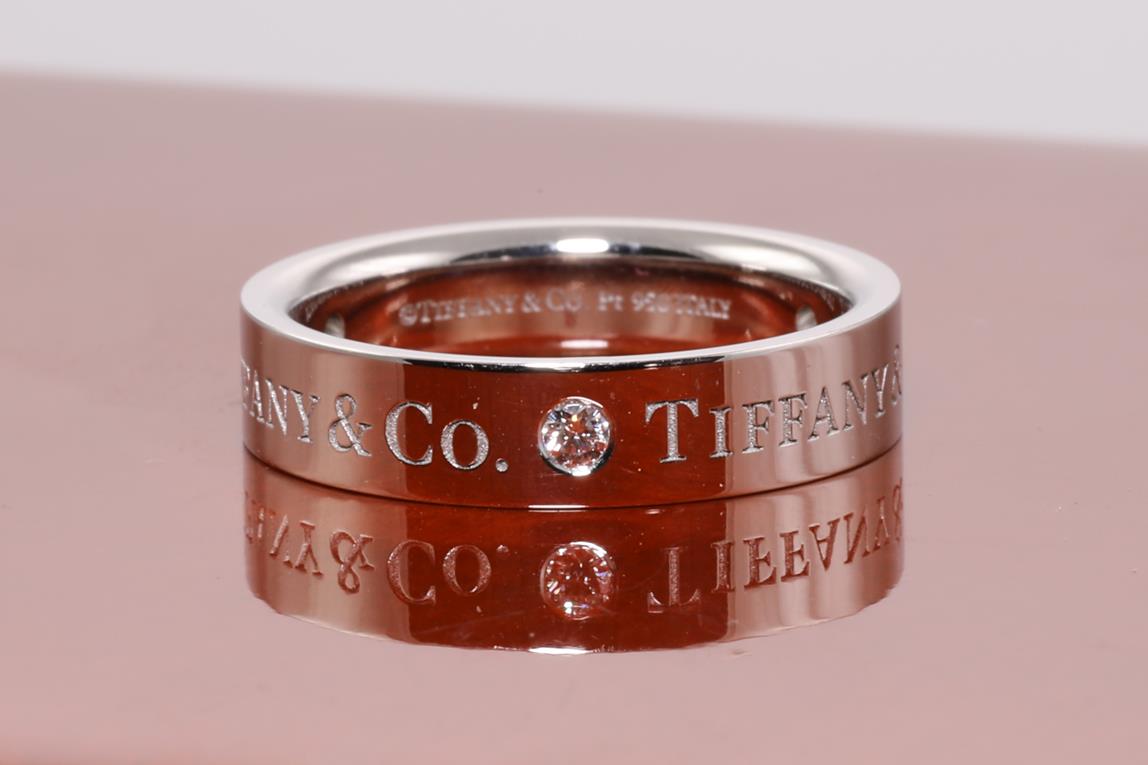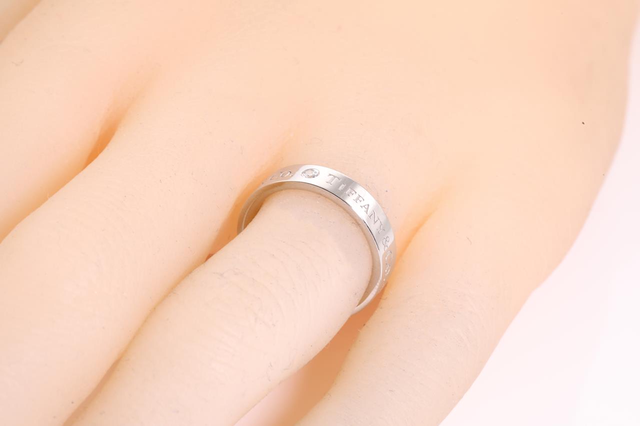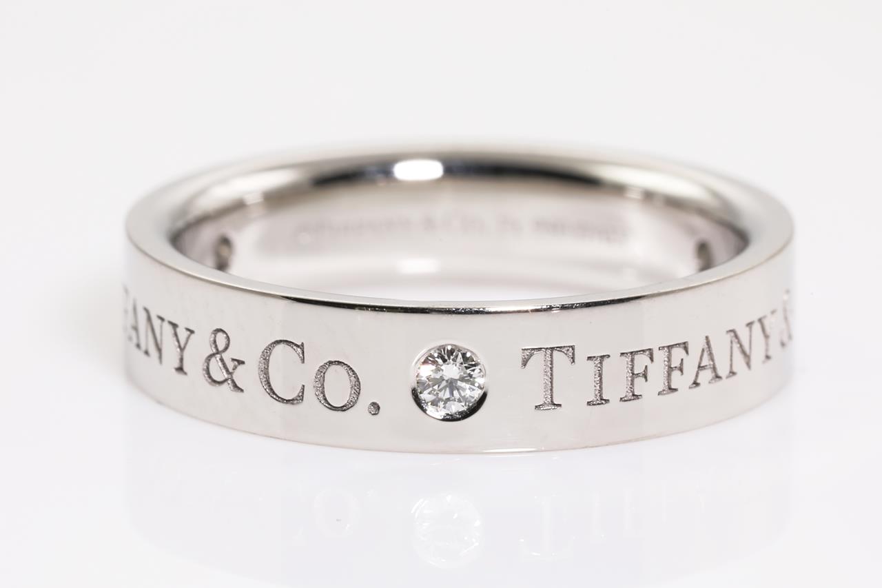 Tiffany & Co Band ring with 3 Diamonds totalling 0.15cts. Width 4mm. Platinum. Ring size I1/2 - ring resizing is not recommended. Made in Italy. Weight: 6.4g. With Tiffany & Co box. (Pre-owned)