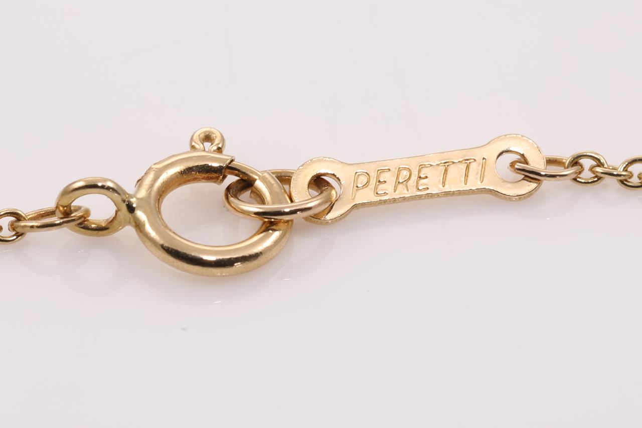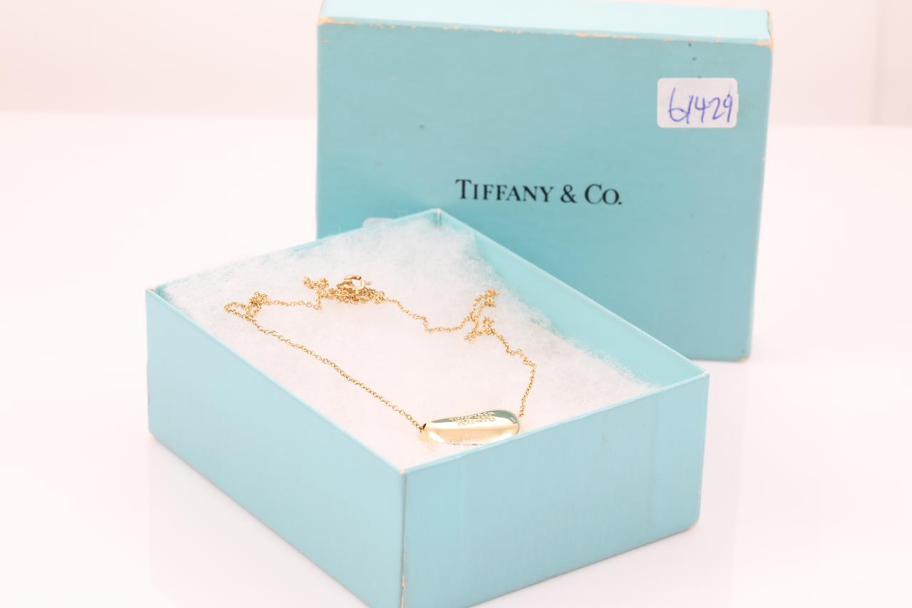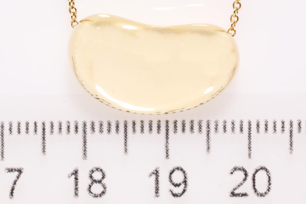 Tiffany & Co Elsa Peretti Bean design pendant. 18ct yellow gold with attached chain. Length: 42cm. 18mm wide. With worn Tiffany & Co box. Weight: 7.8g. (Pre-owned)