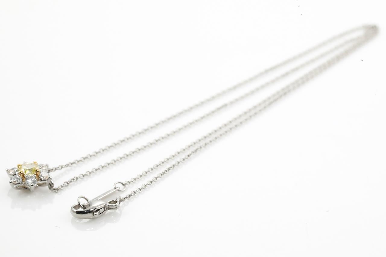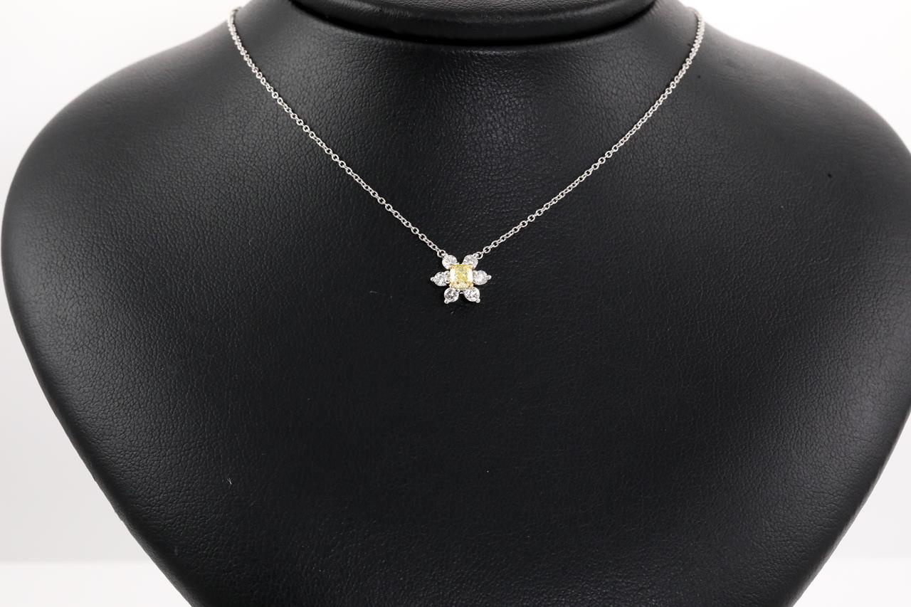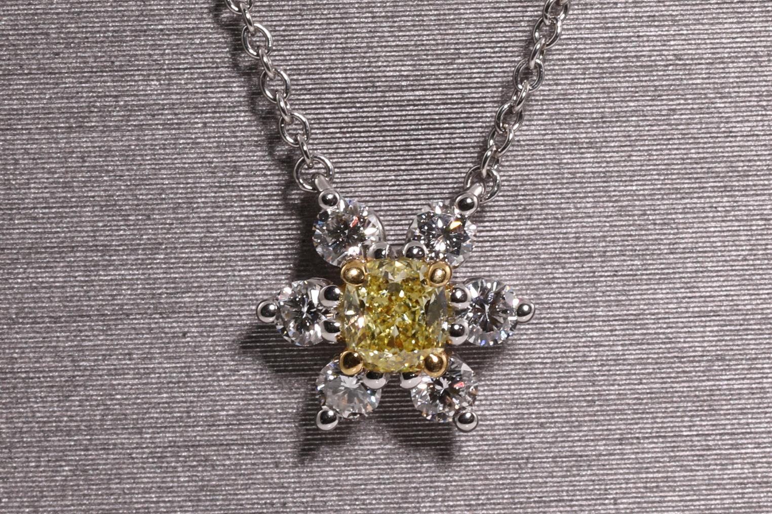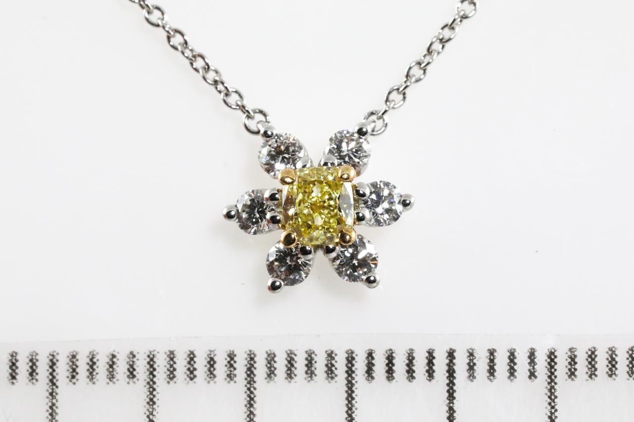 Tiffany & Co Buttercup pendant with a centre cushion cut yellow Diamond of approximately 0.25ct (estimated grading: fancy yellow SI) and 6 round Diamonds totalling approximately 0.25cts (estimated grading: F VS). Platinum & 18ct yellow gold with attached platinum chain. Length: 41cm. Weight: 3.3g. With certificate #414724. With Tiffany & Co box. (Pre-owned)