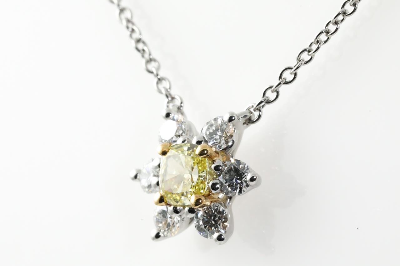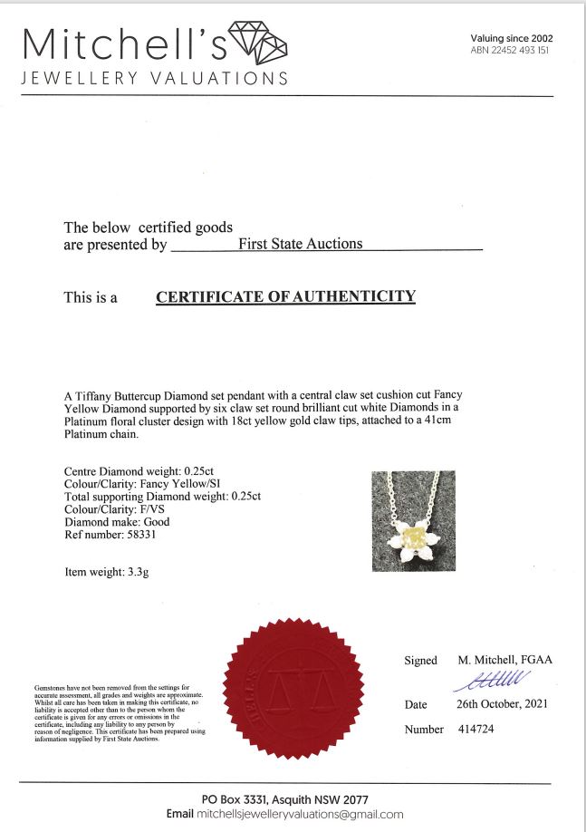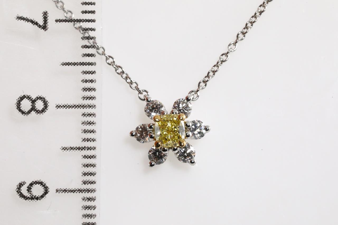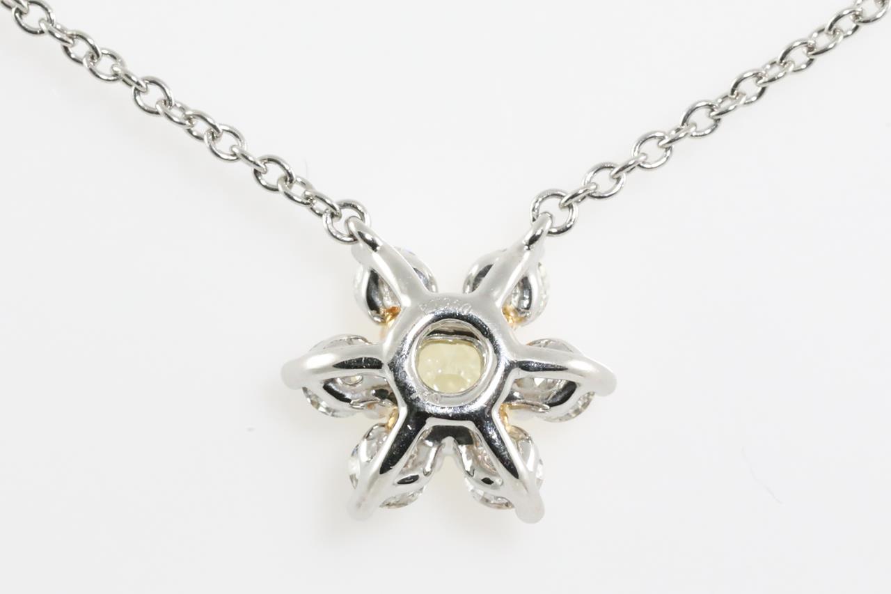 Tiffany & Co Buttercup pendant with a centre cushion cut yellow Diamond of approximately 0.25ct (estimated grading: fancy yellow SI) and 6 round Diamonds totalling approximately 0.25cts (estimated grading: F VS). Platinum & 18ct yellow gold with attached platinum chain. Length: 41cm. Weight: 3.3g. With certificate #414724. With Tiffany & Co box. (Pre-owned)
