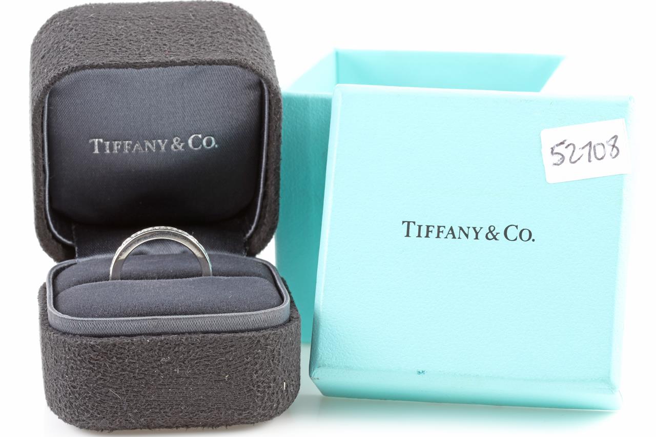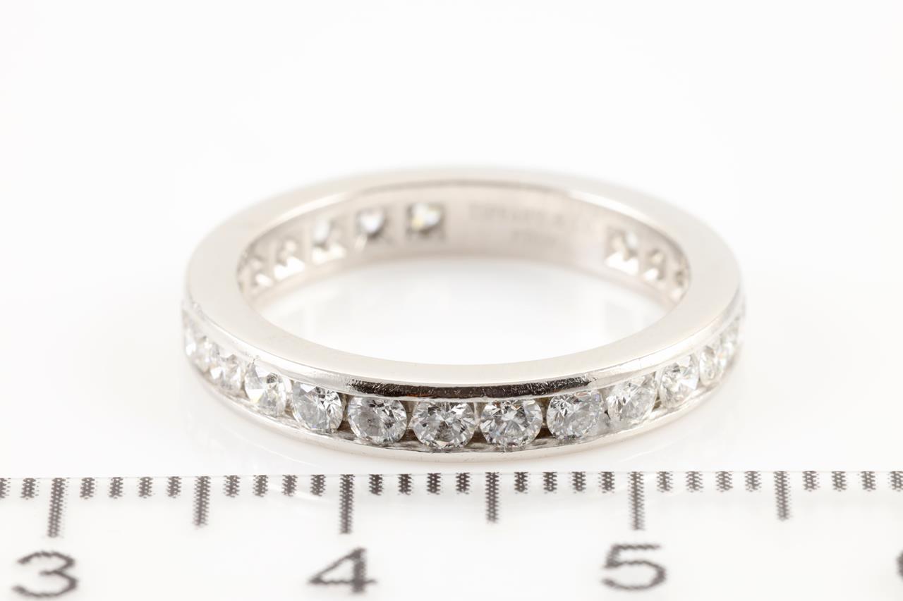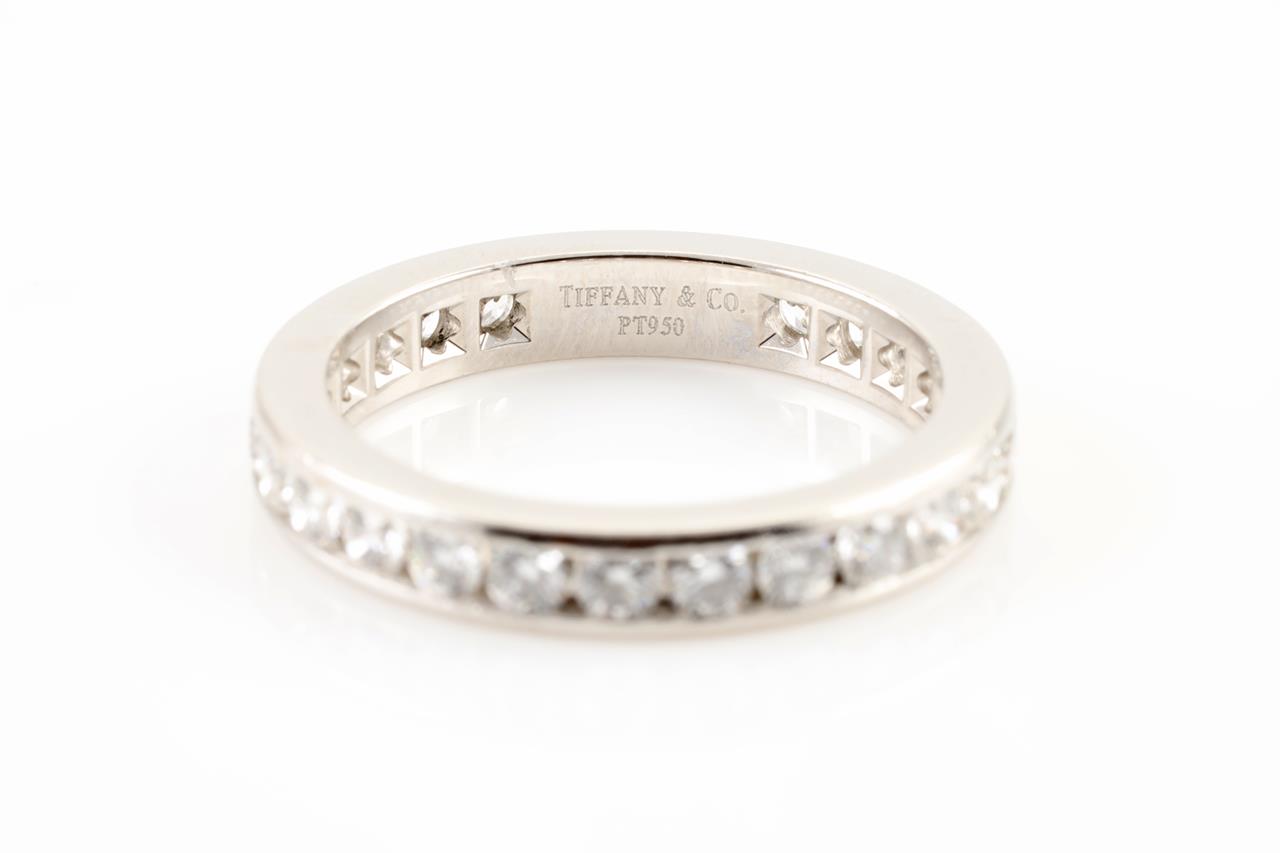 Tiffany & Co Channel Setting full hoop ring with round Diamonds totalling approximately 1.20cts (Estimated grading: F VS). Platinum. Ring size K. Note it is not recommended to resize this ring. With Certificate #413994 & Tiffany & Co box. Weight: 4.7g (Pre-owned)