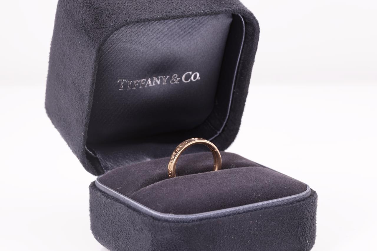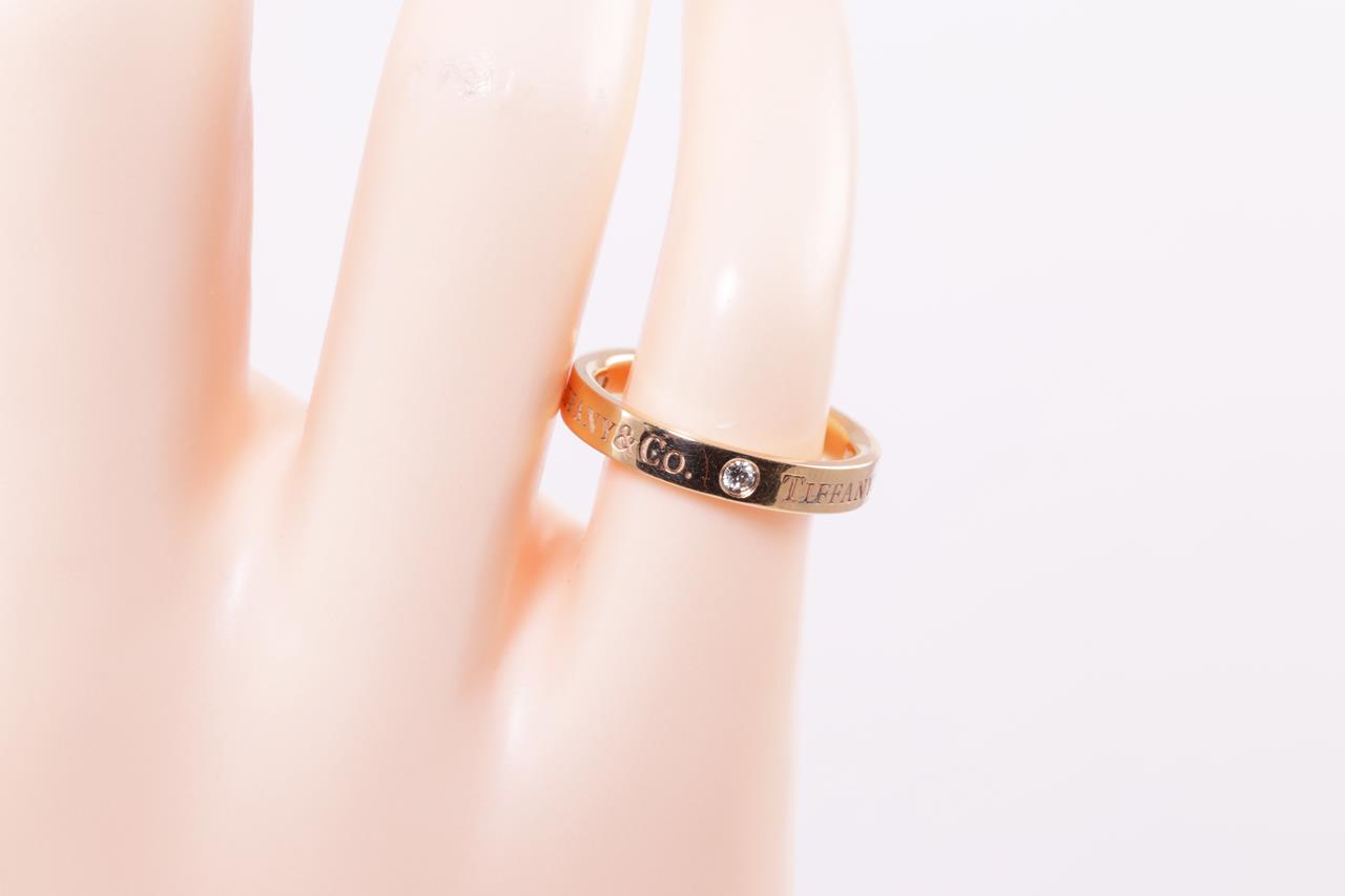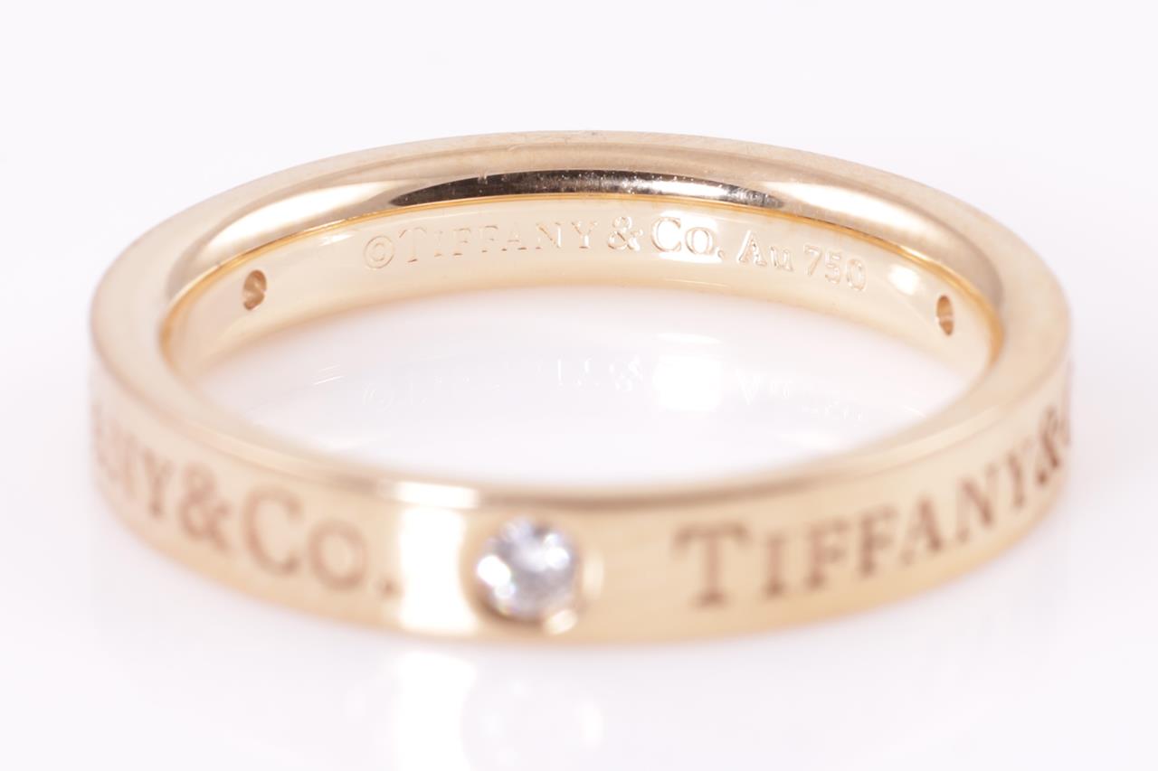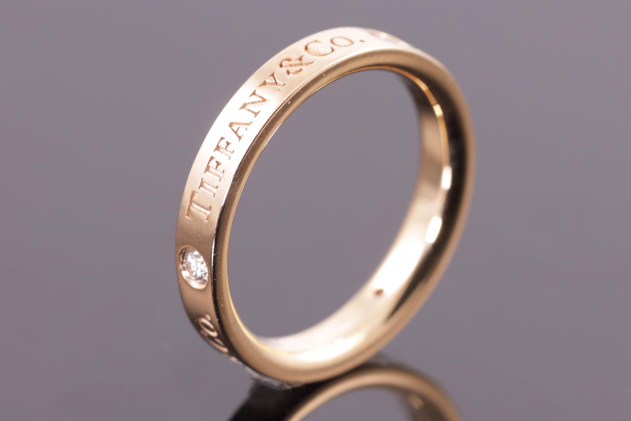 Tiffany & Co band ring with 3 round Diamonds totalling 0.07cts. 18ct rose gold. Width 3mm. Ring size: H1/2 - ring resizing is not recommended. Weight: 3.4g. With Tiffany & Co box. (Pre-owned)