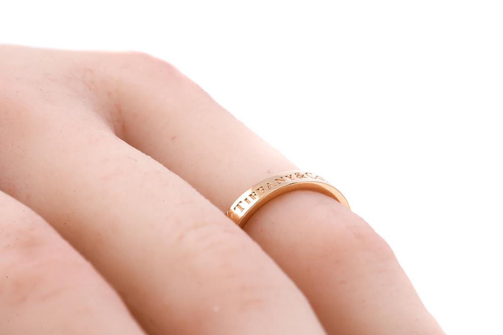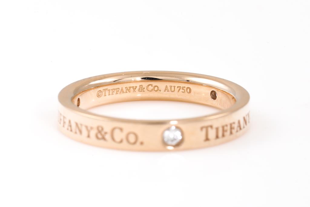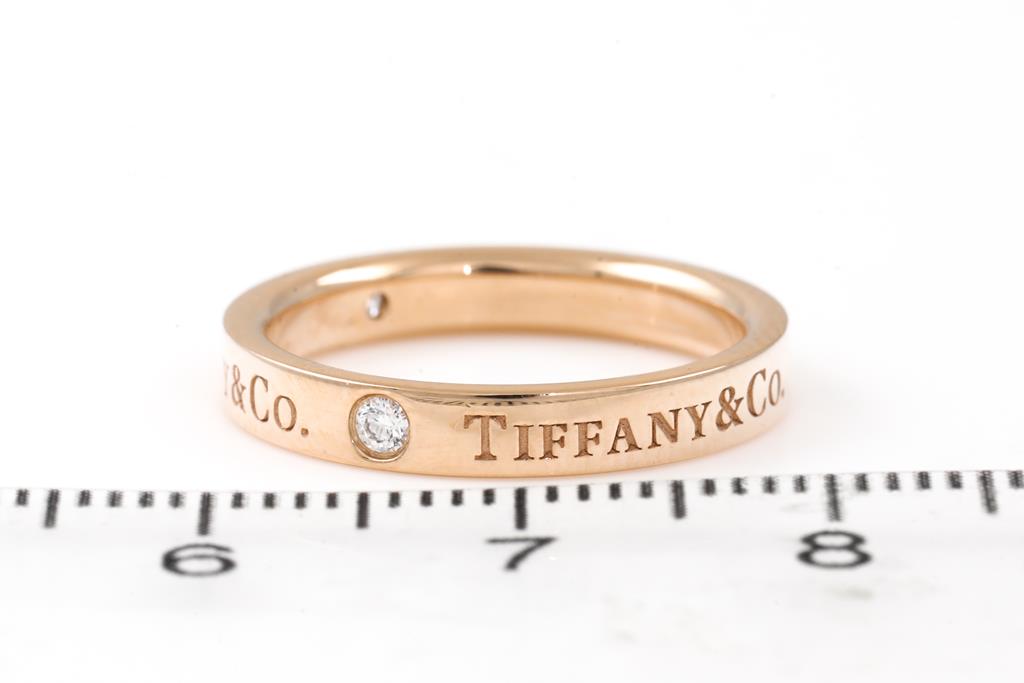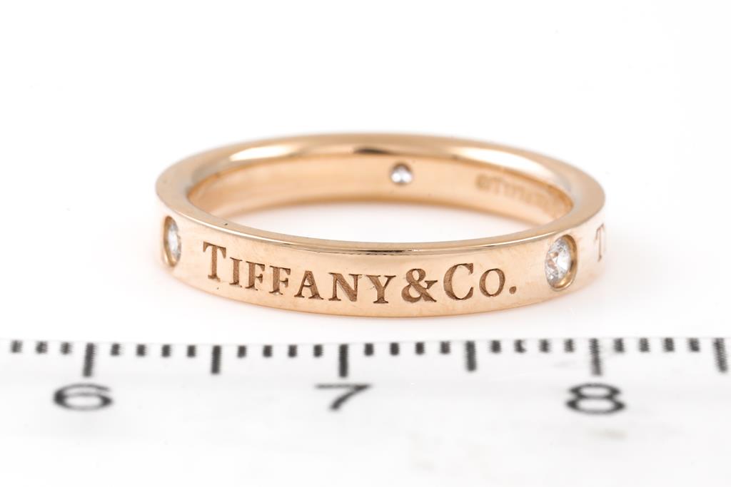 Tiffany & Co band ring with 3 round Diamonds totalling 0.07cts. 18ct rose gold. Width 3mm. Ring size: J1/2 - ring resizing is not recommended. Weight: 3.7g. (Pre-owned)