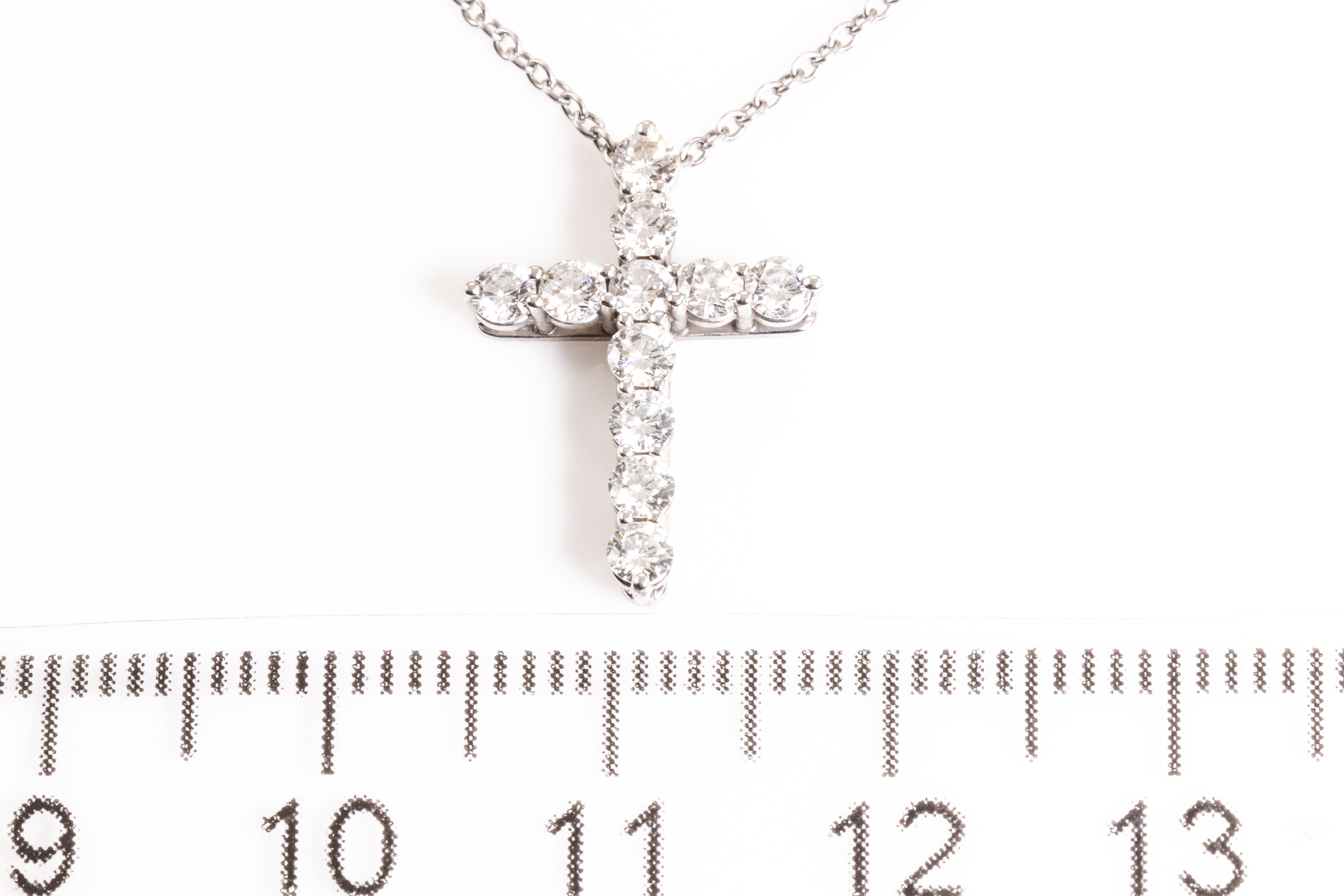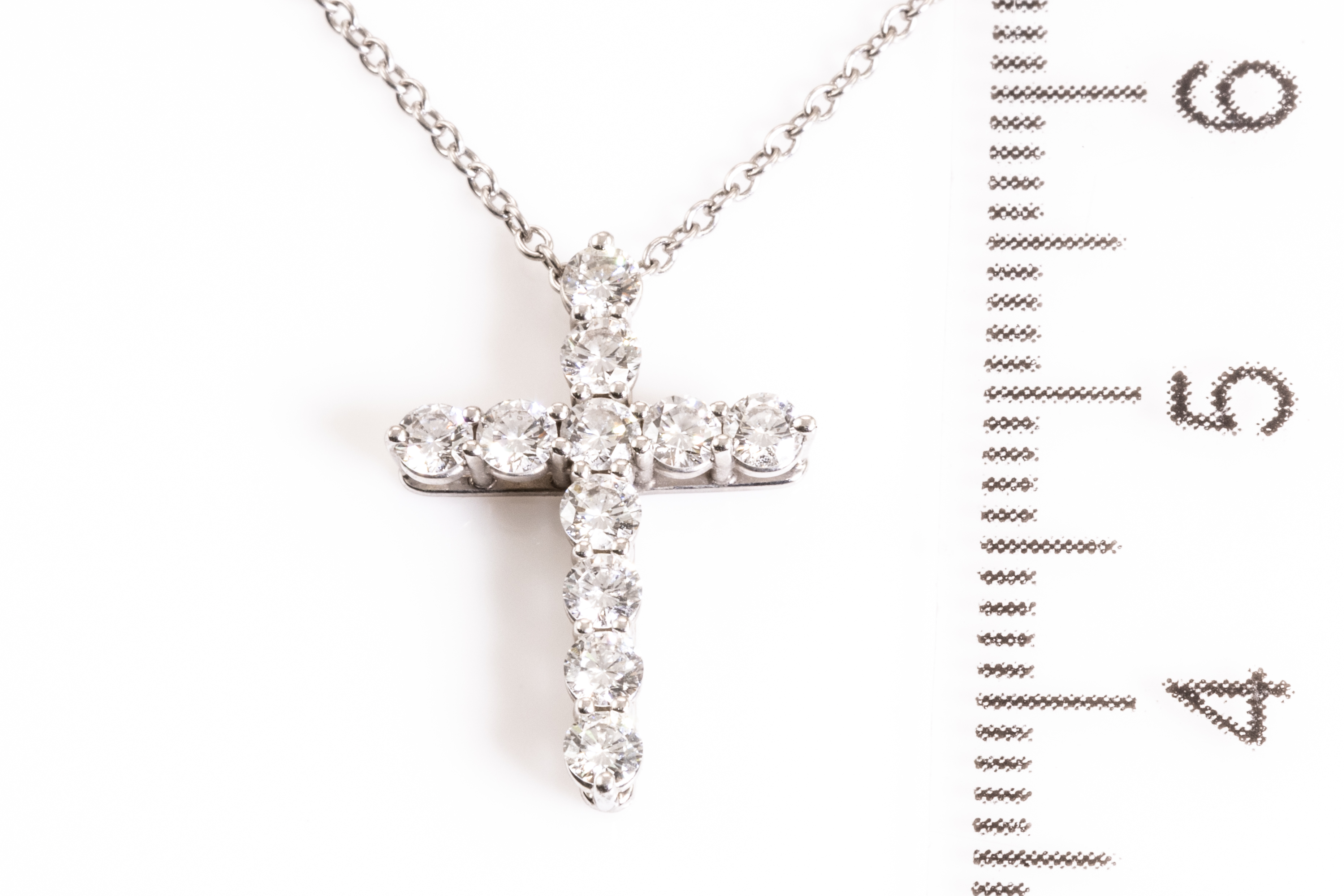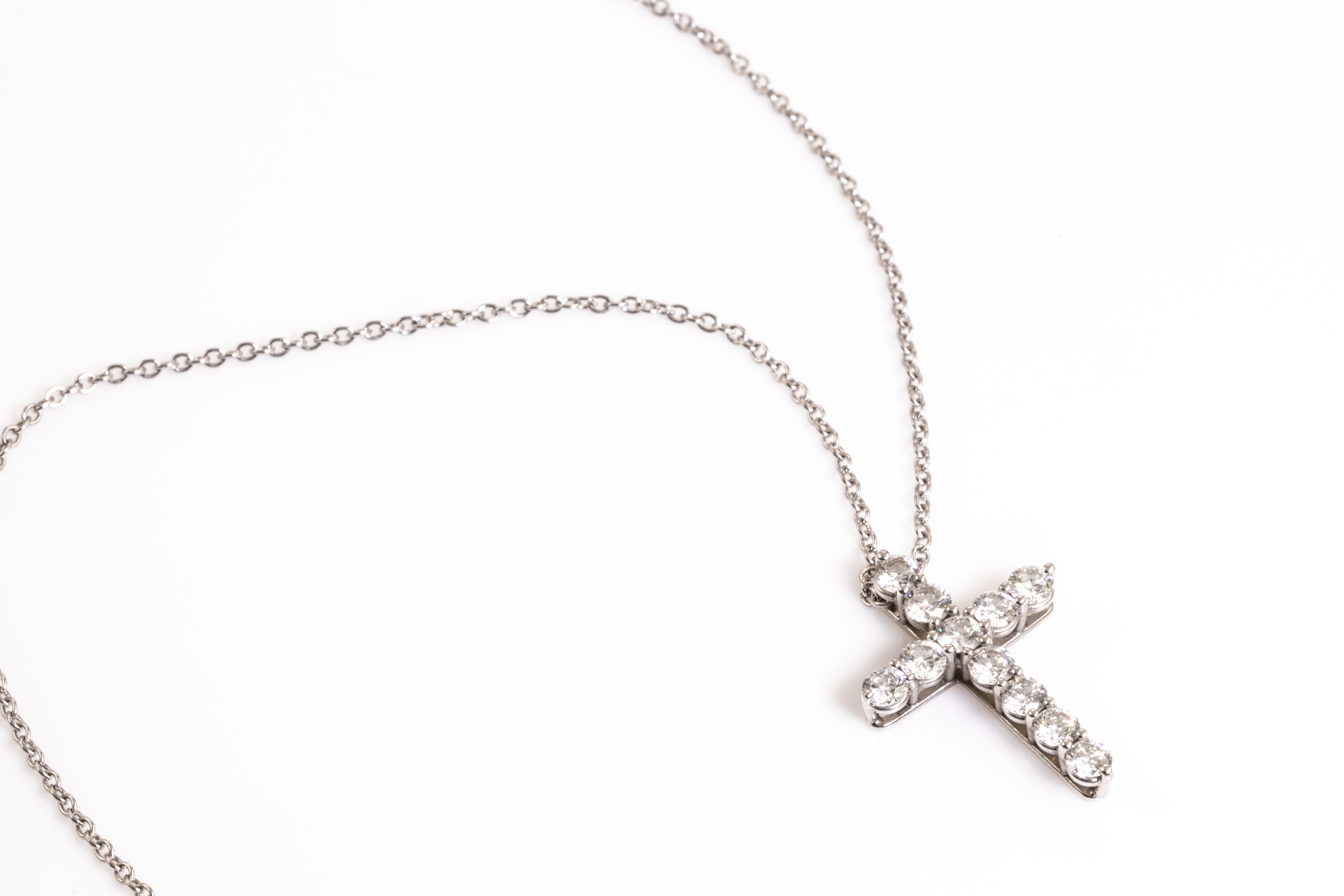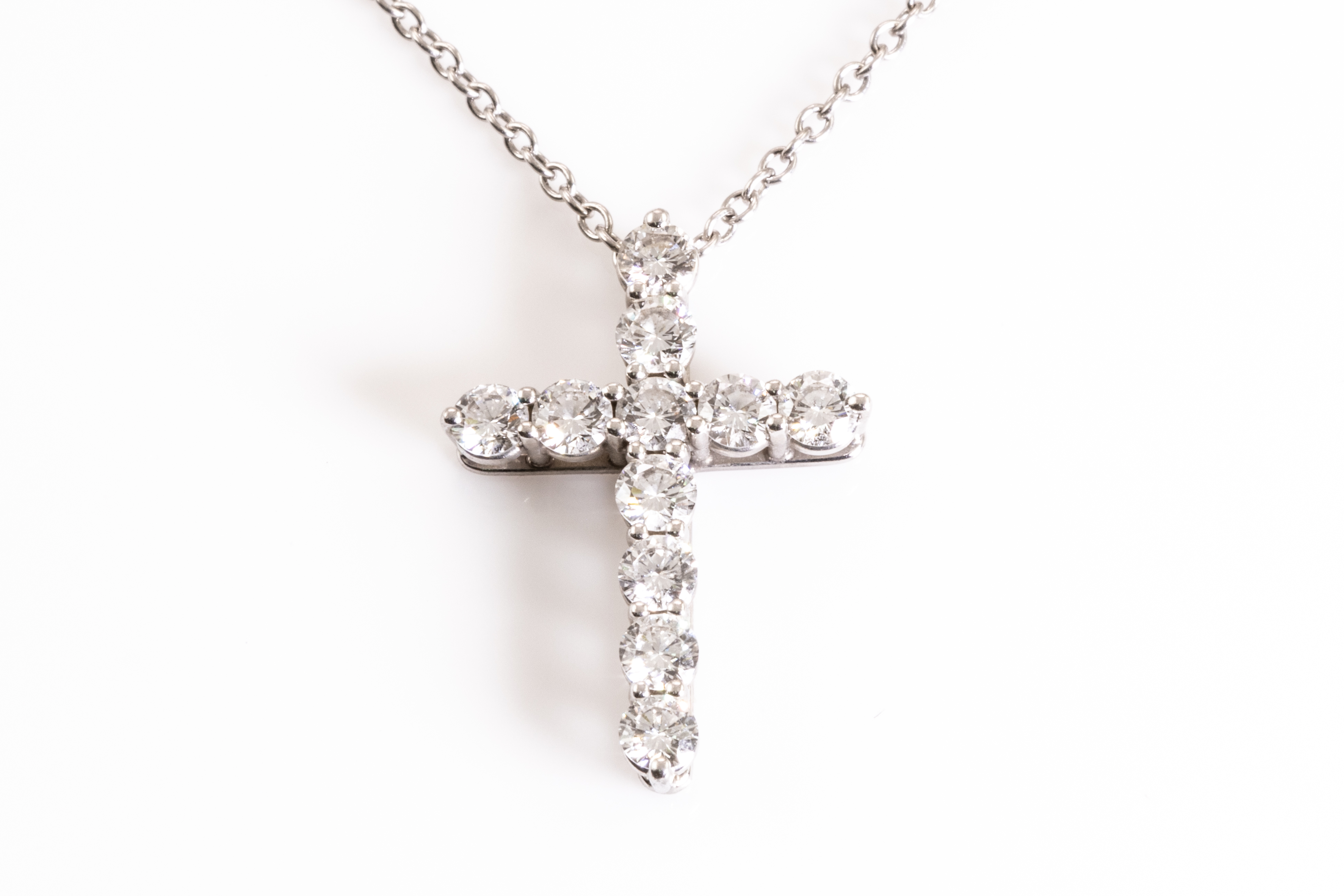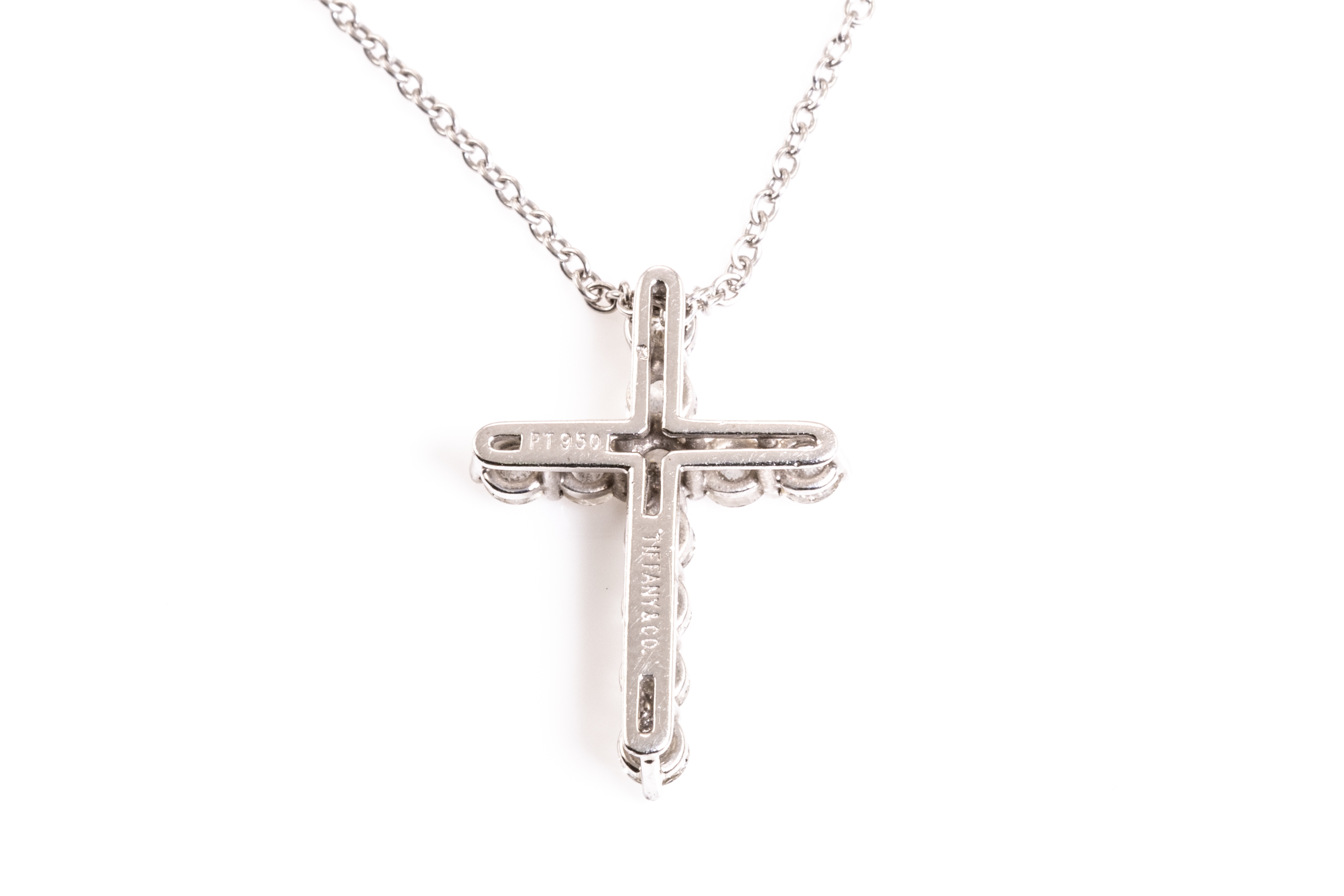 Tiffany & Co cross pendant with 11 round Diamonds totalling 0.42cts (Estimated grading: G VS). Platinum with 42cm chain. With Tiffany & Co box. Weight: 3.4g. (Pre-owned)