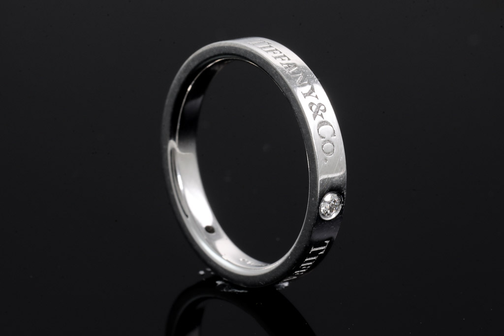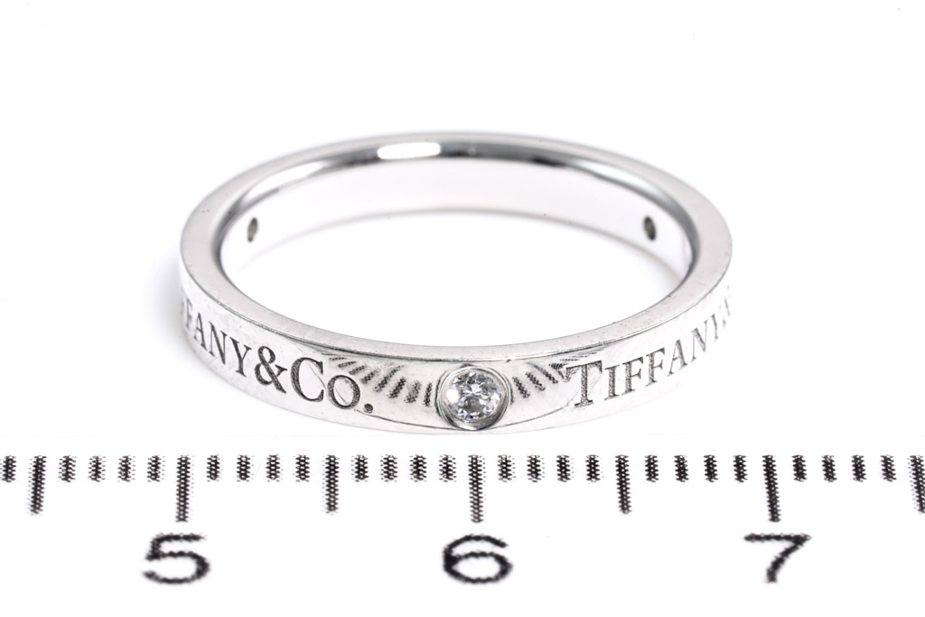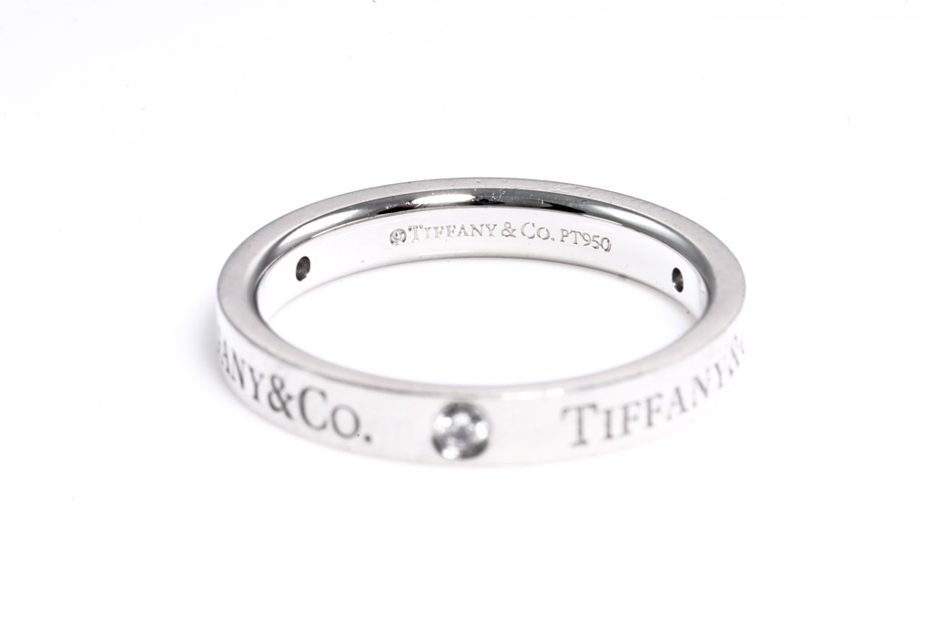 Tiffany & Co Band ring with 3 round Diamonds totalling 0.07cts. Platinum. Ring size K1/2, ring resizing is not recommended. Band width: 3.0mm. With Tiffany & Co box. Weight: 5.0g. (Pre-owned)
