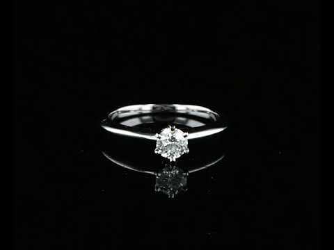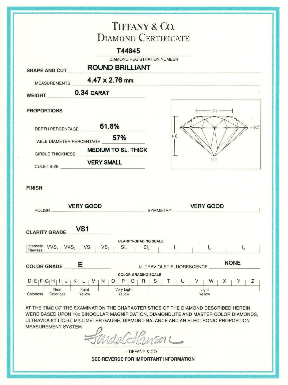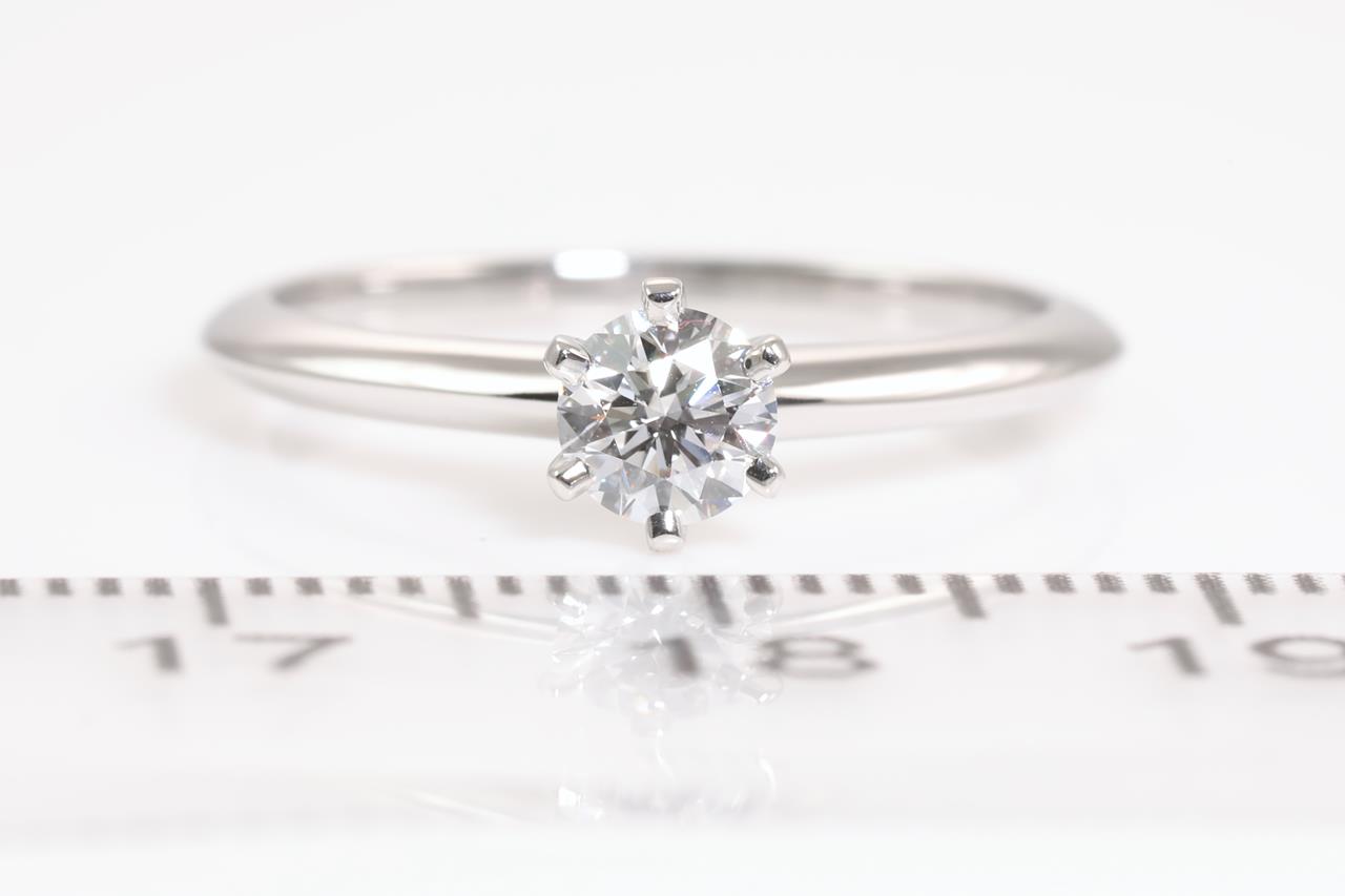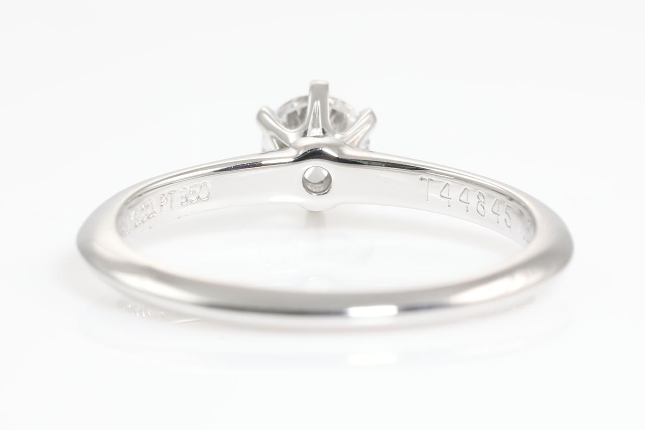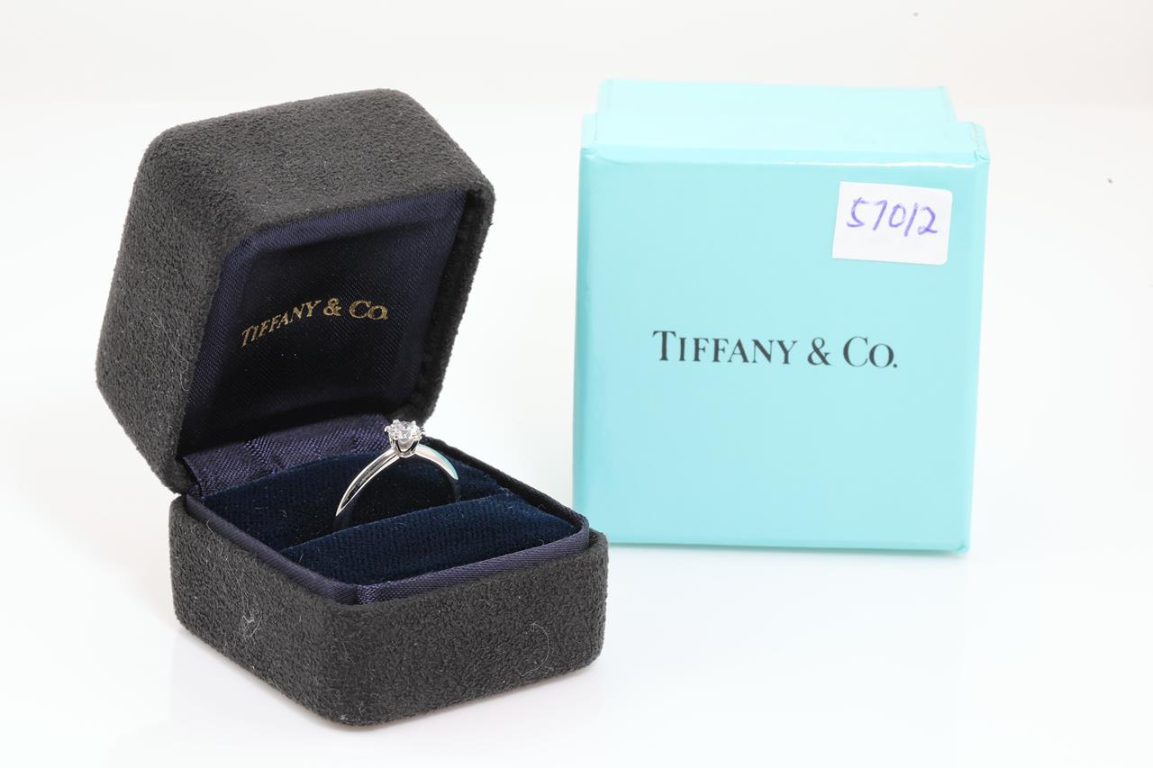 Tiffany & Co solitaire ring with a round brilliant cut Diamond of 0.34ct (With Tiffany & Co certificate graded as E VS1 #T44845). Platinum. Ring size K1/2 - ring resizing is not recommended. With Tiffany & Co Diamond certificate #T44845 and Tiffany & Co. box. Weight: 3.1g. (Pre-owned)