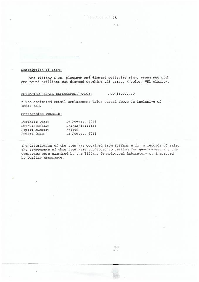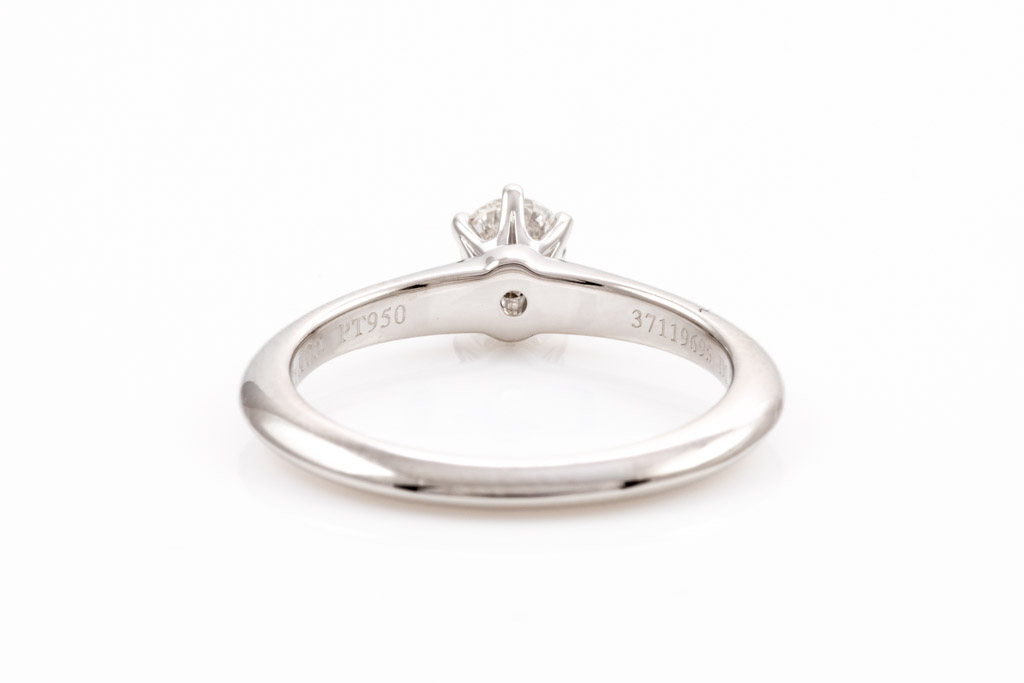 Tiffany & Co Diamond solitaire ring with round brilliant cut Diamond of 0.23ct (with Tiffany & Co Diamond Certificate graded as H VS1). Platinum. Ring size I - ring resizing is not recommended. Weight: 4g. With Tiffany & Co Valuation report dated 10/08/2016. (Pre-owned)