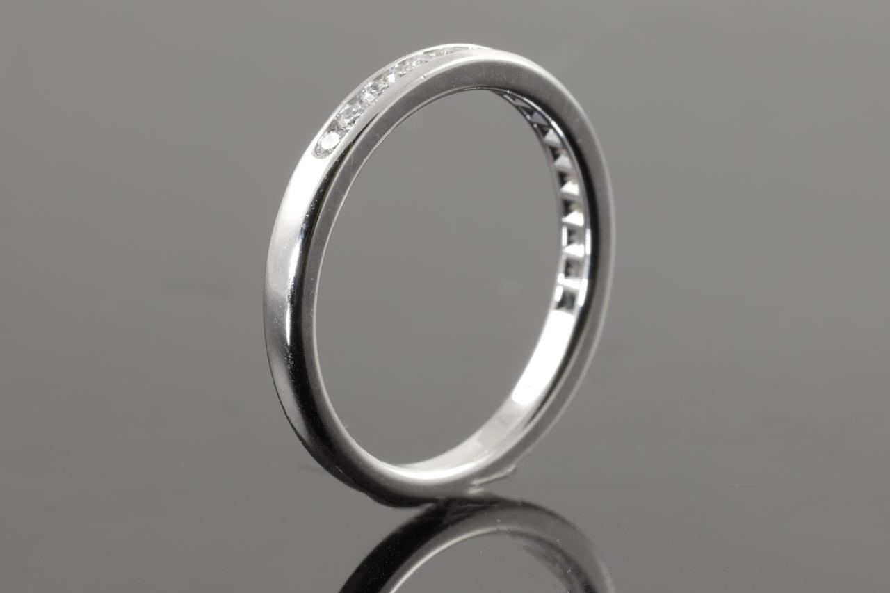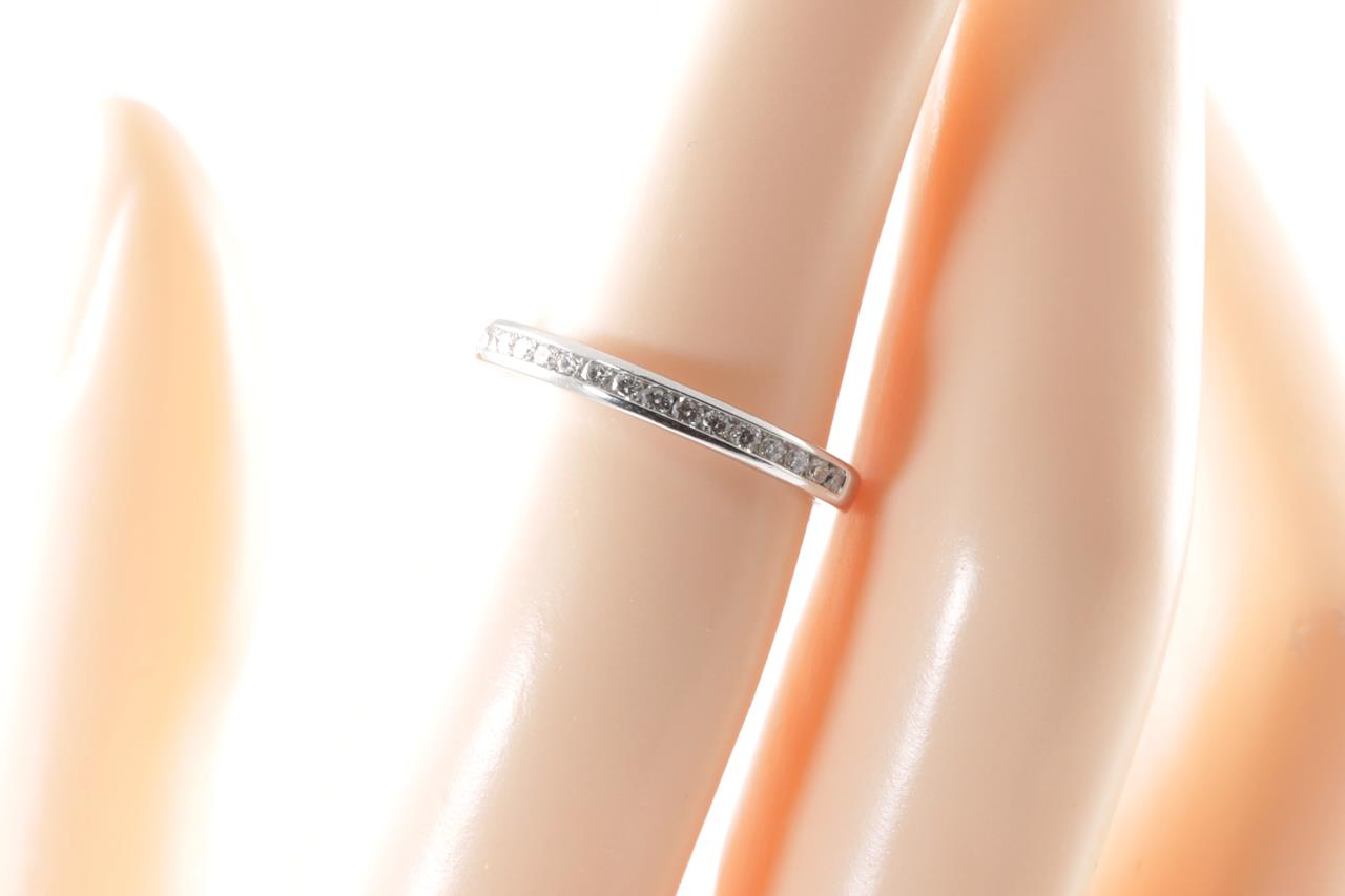 Tiffany & Co half circle wedding band with round Diamonds totalling 0.15cts. Platinum. Ring size K - ring resizing is not recommended. Weight: 3.2g. Width: 2mm. With Tiffany & Co box. (Pre-owned)