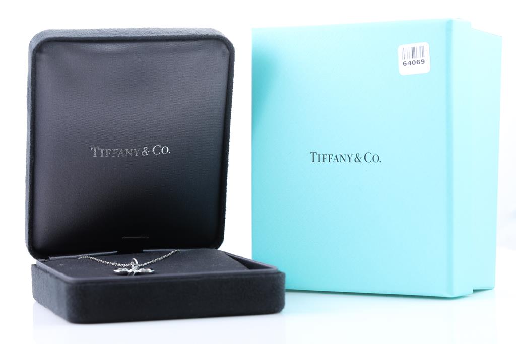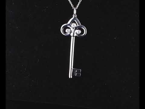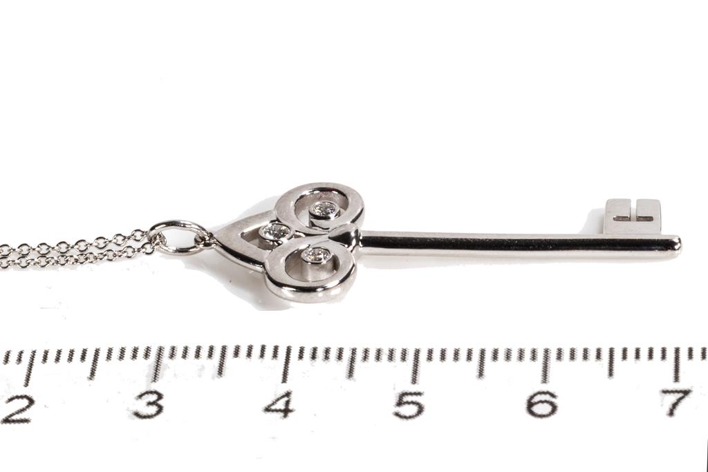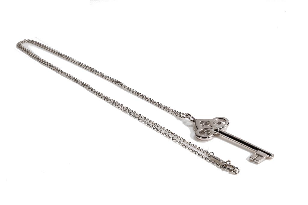Tiffany & Co Fleur de Lis Key pendant with 3 round Diamond totalling 0.07cts. Pendant length: 3.8cm. 18ct white gold with 18ct white gold Tiffany & Co 50cm chain. Weight: 6.2g. With Tiffany & Co box. (Pre-owned)