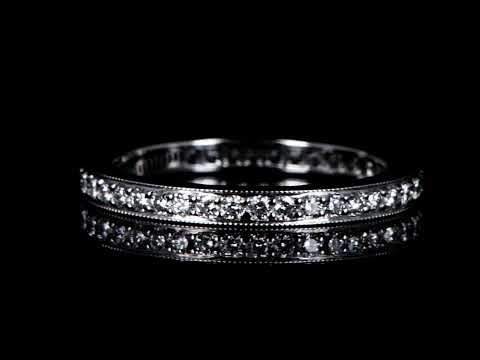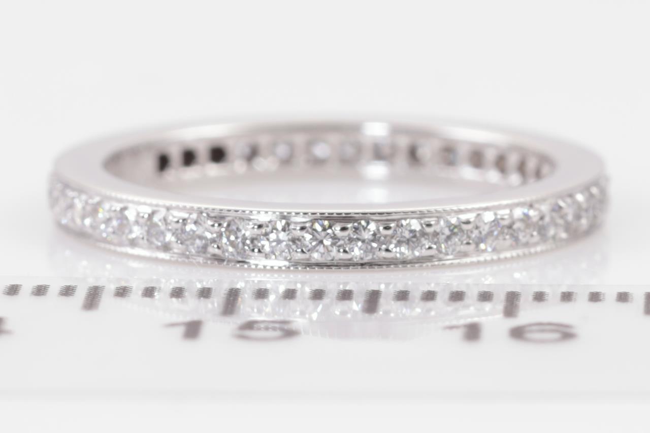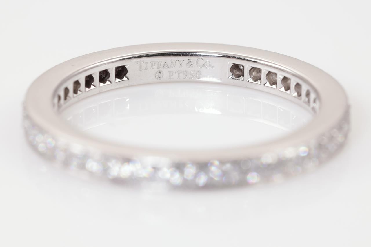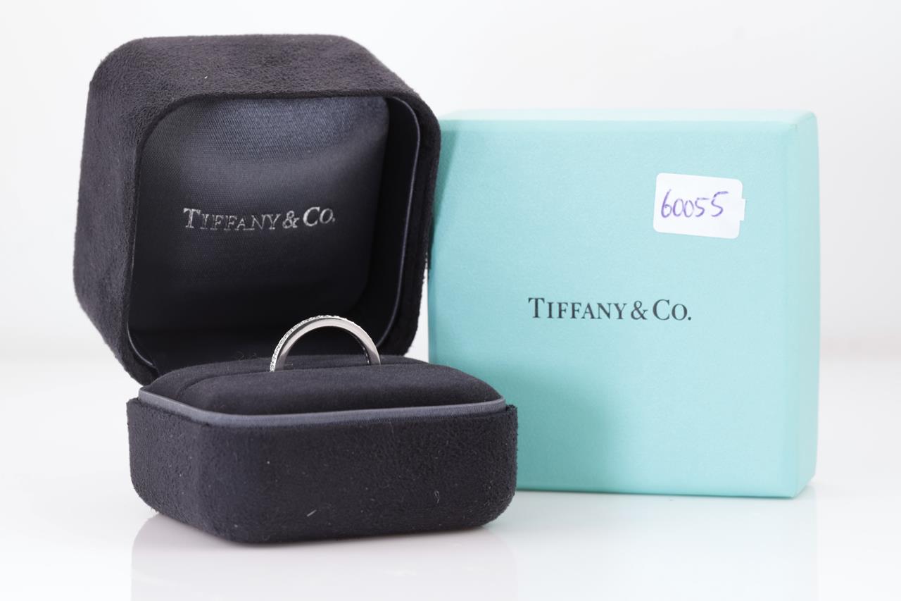 Tiffany & Co full hoop diamond eternity ring with round Diamonds totalling approximately 0.34cts (Estimated grading: F VS). Platinum. Ring size L1/2 - ring resizing is not recommended. Weight: 4g. With Tiffany & Co box. (Pre-owned)