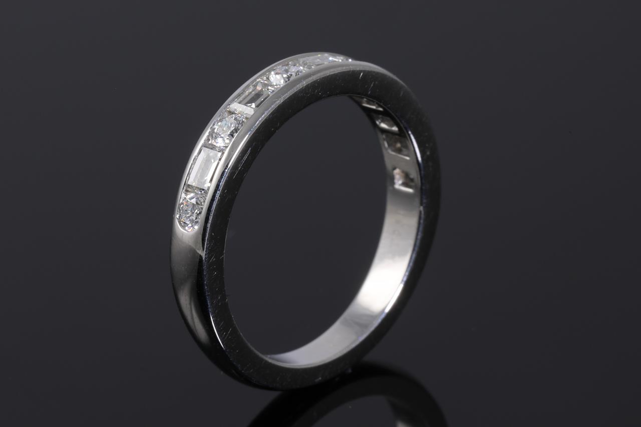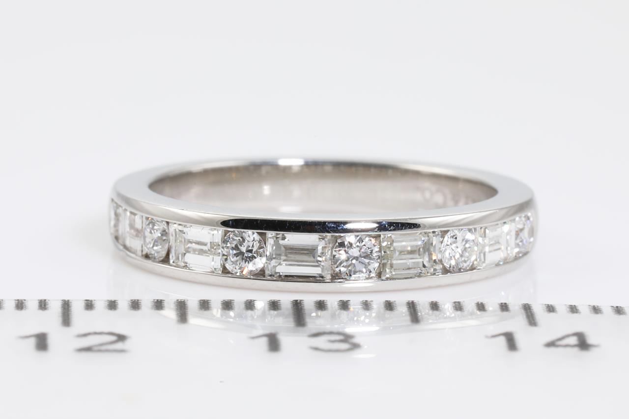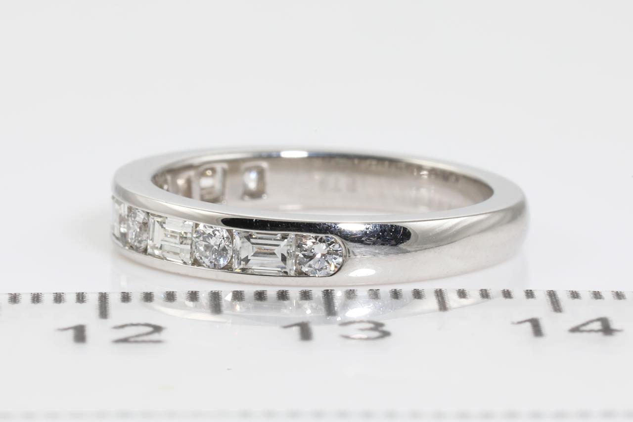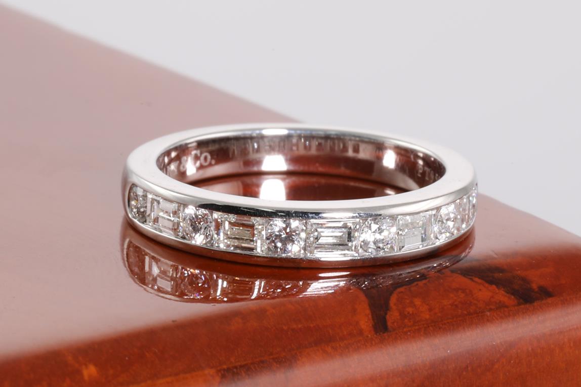Tiffany & Co half hoop chanel set ring with round & baguette cut Diamonds 0.66cts (Estimated grading: F VS). Platinum. Ring size: I1/2 - ring resizing is not recommended. Weight: 4.8g. With certificate #414338. (Pre-owned)
