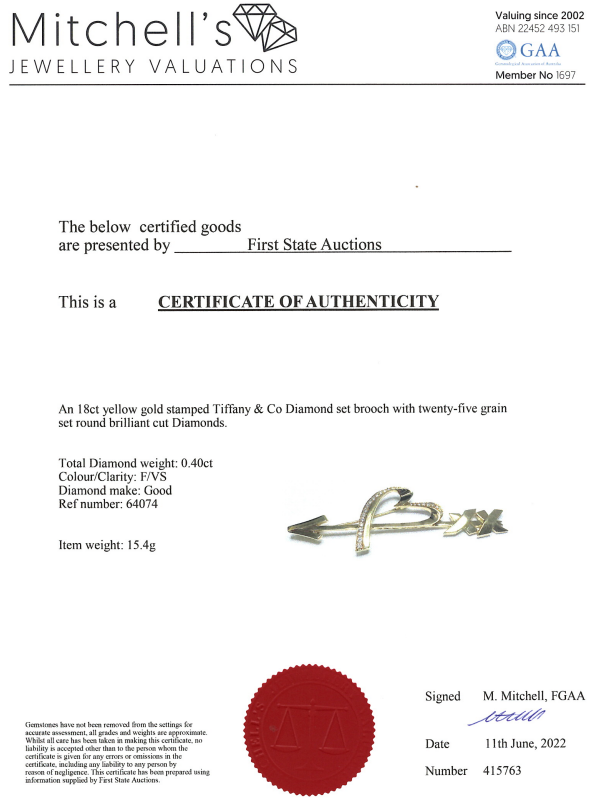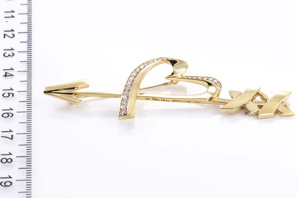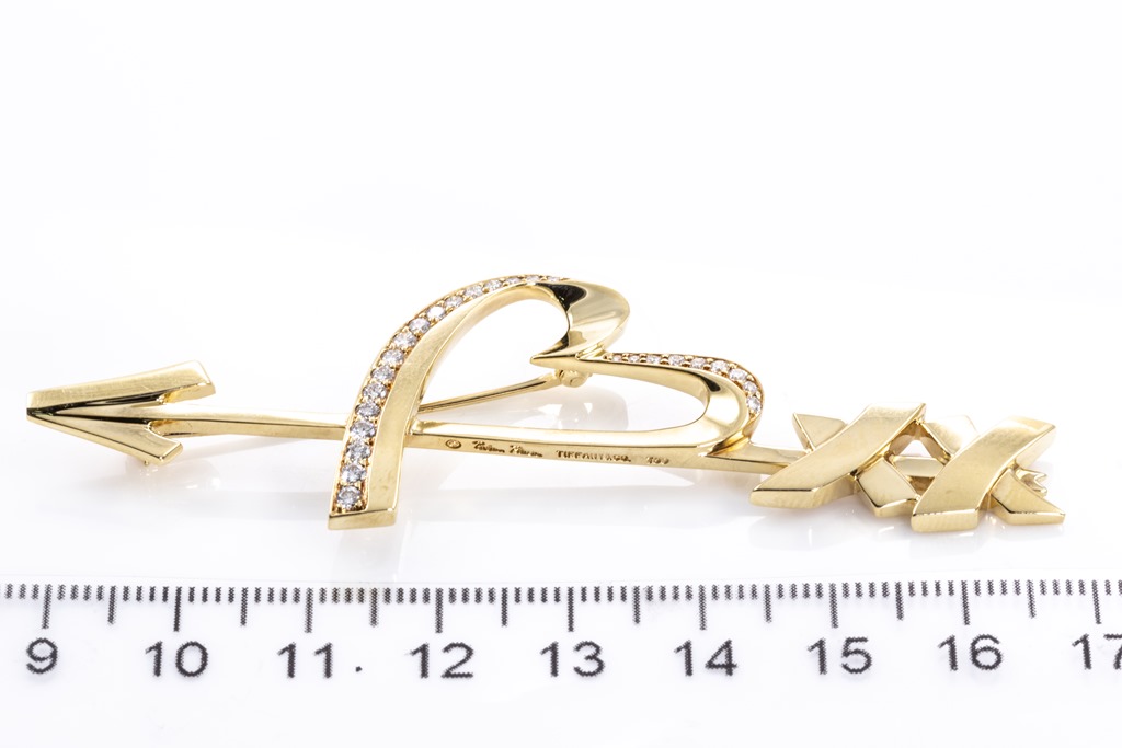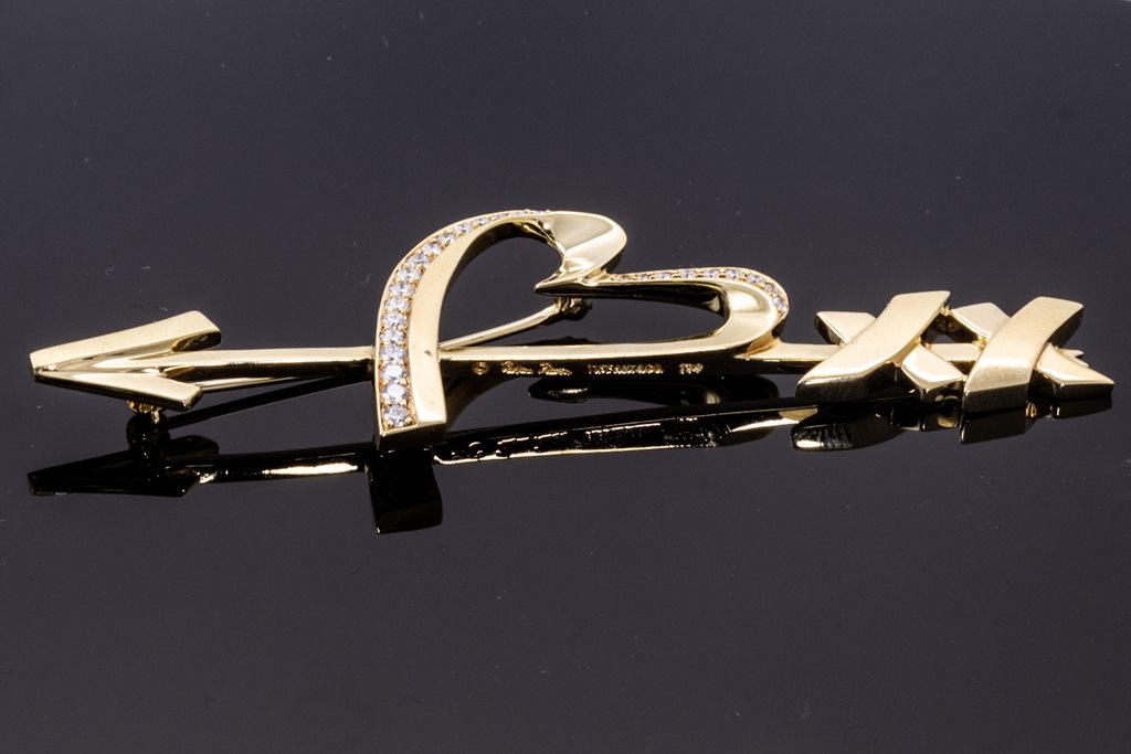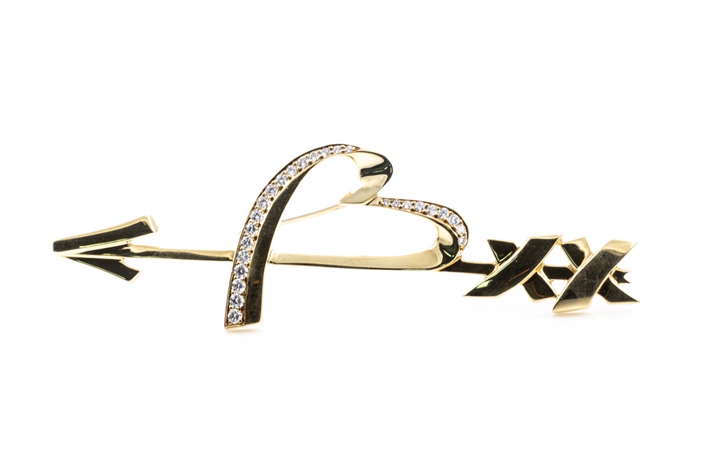 Tiffany & Co Paloma Picasso Graffiti Heart & Arrow brooch with round Diamonds totalling approximately 0.40cts (Estimated grading: F VS). 18ct yellow gold. Weight: 15.4g. With certificate #415763. (Pre-owned)