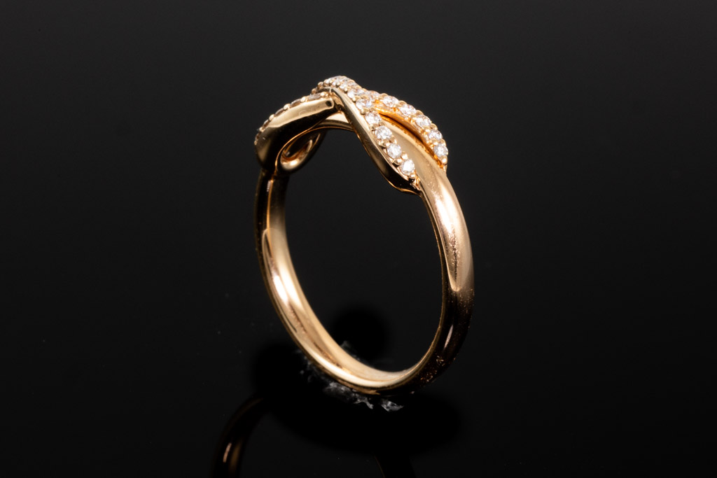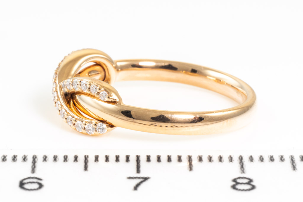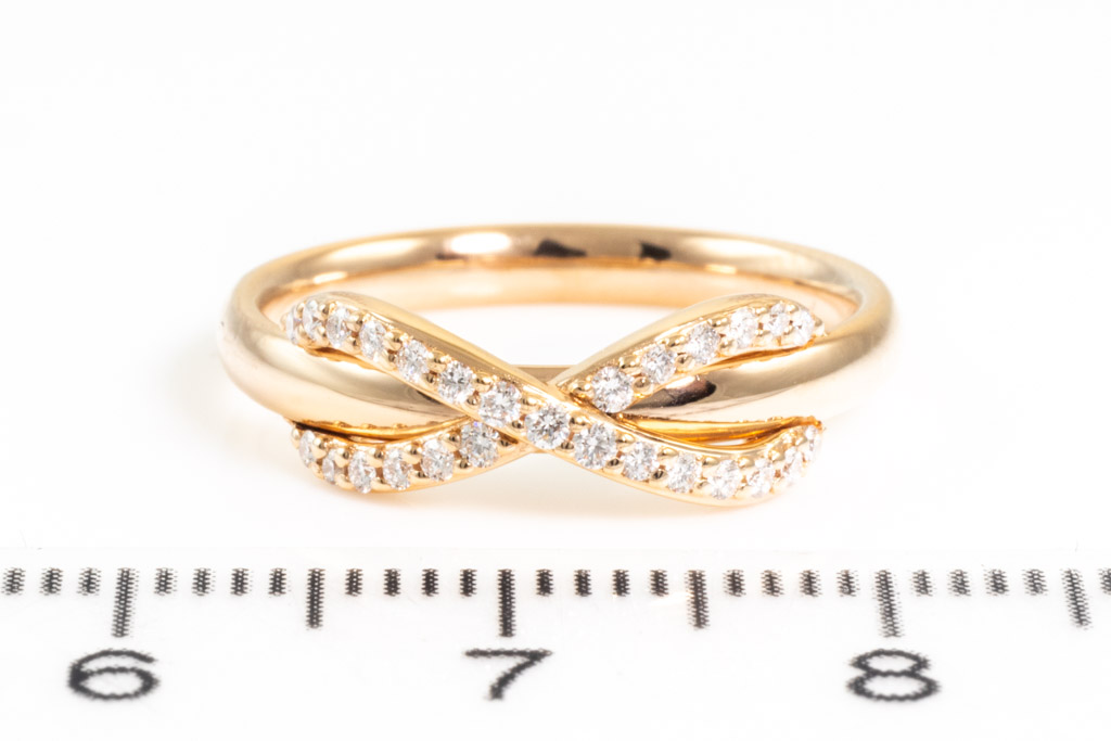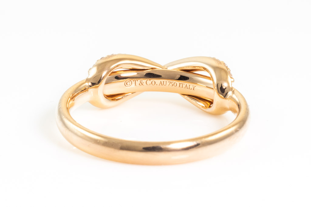 Tiffany & Co Infinity Diamond ring with round Diamonds totalling approximately 0.35cts (Estimated grading: F VVS). 18ct rose gold. Ring size I½ - ring resizing is not recommended. Weight: 3.7g. With Tiffany & Co box. (Pre-owned)