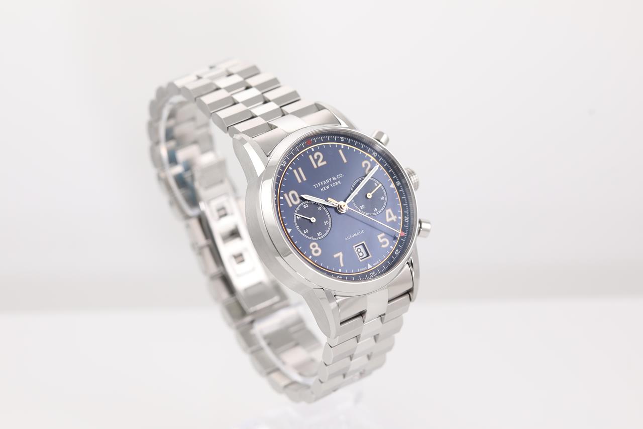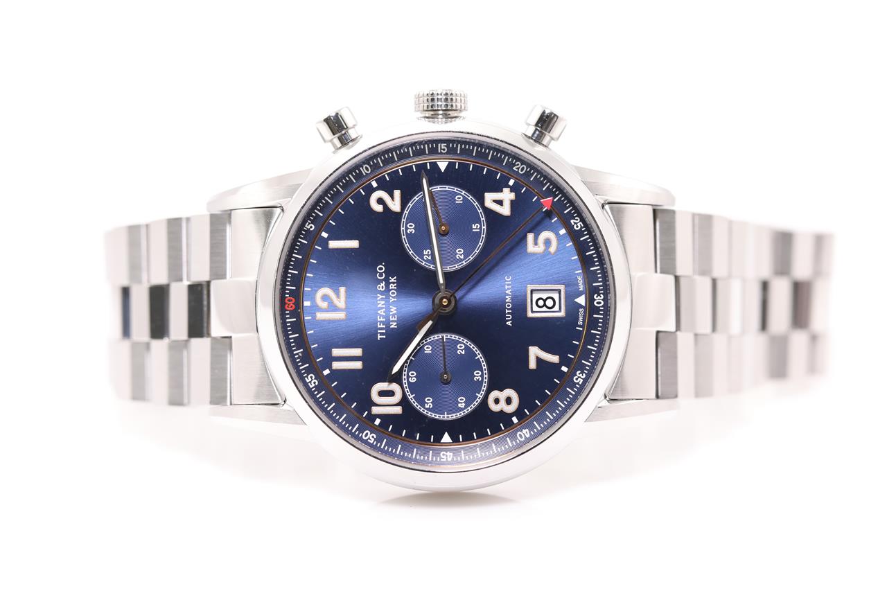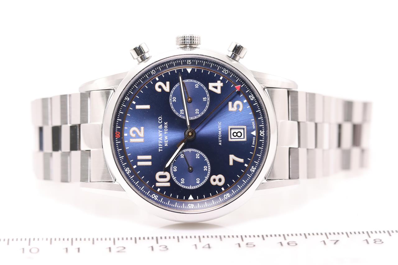 Tiffany & Co. stainless steel automatic mens watch. Blue chronograph dial, date, case diameter: 42mm, wrist size: 20cm, Swiss made. Ref# CT60. With Tiffany & Co. stainless steel bracelet and clasp. With certificate of authenticity, Tiffany & Co. international and limited warranty card dated 15/11/2018 and Tiffany & Co. box. 3 month FSA warranty. (Pre-owned)