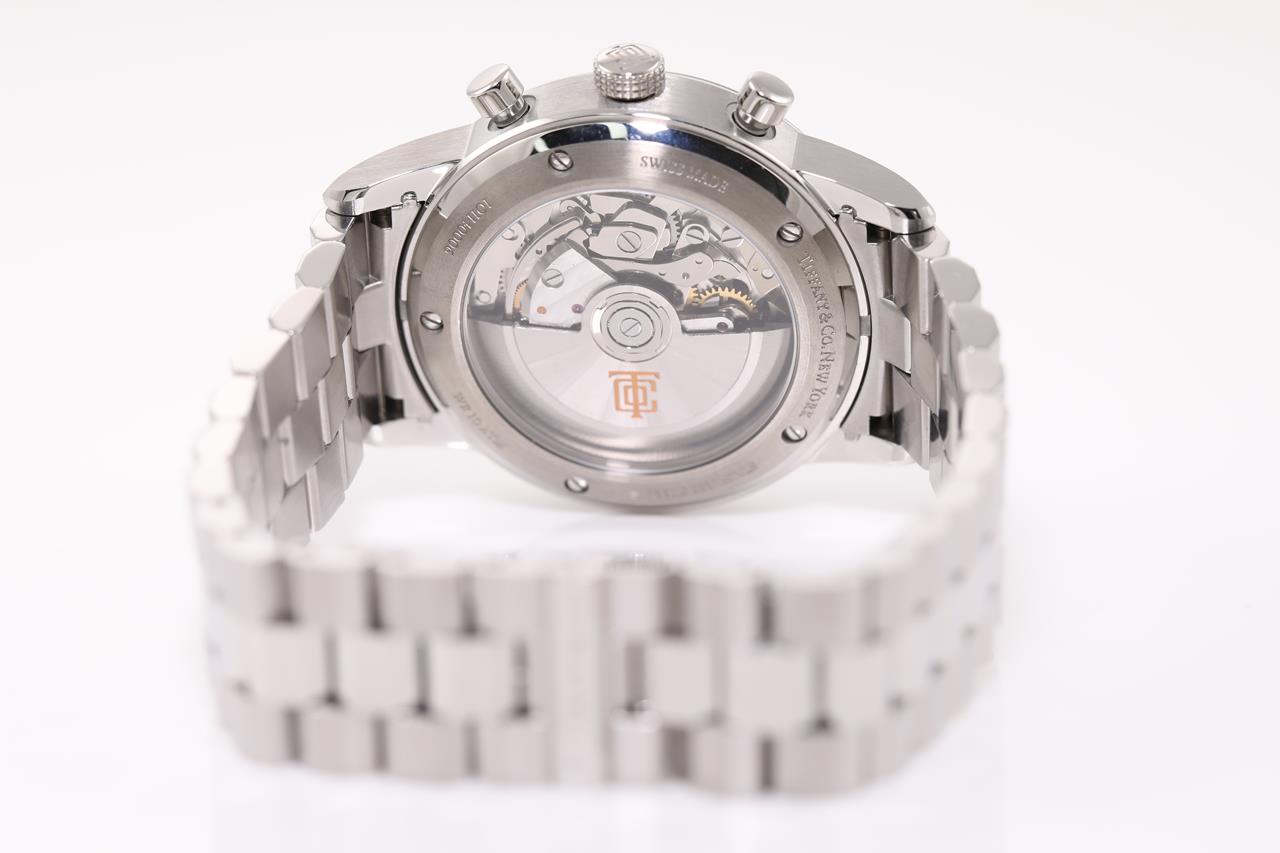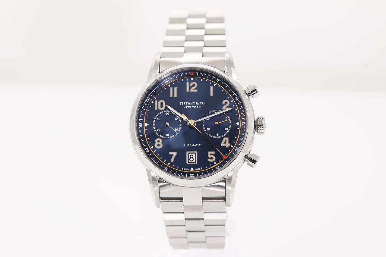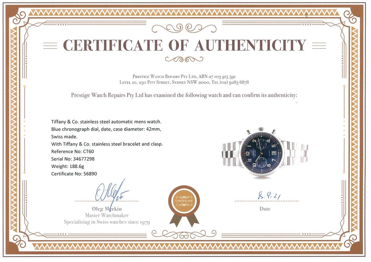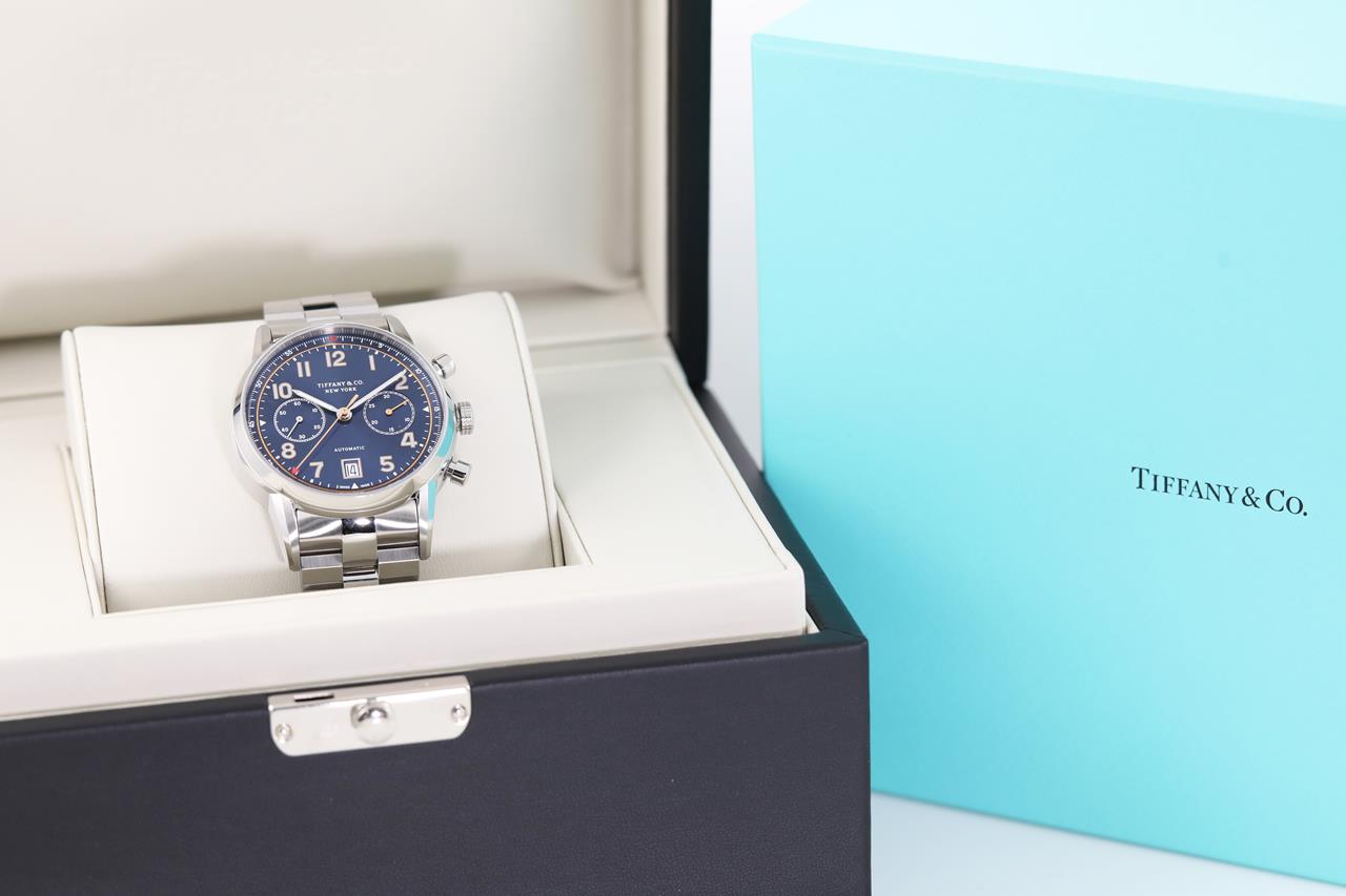 Tiffany & Co. stainless steel automatic mens watch. Blue chronograph dial, date, case diameter: 42mm, wrist size: 20cm, Swiss made. Ref# CT60. With Tiffany & Co. stainless steel bracelet and clasp. With certificate of authenticity, Tiffany & Co. international and limited warranty card dated 15/11/2018 and Tiffany & Co. box. 3 month FSA warranty. (Pre-owned)
