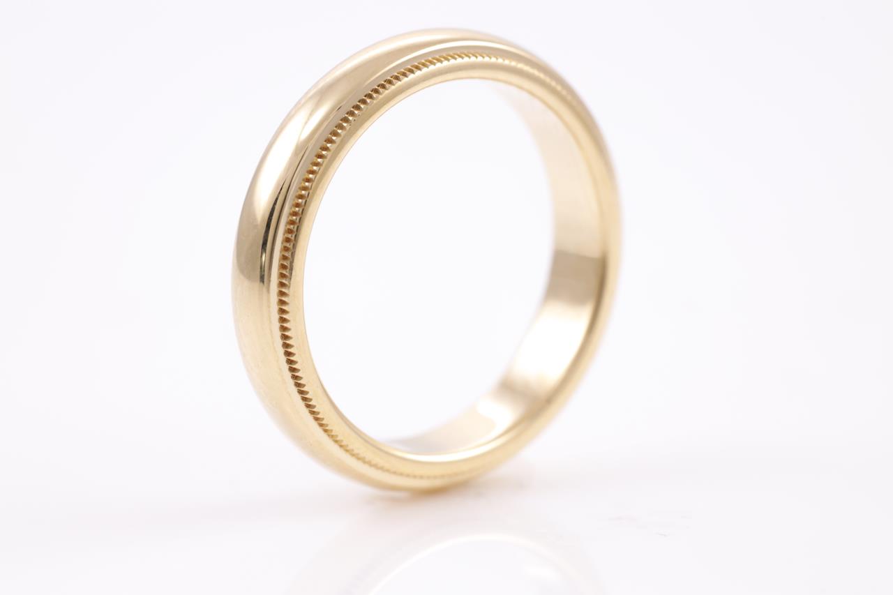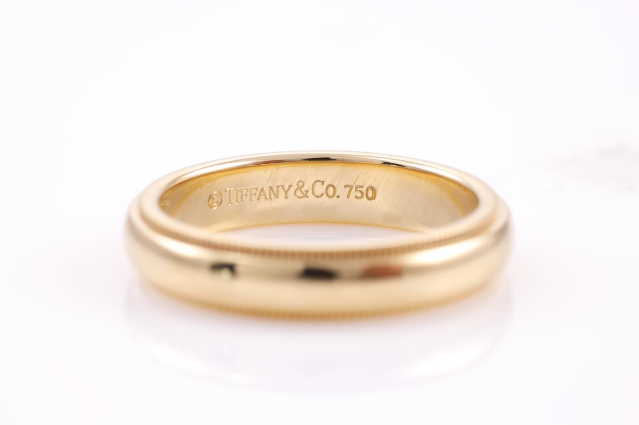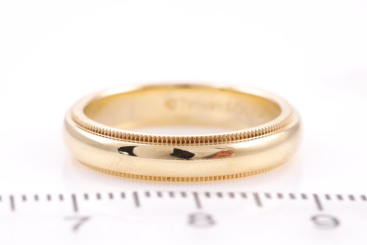 Tiffany & Co Milgrain wedding band. 18ct yellow gold. Width 4mm. Ring size M - ring resizing is not recommended. Weight: 6.2g (Pre-owned)