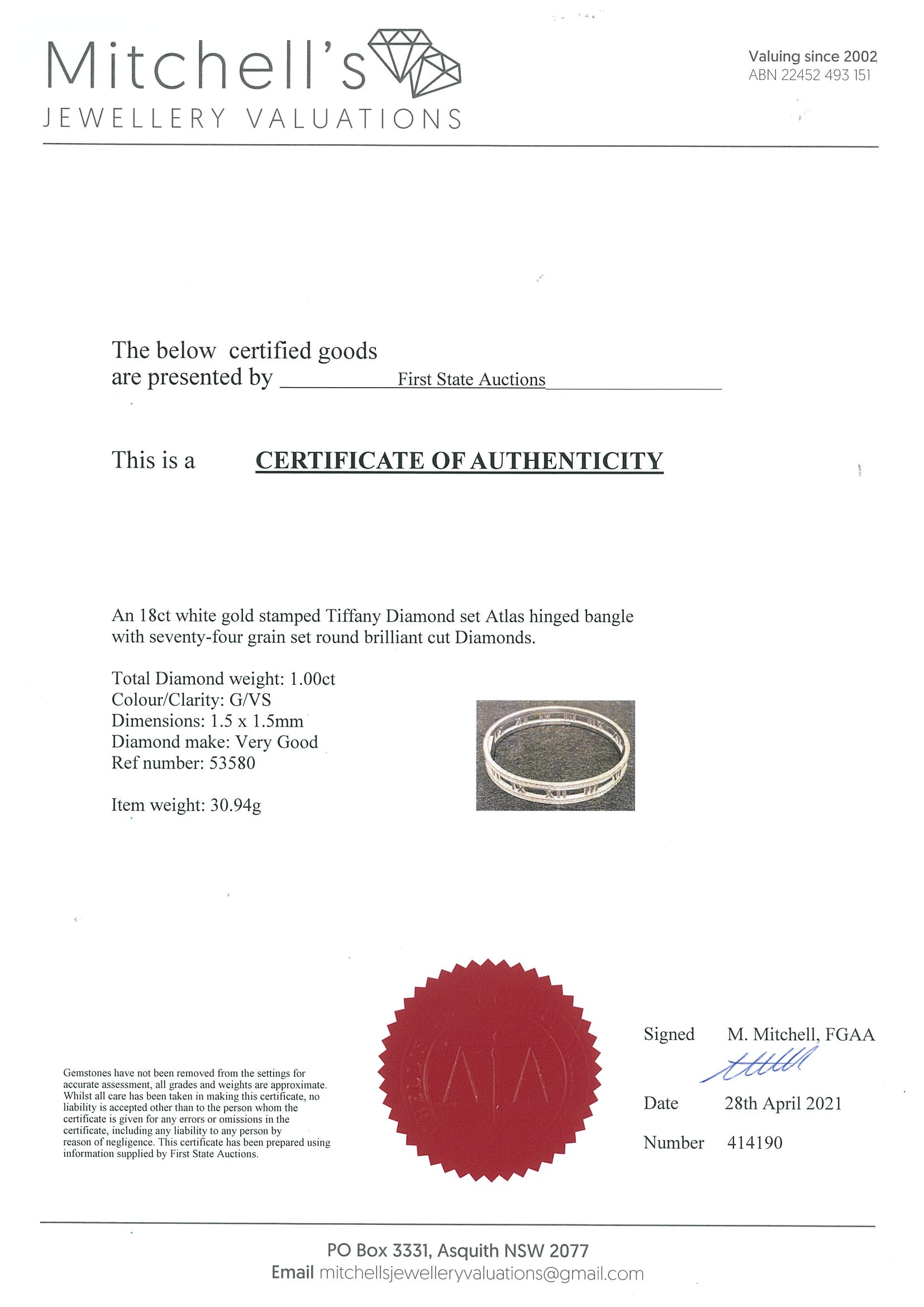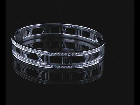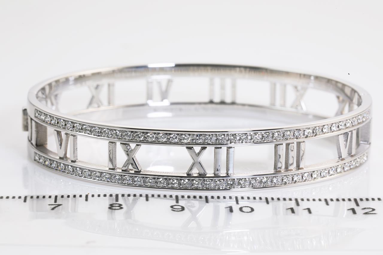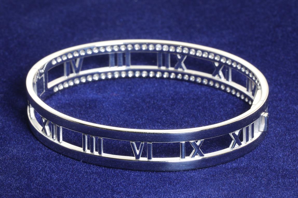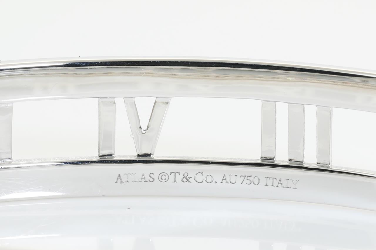 Tiffany & Co Open Atlas bangle with Diamonds totalling approximately 1.00cts (Estimated grading: G VS). 18ct white gold. Inner circumference 16.5cm. Weight: 30.9g. With Tiffany & Co box. With certificate #414190. Made in Italy. (Pre-owned)