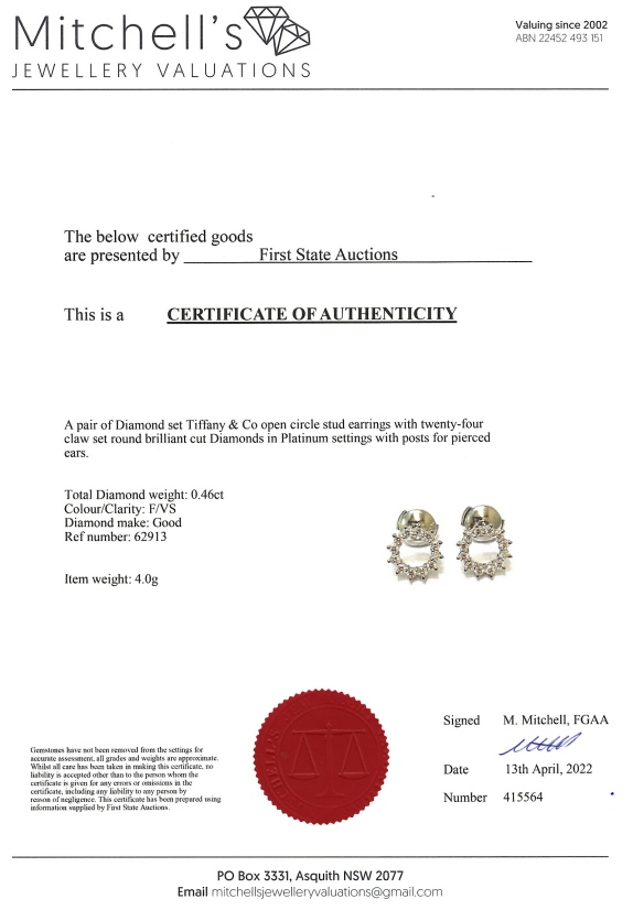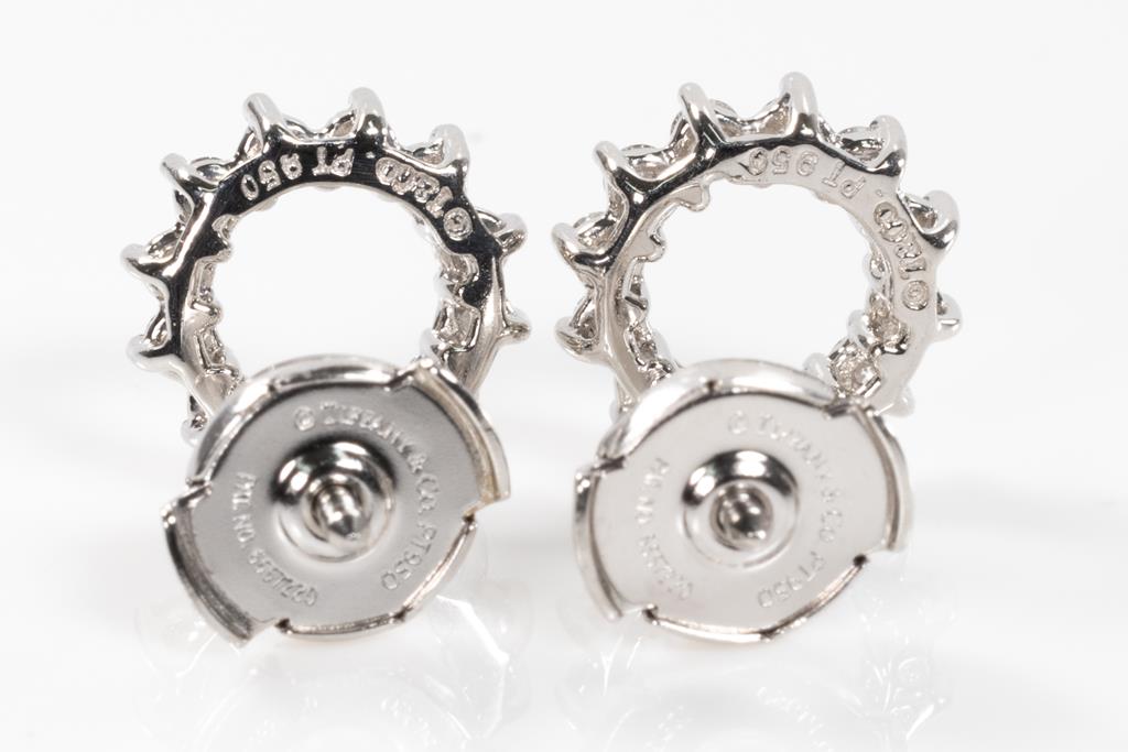 Tiffany & Co open circle earrings with round Diamonds totalling 0.46cts (Estimated grading: F VS). Platinum. Weight: 4g. With certificate #415564. (Pre-owned)