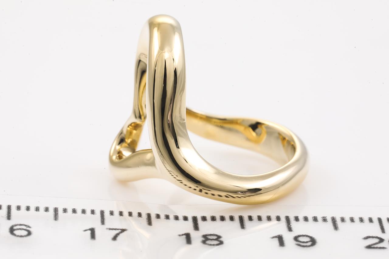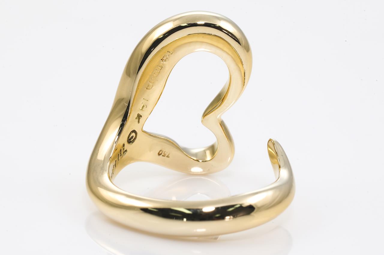 Tiffany & Co Elsa Peretti Open Heart ring. Width 18mm. 18ct yellow gold. Ring size: L - ring resizing is not recommended. Weight: 10g. With Tiffany & Co pouch. (Pre-owned)