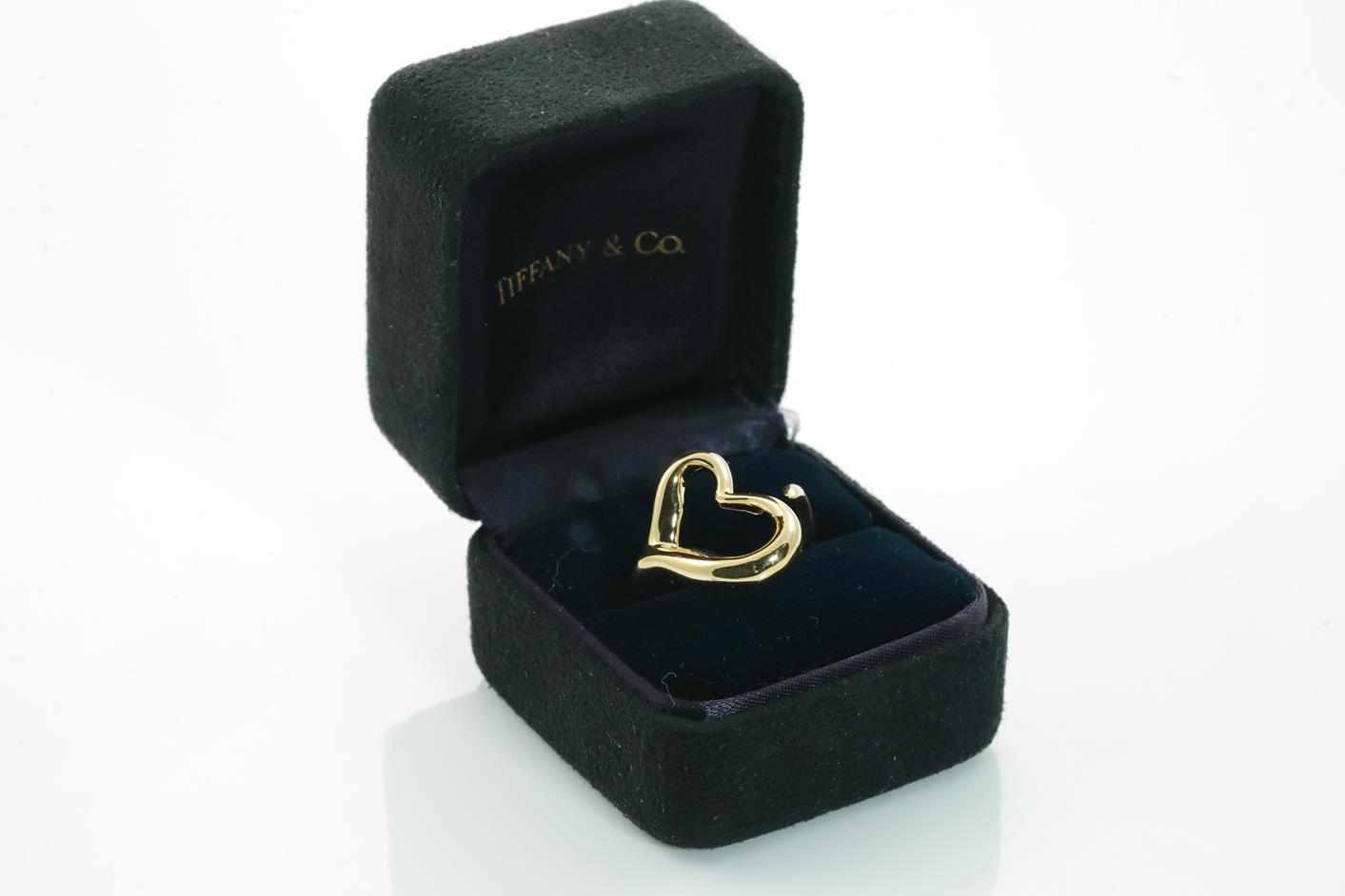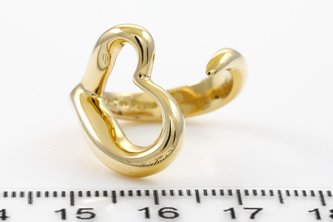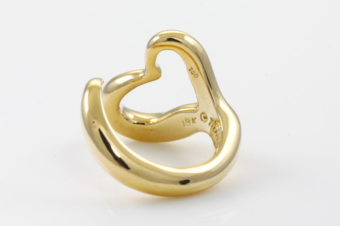 Tiffany & Co Elsa Peretti Open Heart ring. Width 9.2mm. 18ct yellow gold. Ring size L1/2 - ring resizing is not recommended. Weight: 11.5g. With worn Tiffany & Co box. (Pre-owned)