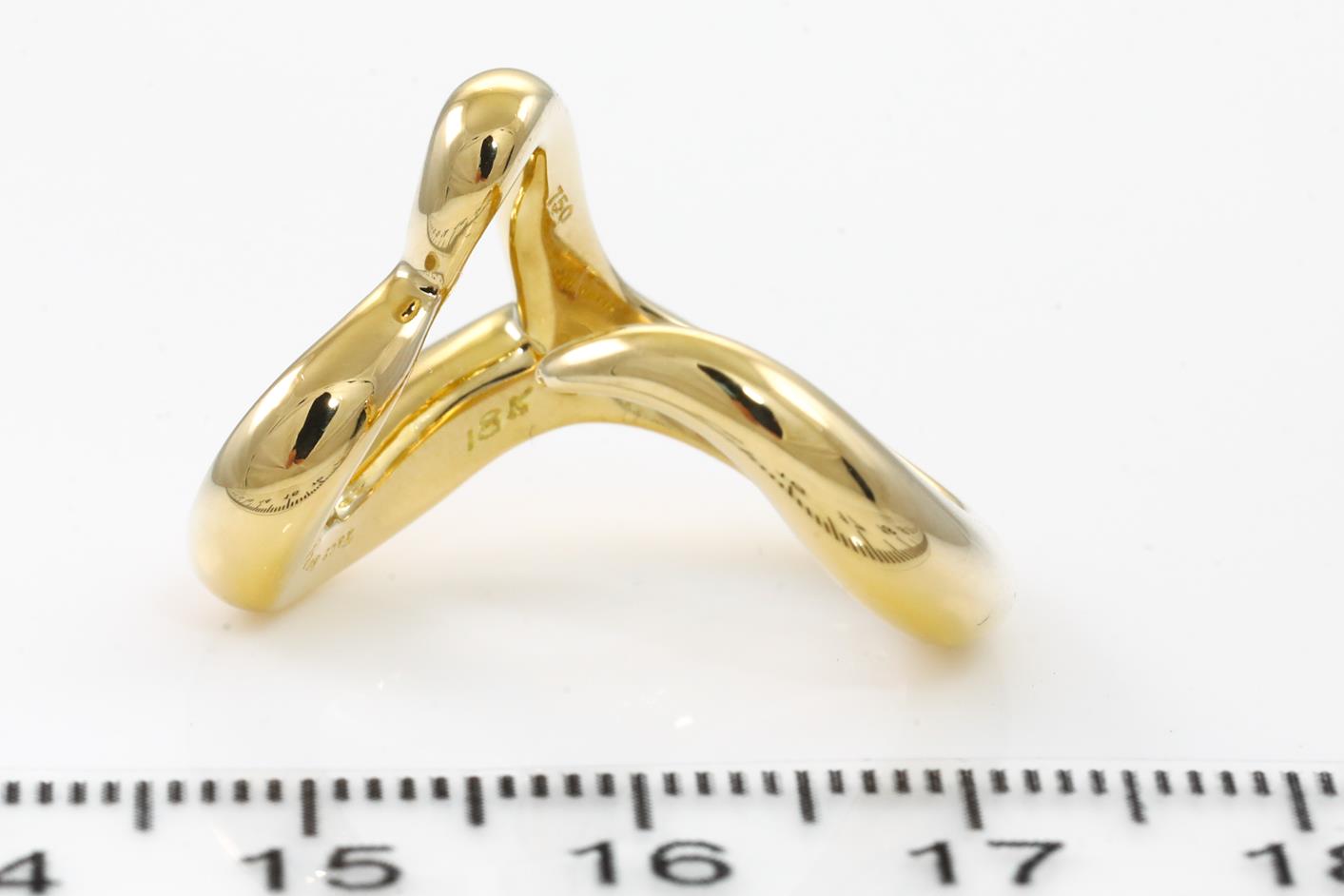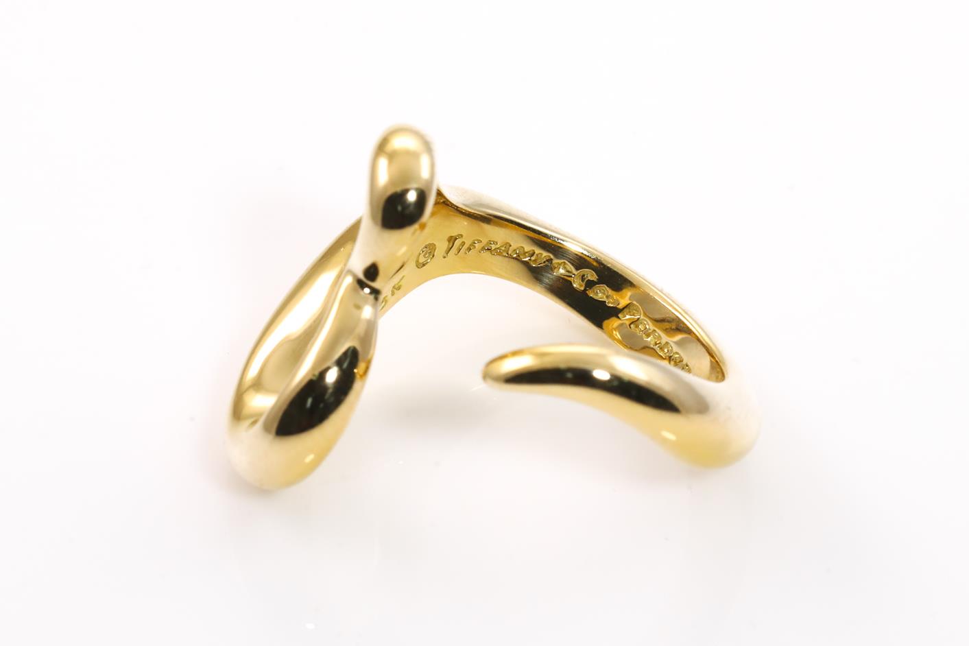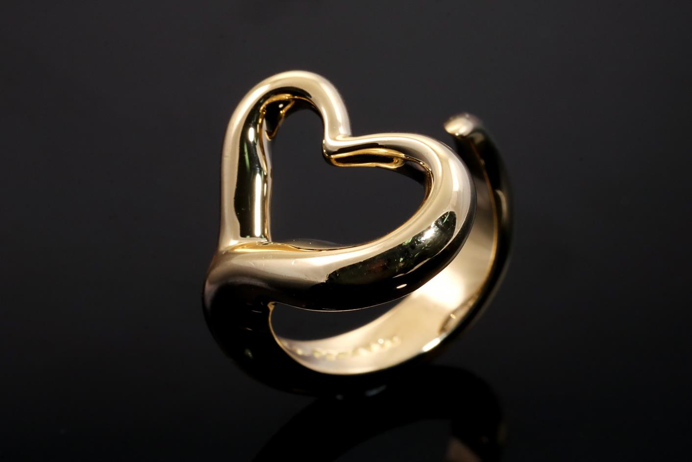 Tiffany & Co Elsa Peretti Open Heart ring. Width 9.2mm. 18ct yellow gold. Ring size L1/2 - ring resizing is not recommended. Weight: 11.5g. With worn Tiffany & Co box. (Pre-owned)