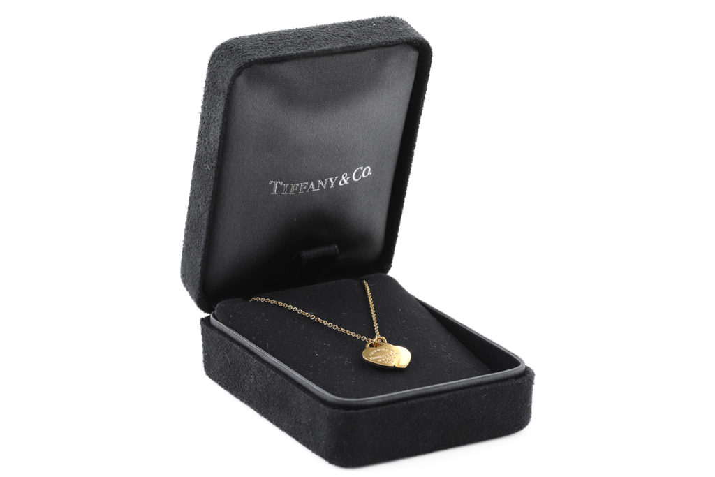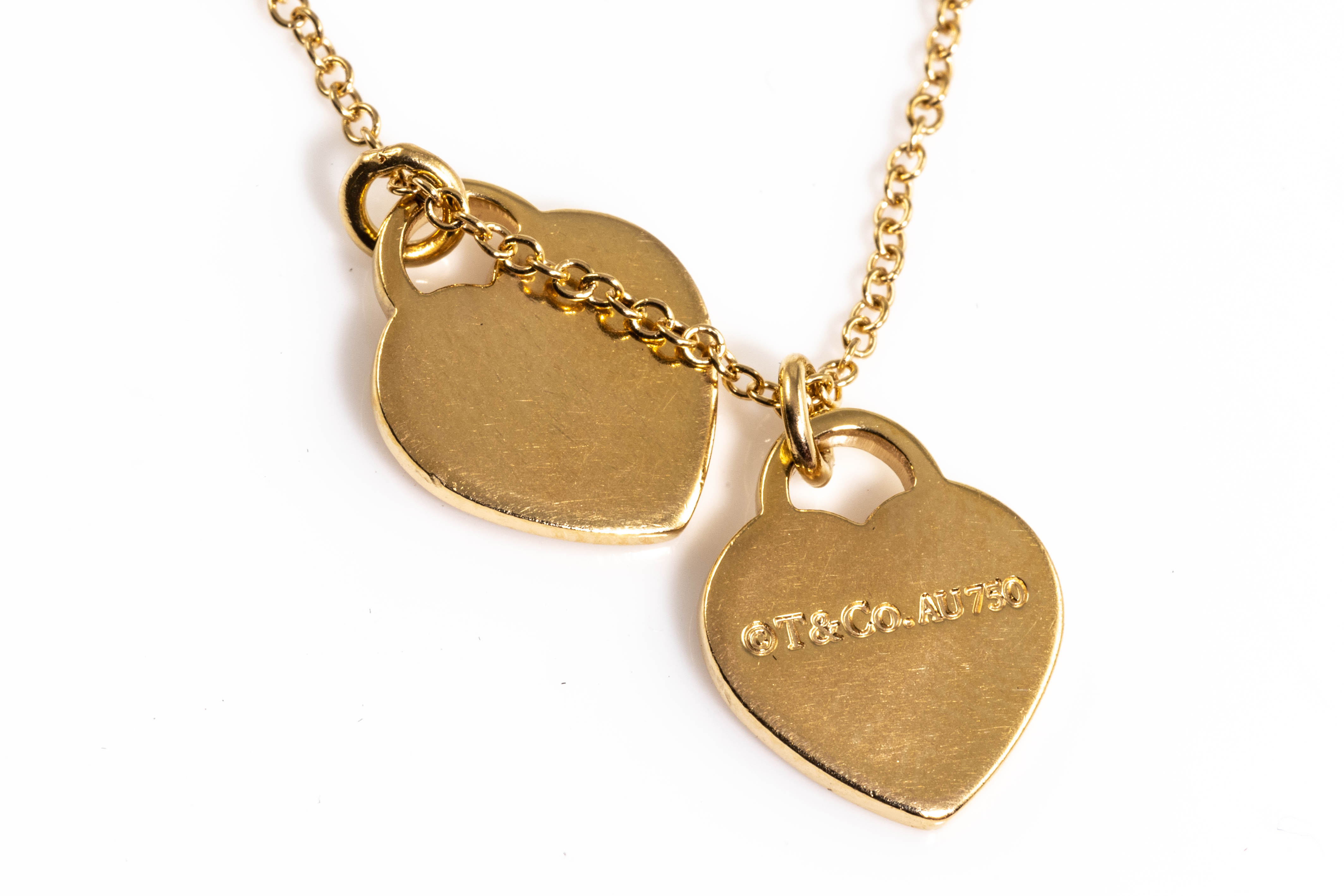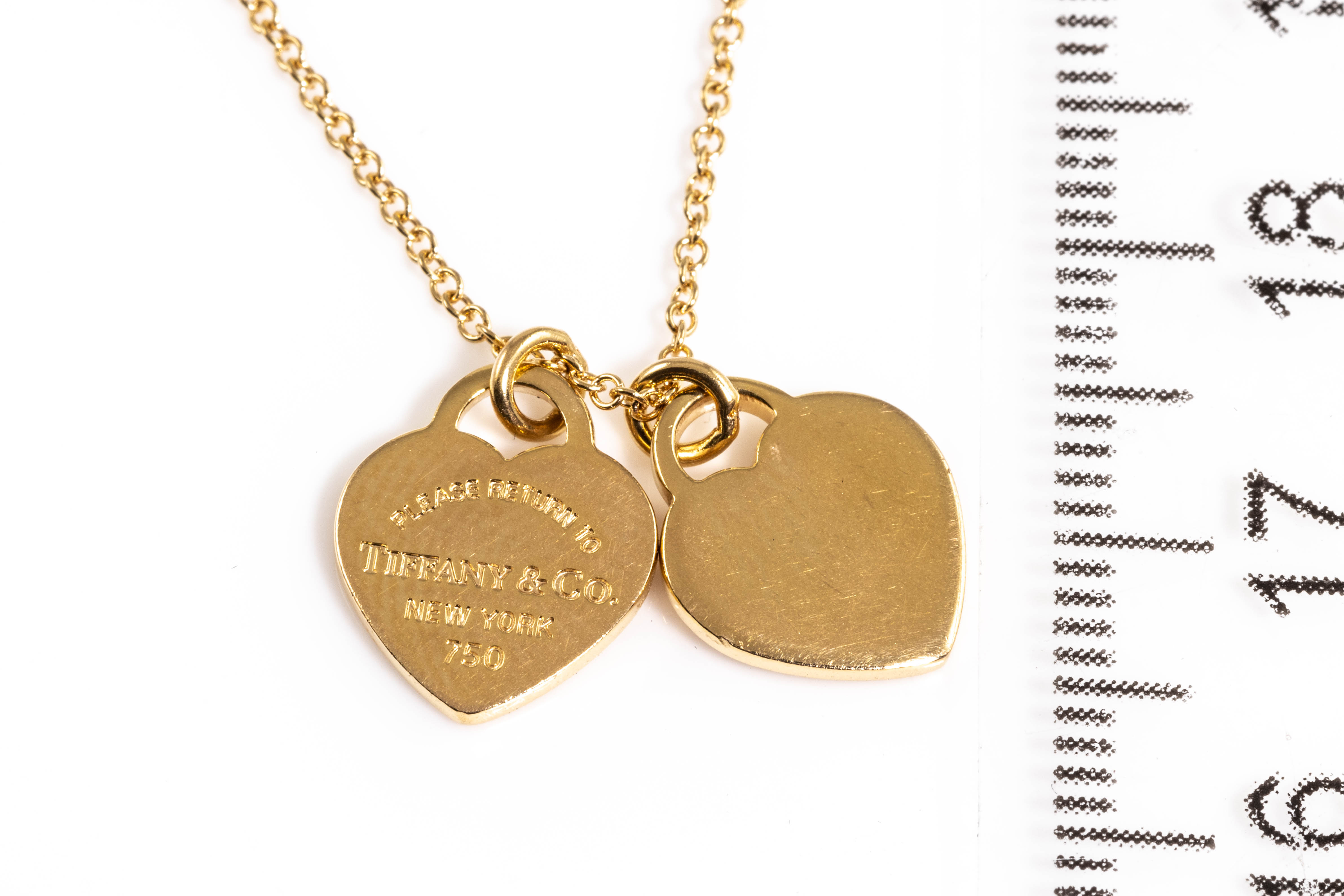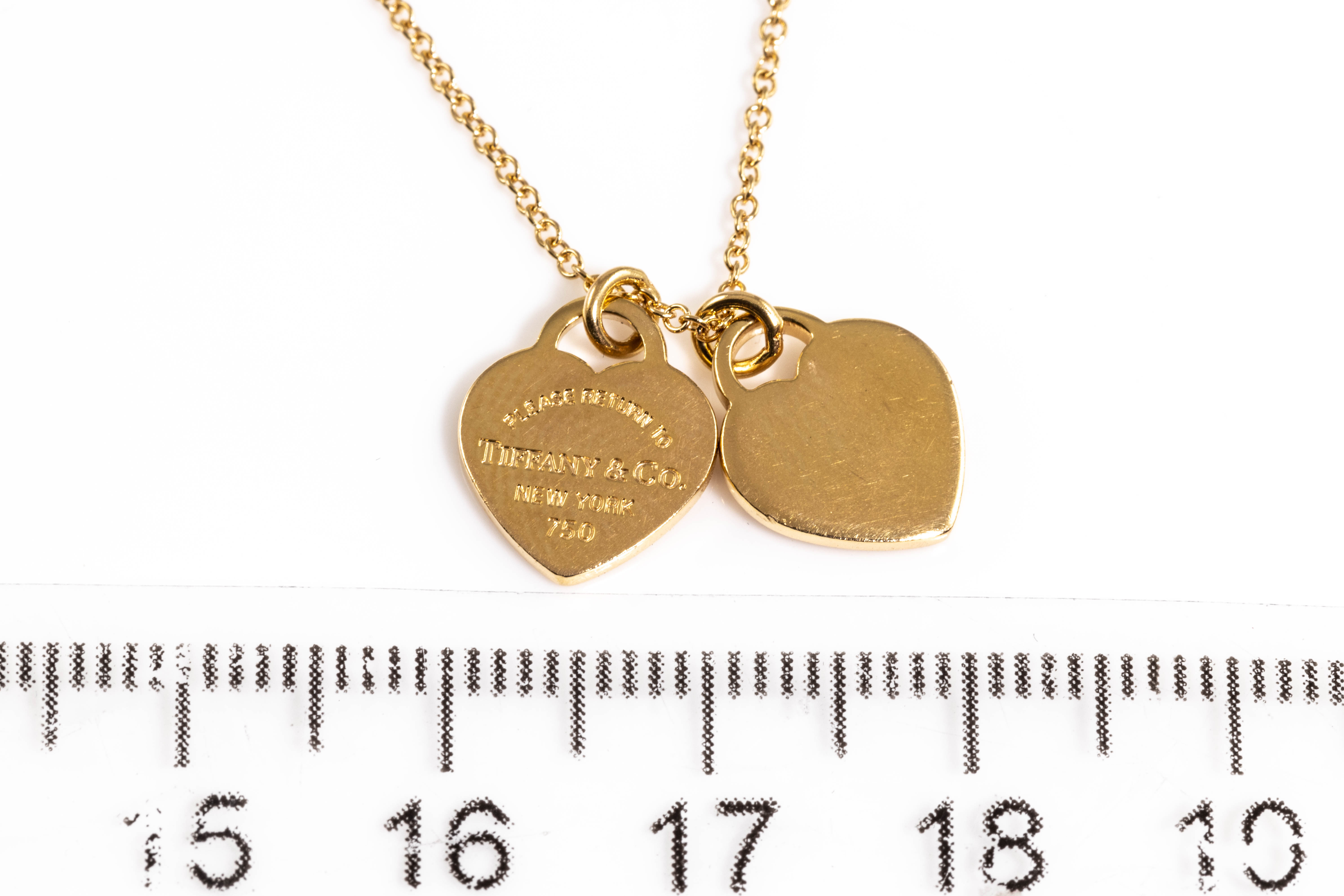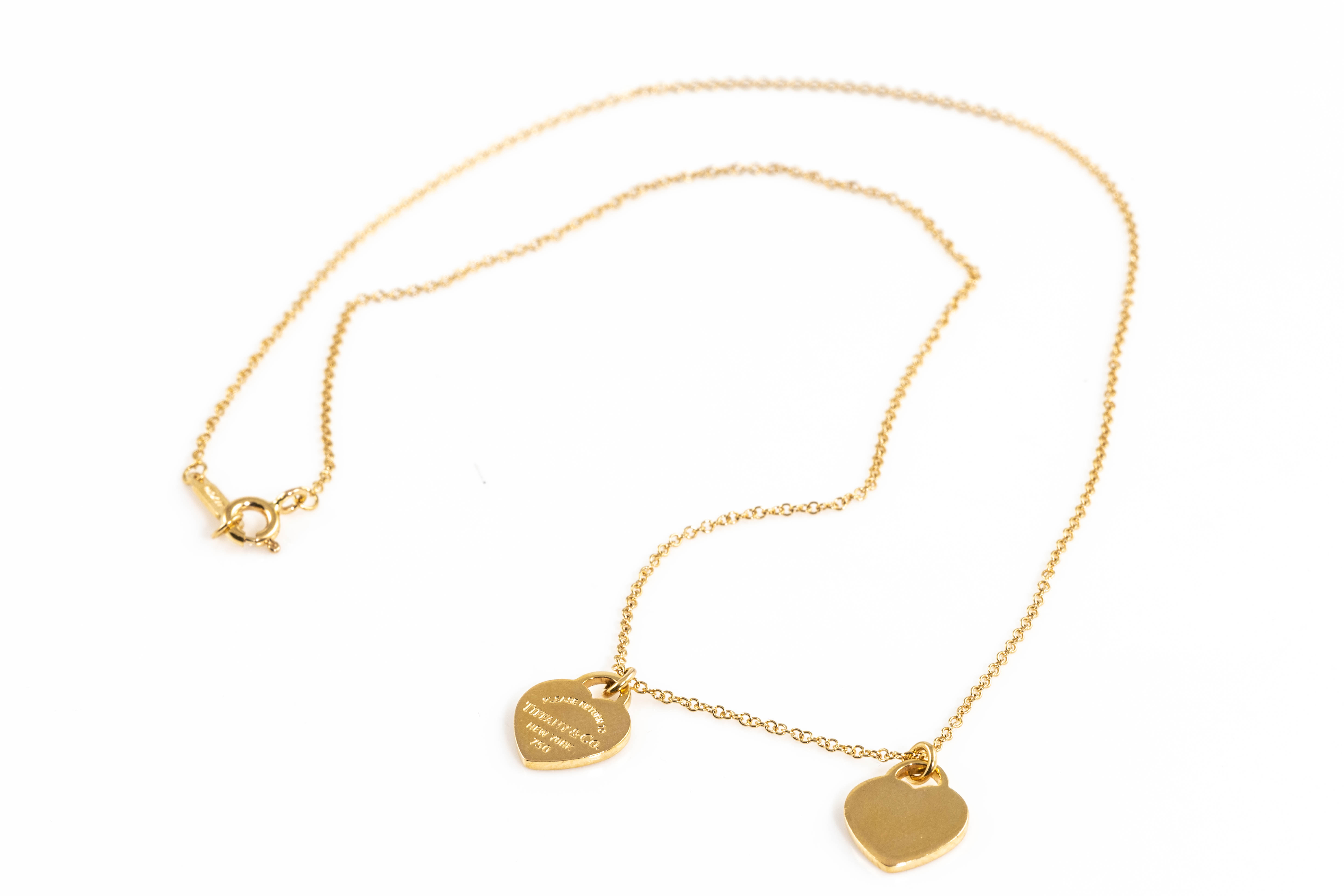 Tiffany & Co double heart tag 'Return To Tiffany' pendant. 18ct rose gold with Tiffany & Co 18ct yellow gold 40cm chain. Weight: 4.1g. With Tiffany & Co box. (Pre-owned)