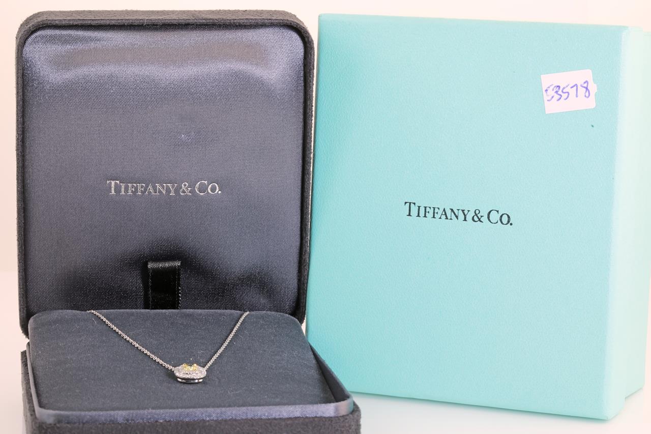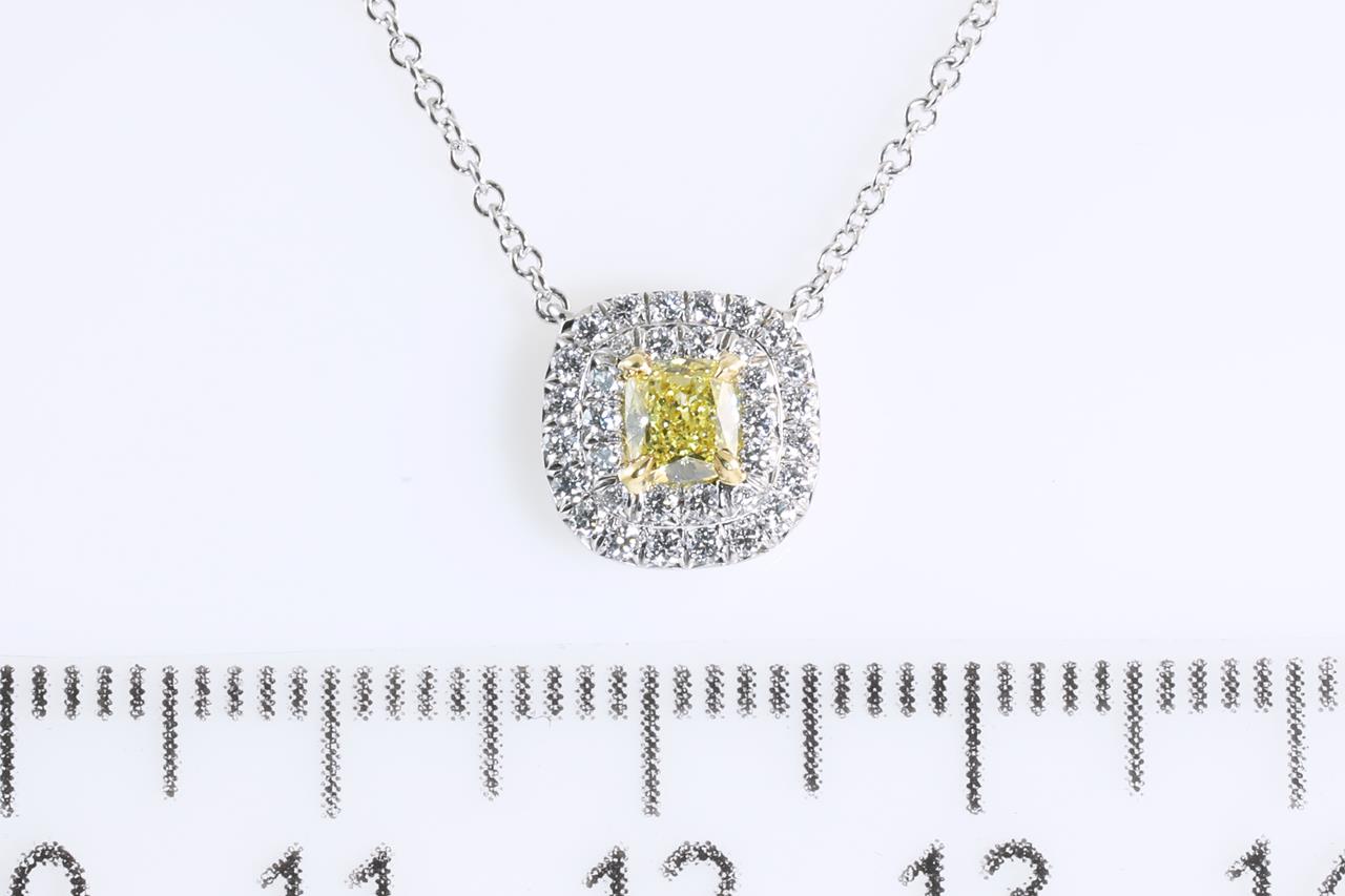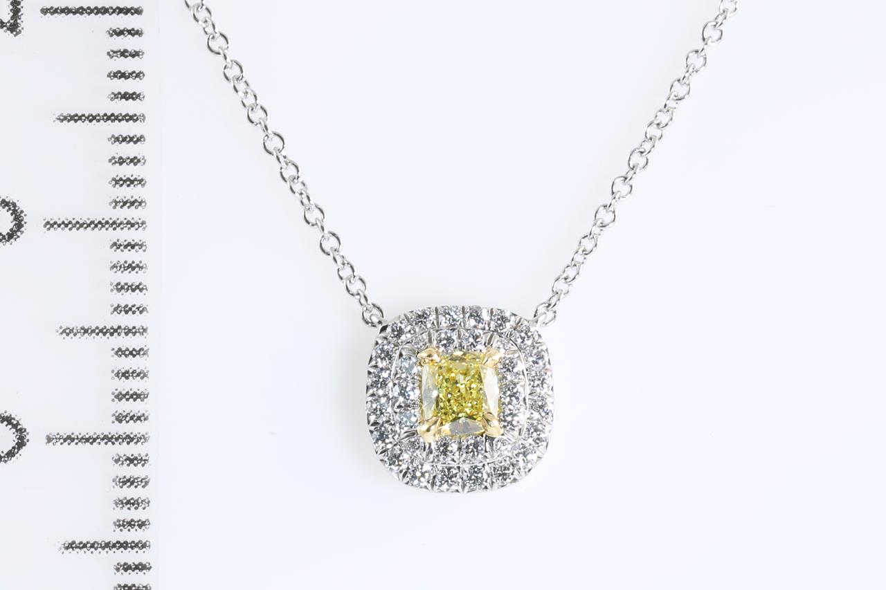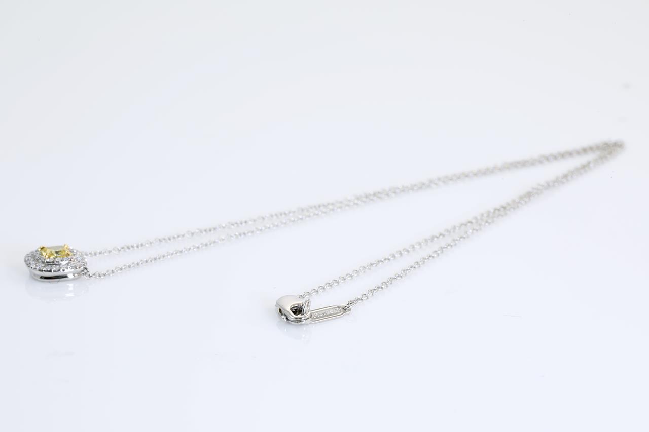 Tiffany & Co Soleste halo pendant with centre cushion cut Diamond of 0.25ct (With Tiffany & Co certificate graded as Natural Fancy Intense Yellow Internally Flawless #M07062267) and remaining Diamonds totalling approximately 33cts. 18ct yellow gold and platinum with attached chain. Length: 40cm. With Tiffany & Co box. Weight: 3.6g. (Pre-owned)