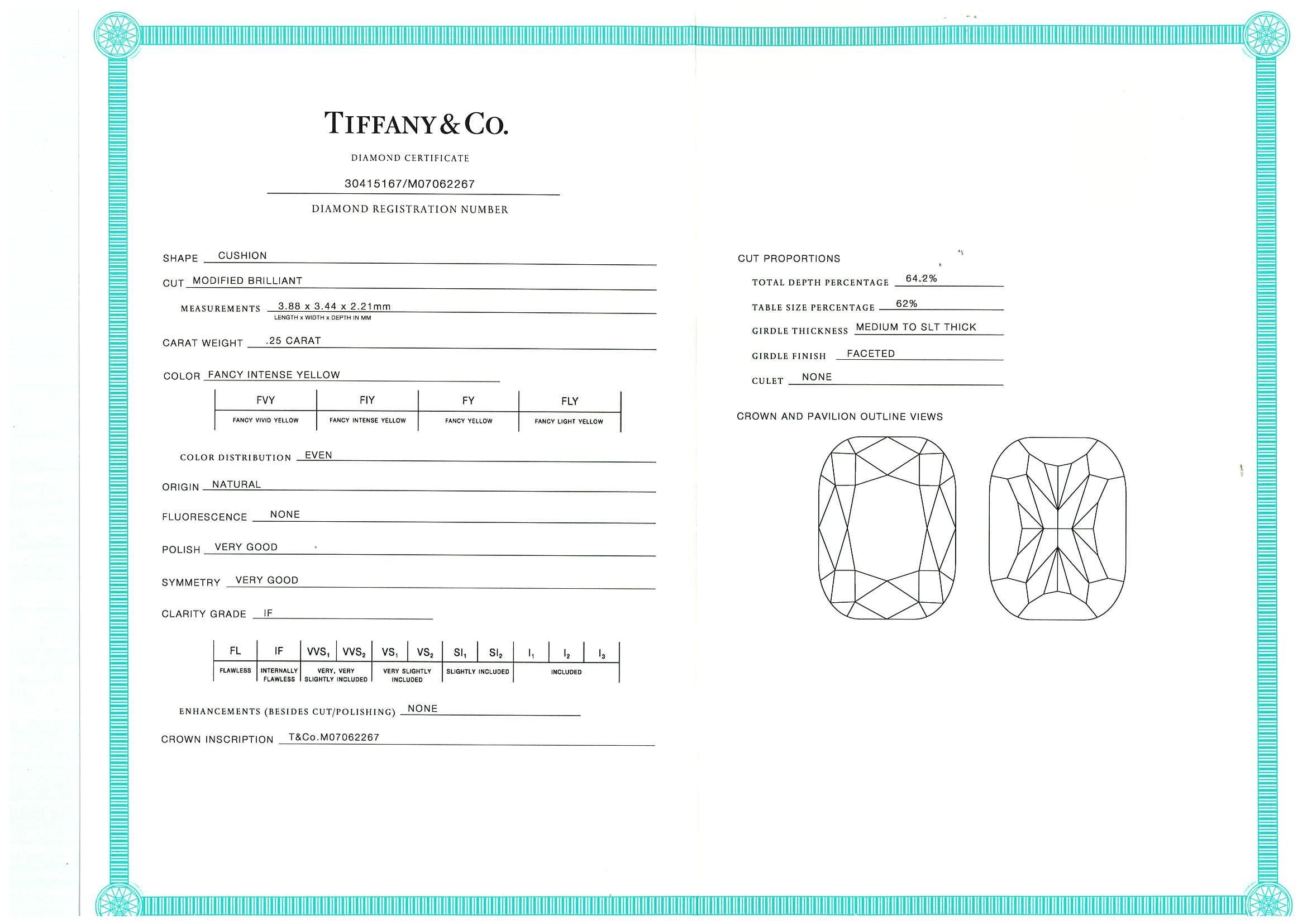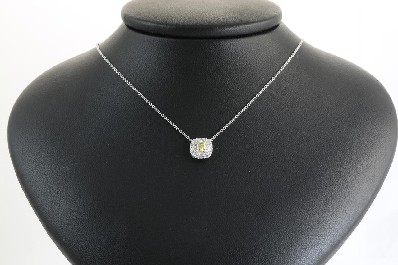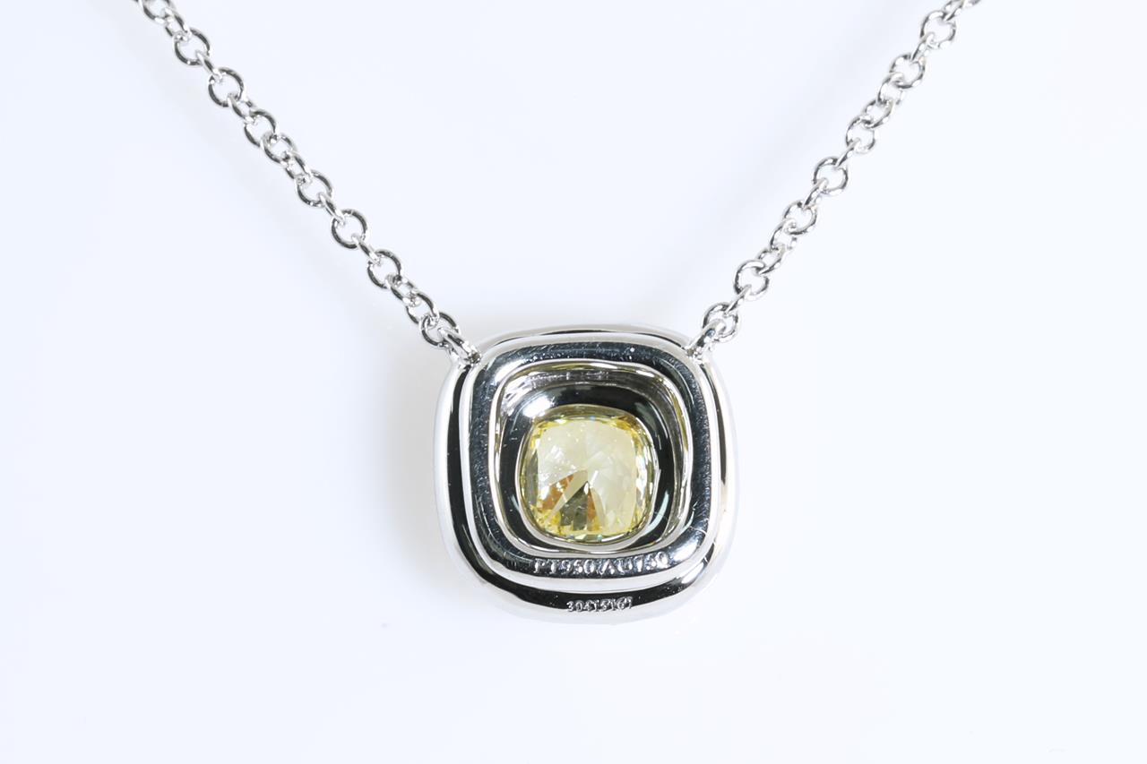 Tiffany & Co Soleste halo pendant with centre cushion cut Diamond of 0.25ct (With Tiffany & Co certificate graded as Natural Fancy Intense Yellow Internally Flawless #M07062267) and remaining Diamonds totalling approximately 33cts. 18ct yellow gold and platinum with attached chain. Length: 40cm. With Tiffany & Co box. Weight: 3.6g. (Pre-owned)