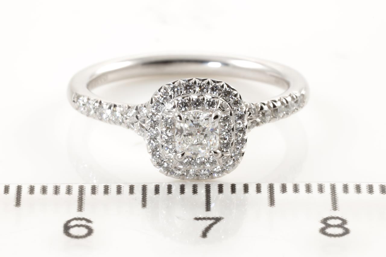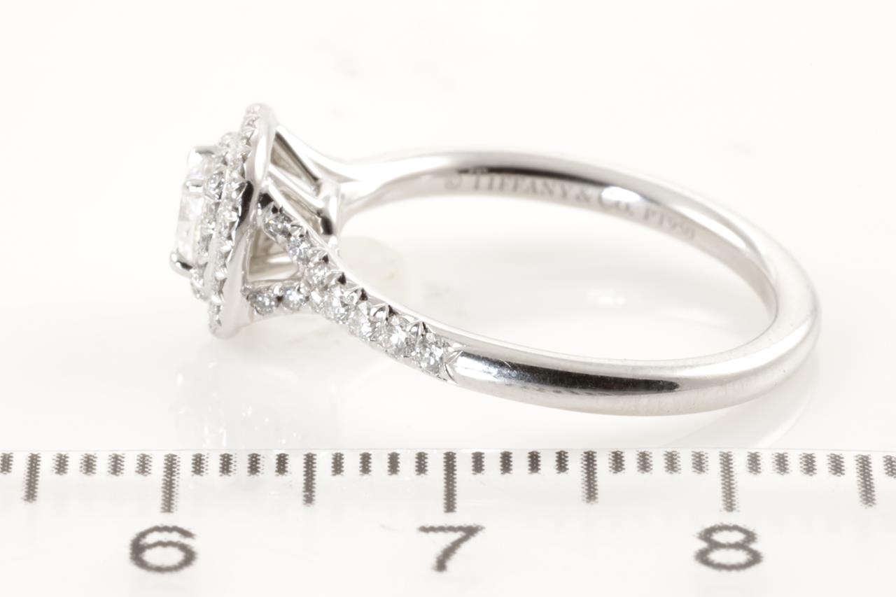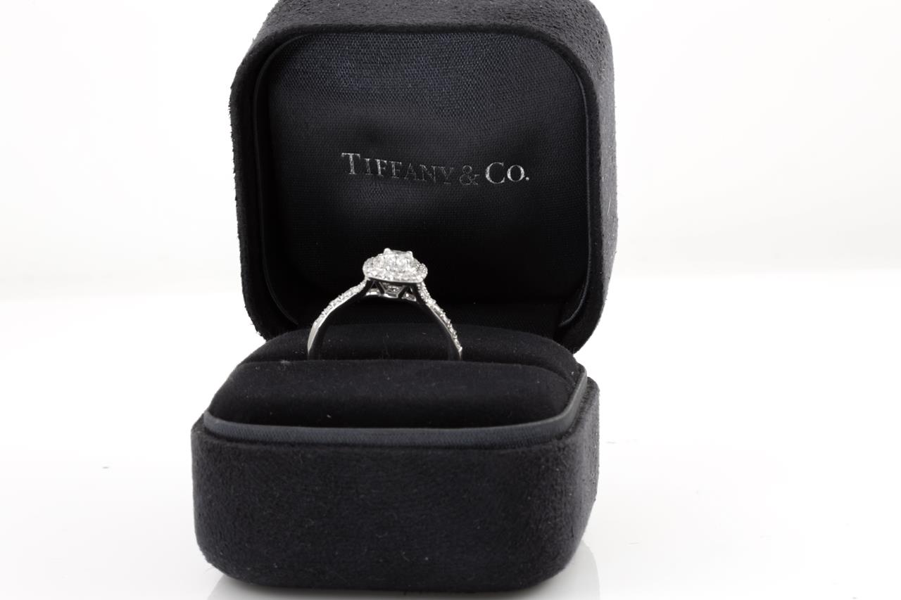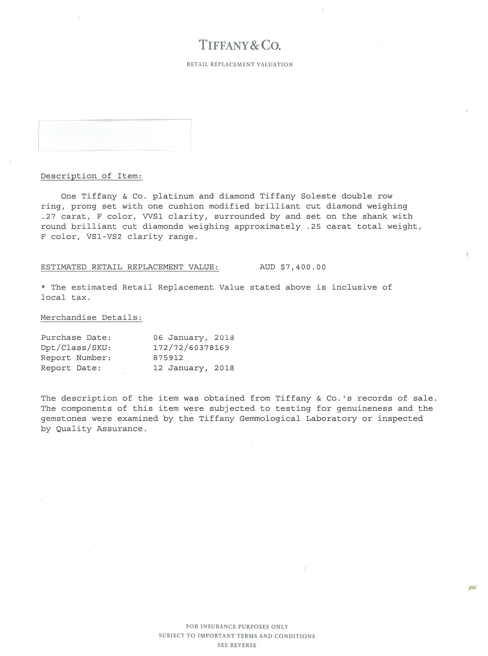 Tiffany & Co Soleste Ring with centre cushion cut Diamond of 0.27ct (Estimated grading: F VVS1), surrounded by round Diamonds totalling approximately 0.25cts. Platinum. Ring size L. Weight 4.7g. With Tiffany & Co. Diamond Certificate and Valuation Certificate dated January 2018. (Pre-owned)