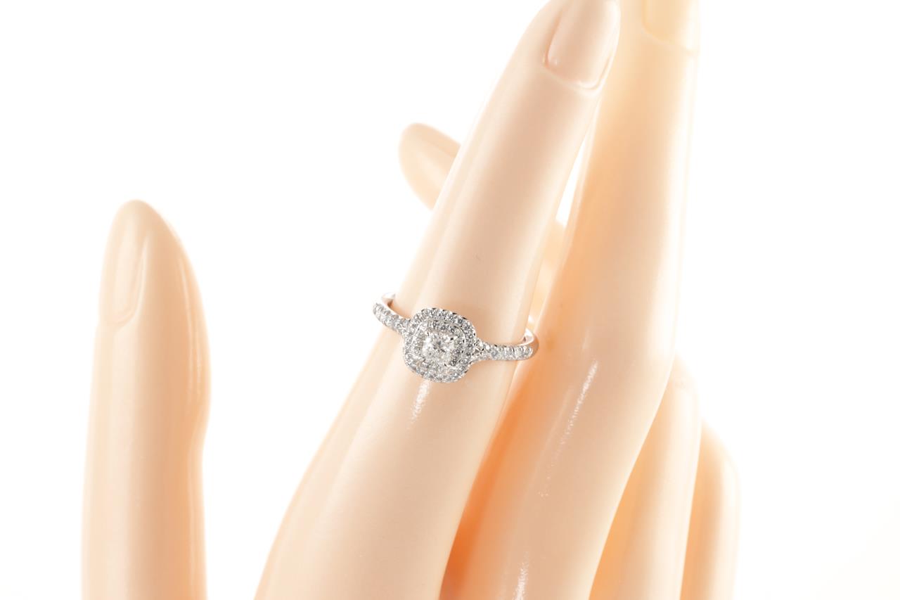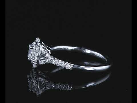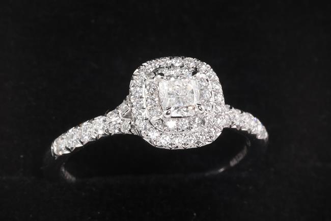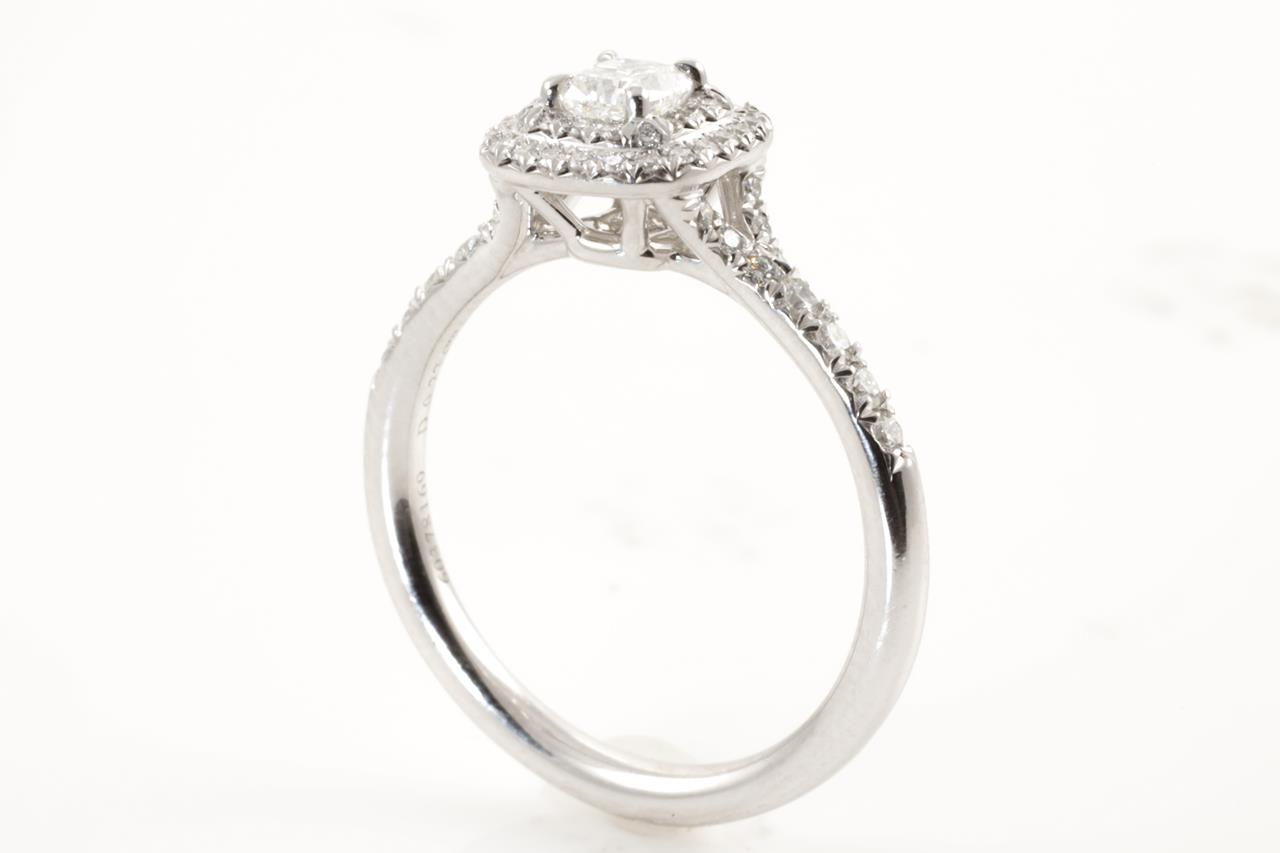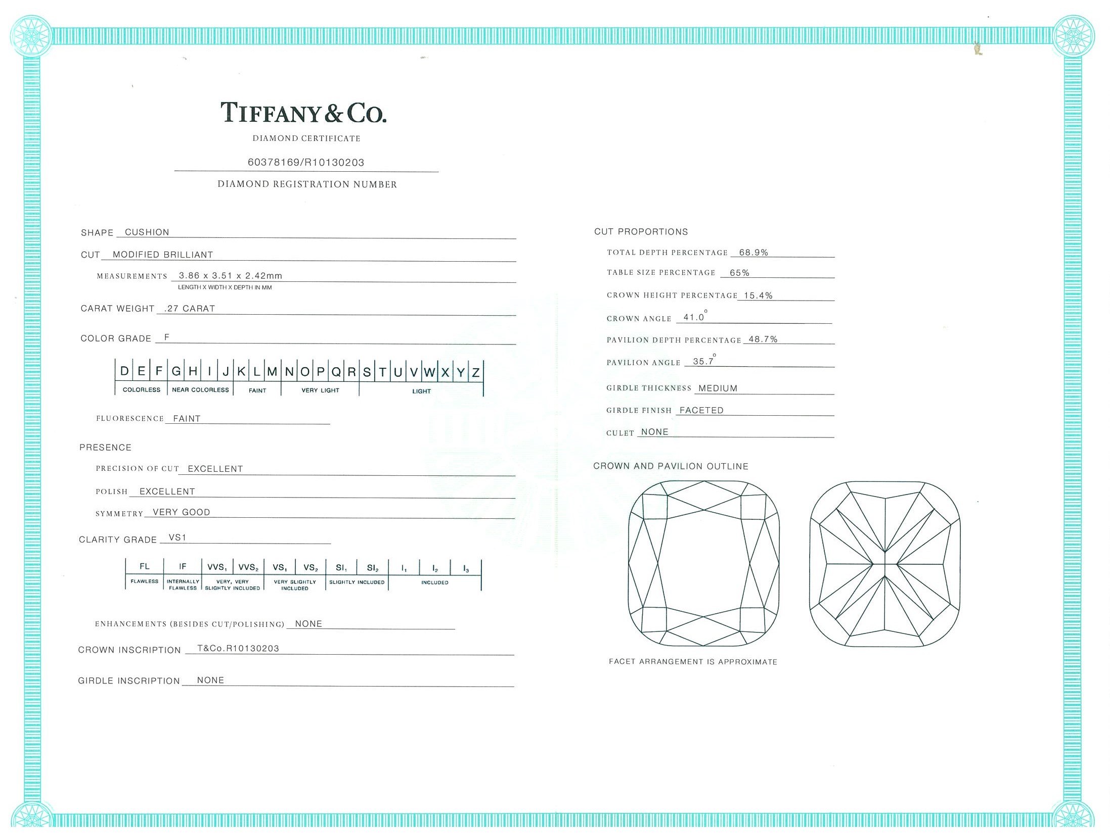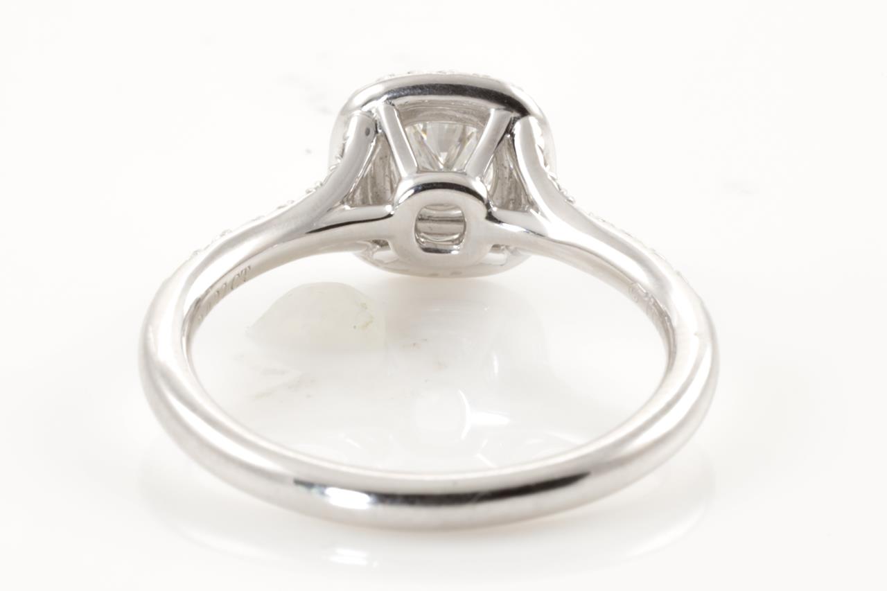 Tiffany & Co Soleste Ring with centre cushion cut Diamond of 0.27ct (Estimated grading: F VVS1), surrounded by round Diamonds totalling approximately 0.25cts. Platinum. Ring size L. Weight 4.7g. With Tiffany & Co. Diamond Certificate and Valuation Certificate dated January 2018. (Pre-owned)