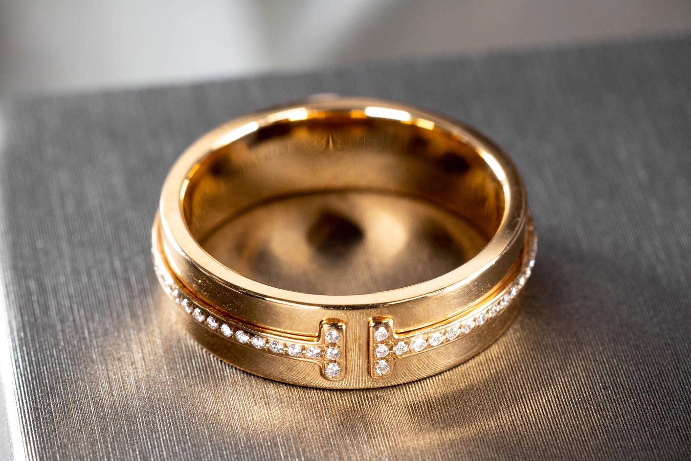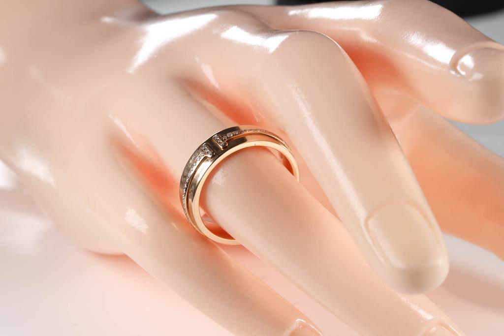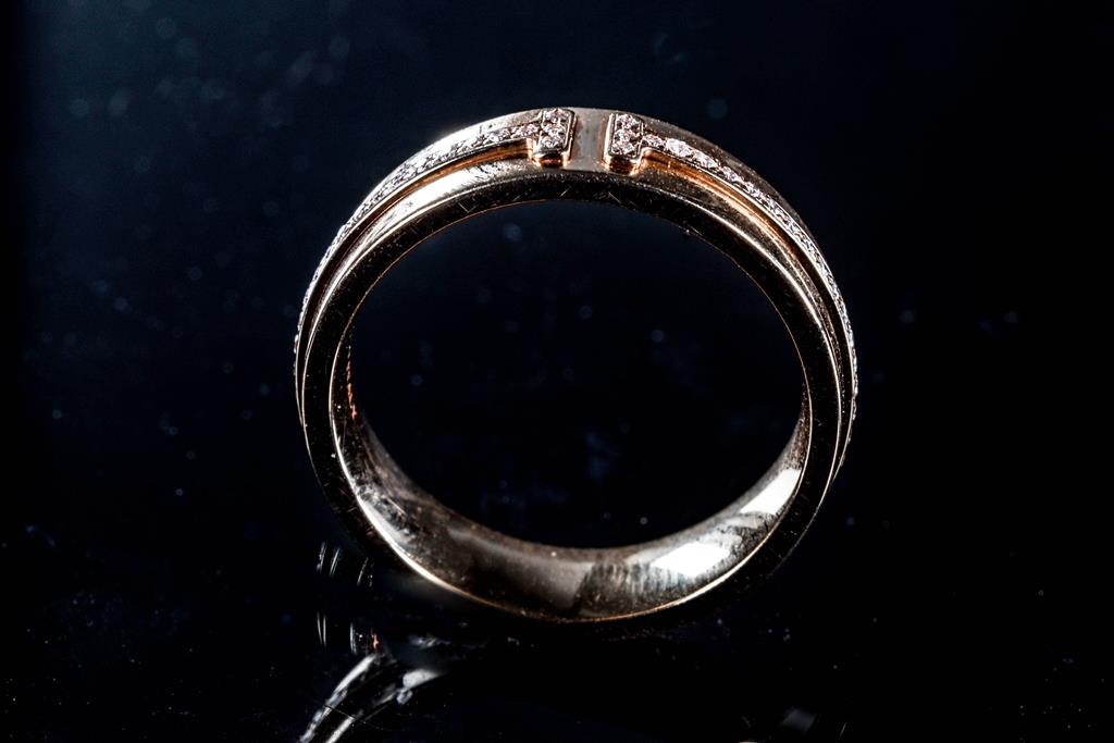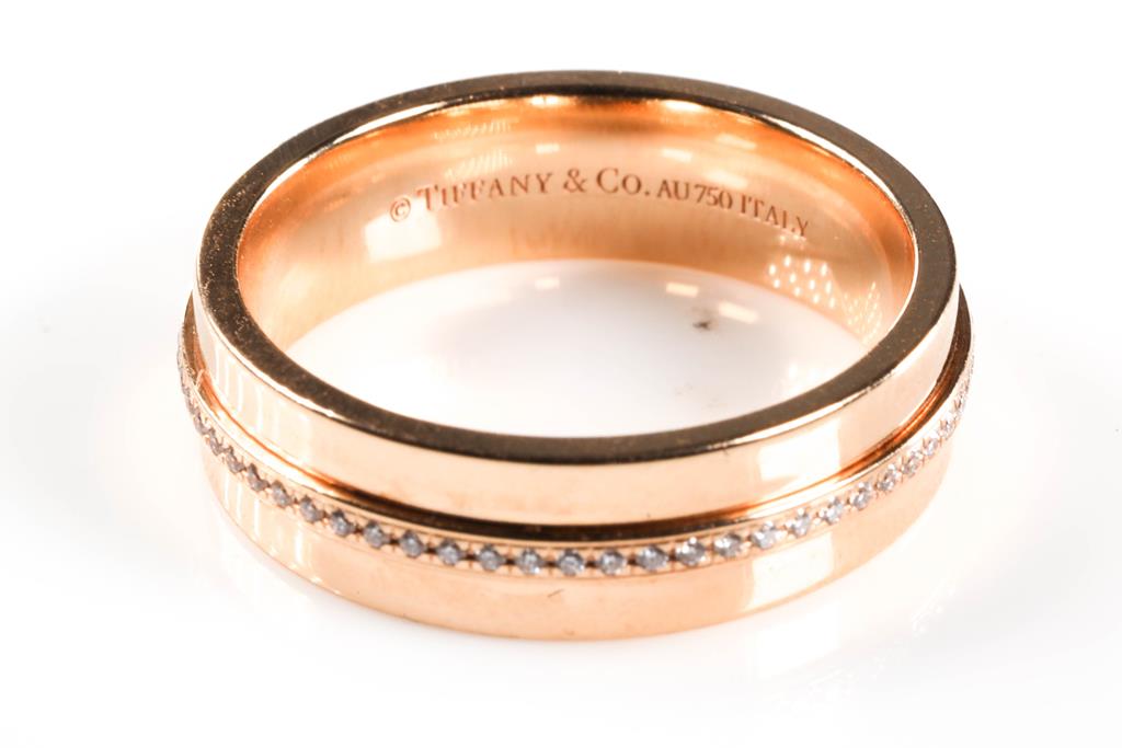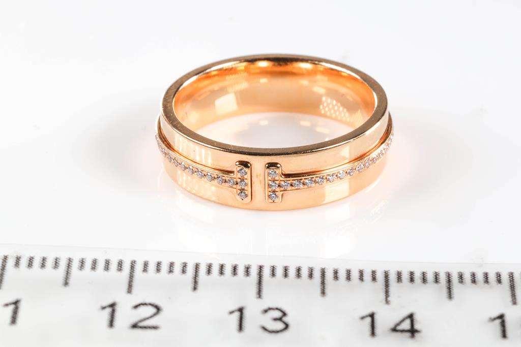 Tiffany & Co T Wide Diamond Ring with round Diamonds totalling 0.12cts. Width 5.5mm. 18ct rose gold. Ring size: M - Ring resizing not recommended. Weight: 6.7g. (Pre-owned)
