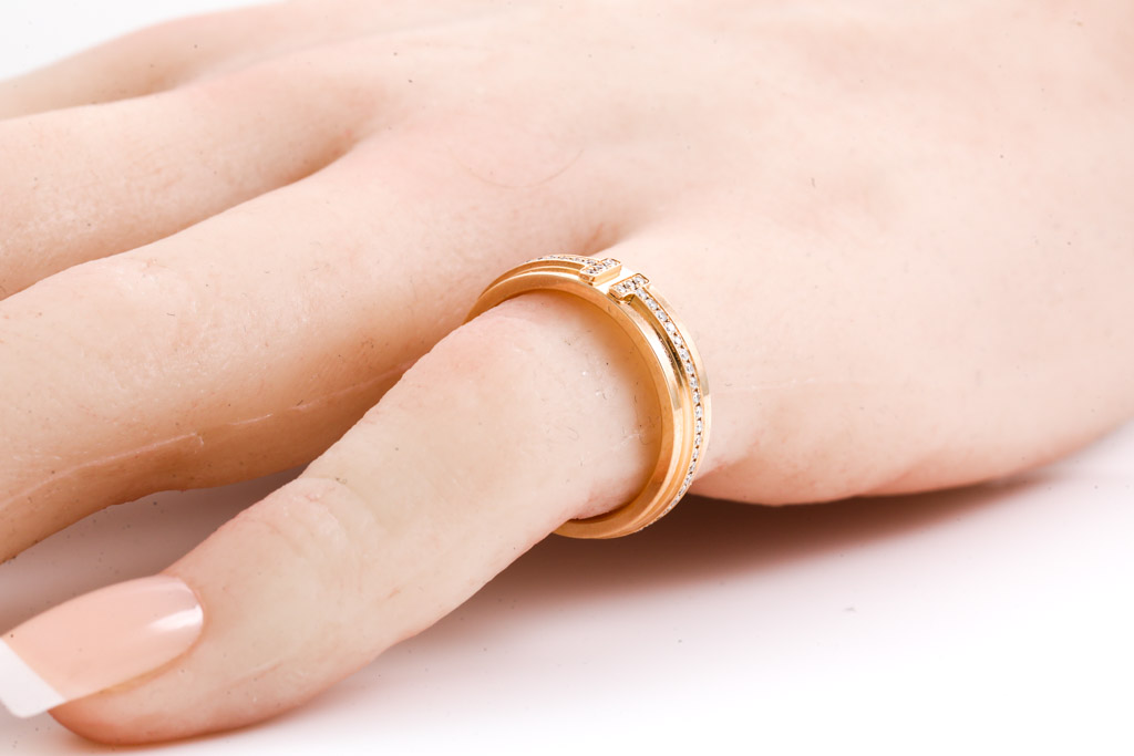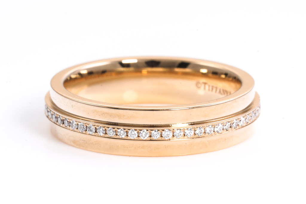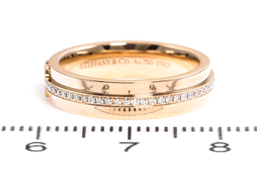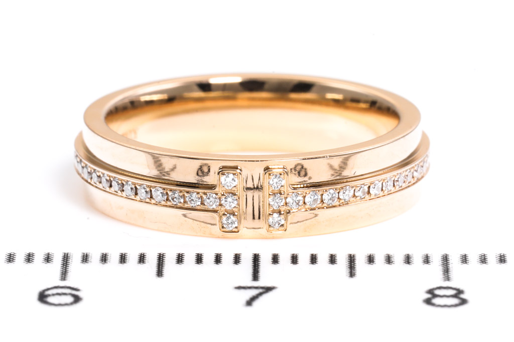 Tiffany & Co T narrow ring with round Diamonds totalling 0.13cts. 18ct rose gold. Made in Italy. Ring size J - ring resizing is not recommended. Weight: 5.4g. Width: 4.5mm. With Tiffany & Co box. (Pre-owned)