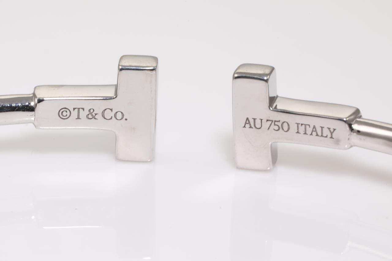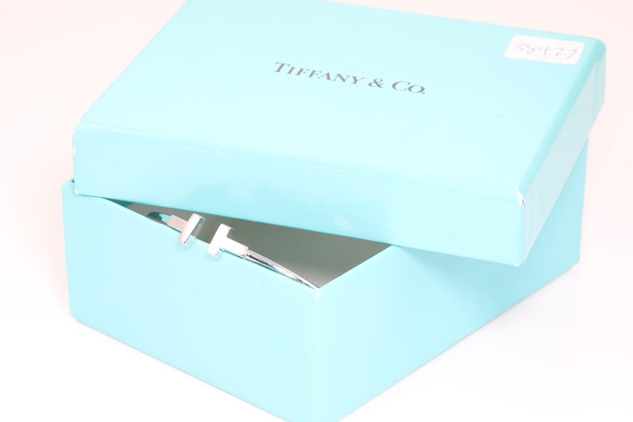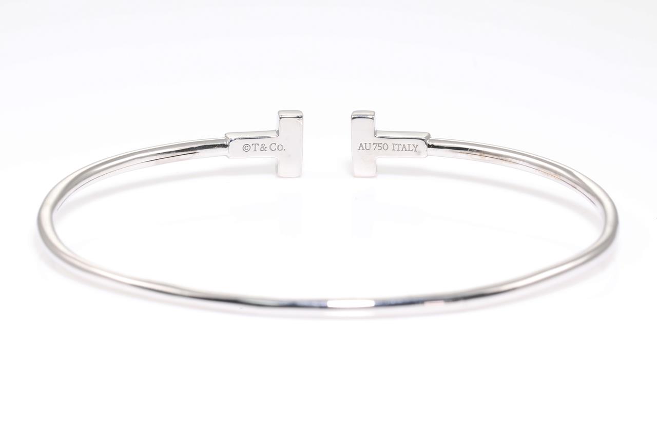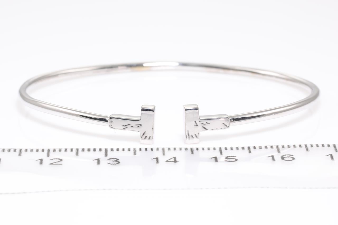 Tiffany & Co T Narrow Wire bracelet. 18ct white gold. Circumference 15.5cm. Made in Italy. Note minor deformity at back of bracelet. Weight: 5g. With Tiffany & Co box. (Pre-owned)