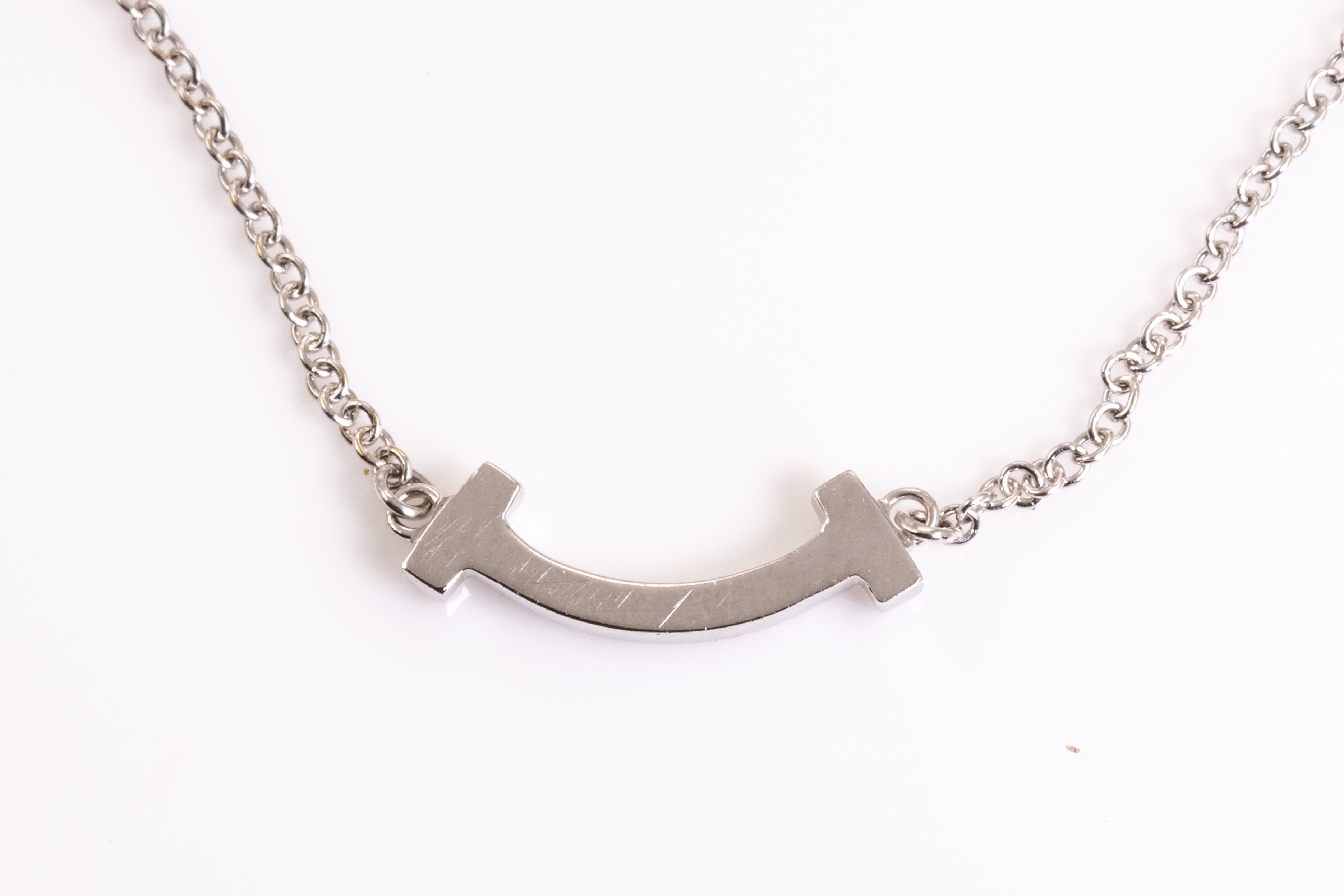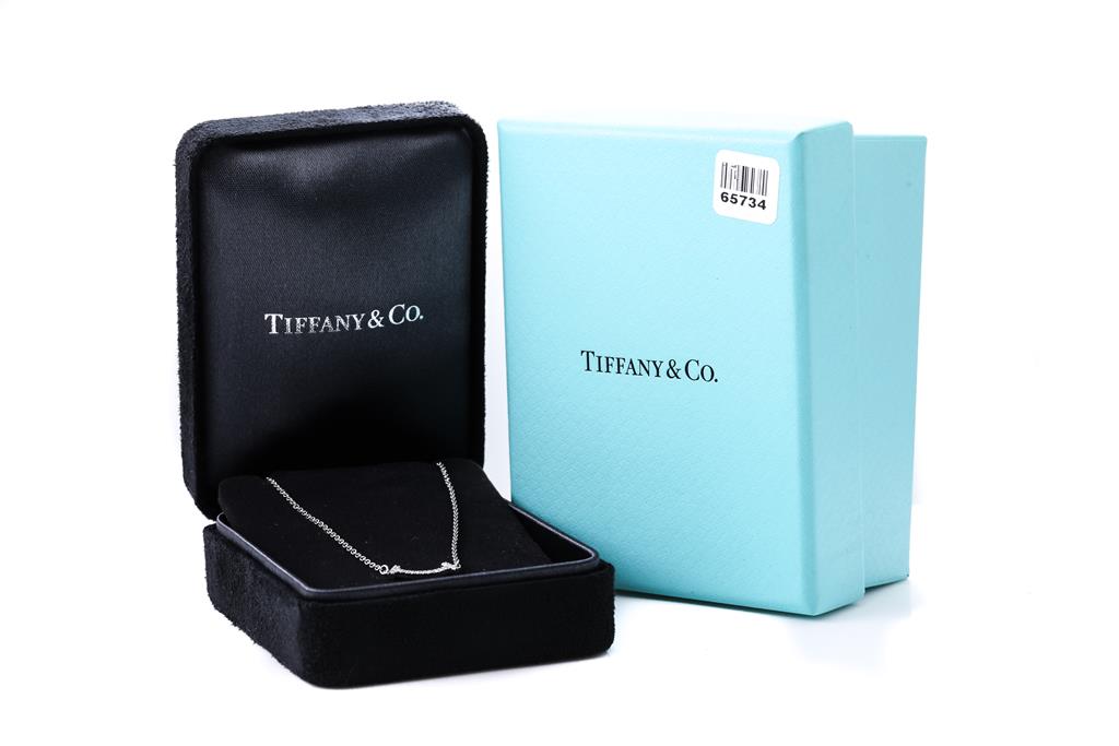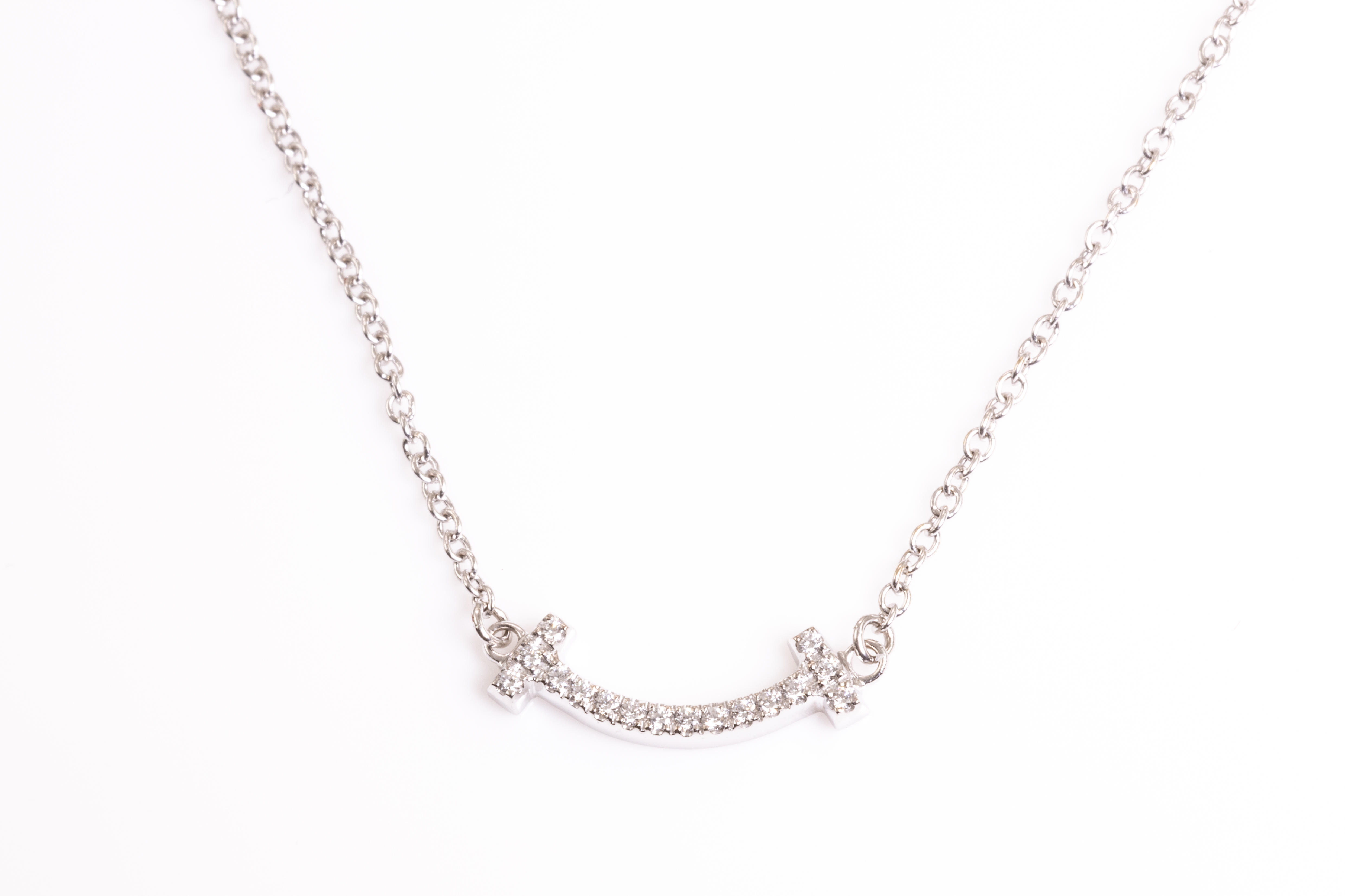 Tiffany & Co T Mini Smile Diamond pendant with round Diamonds totalling 0.03cts. 18ct white gold with attached 46cm chain. Weight: 2.4g. With Tiffany & Co box. (Pre-owned)