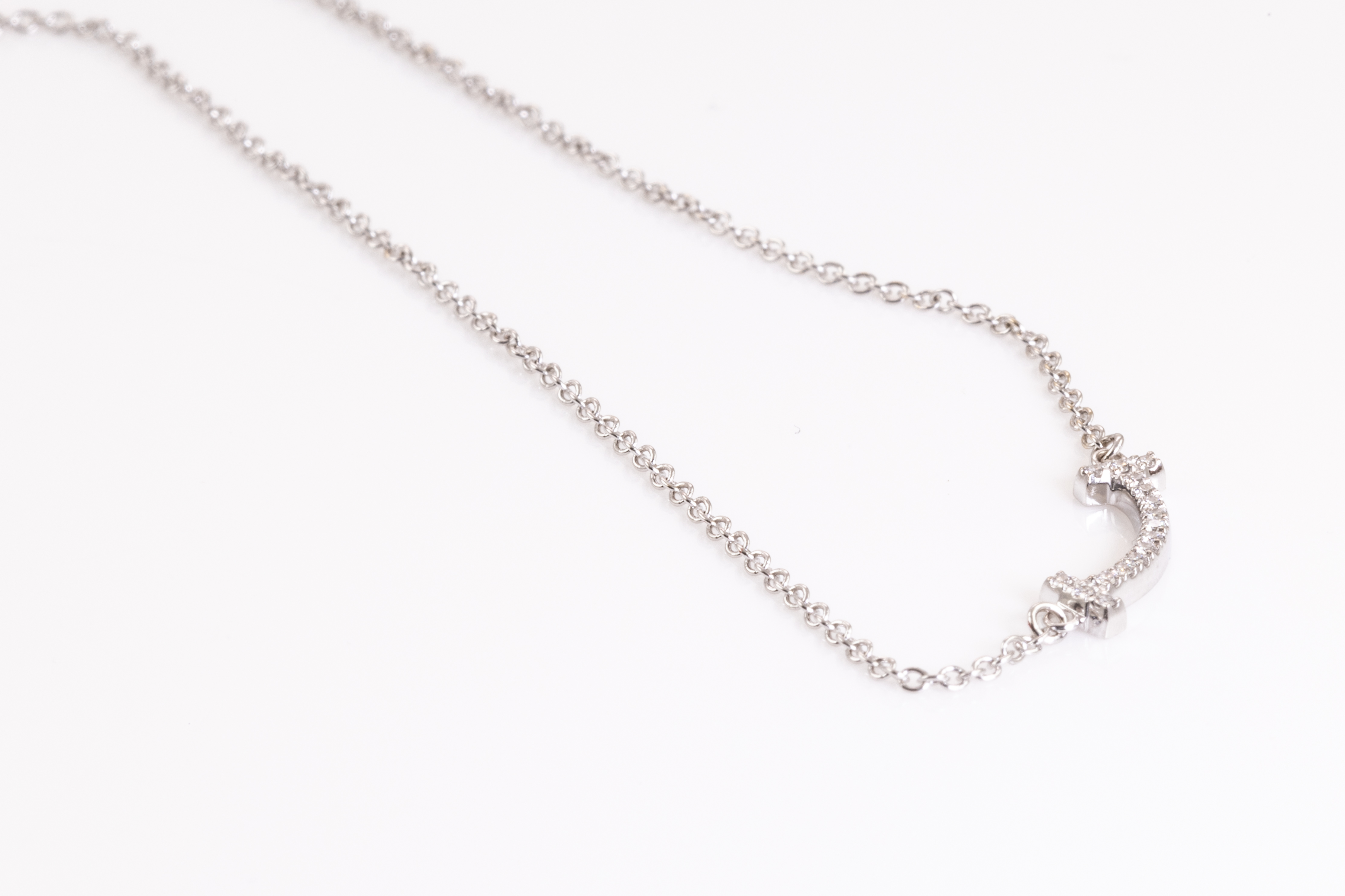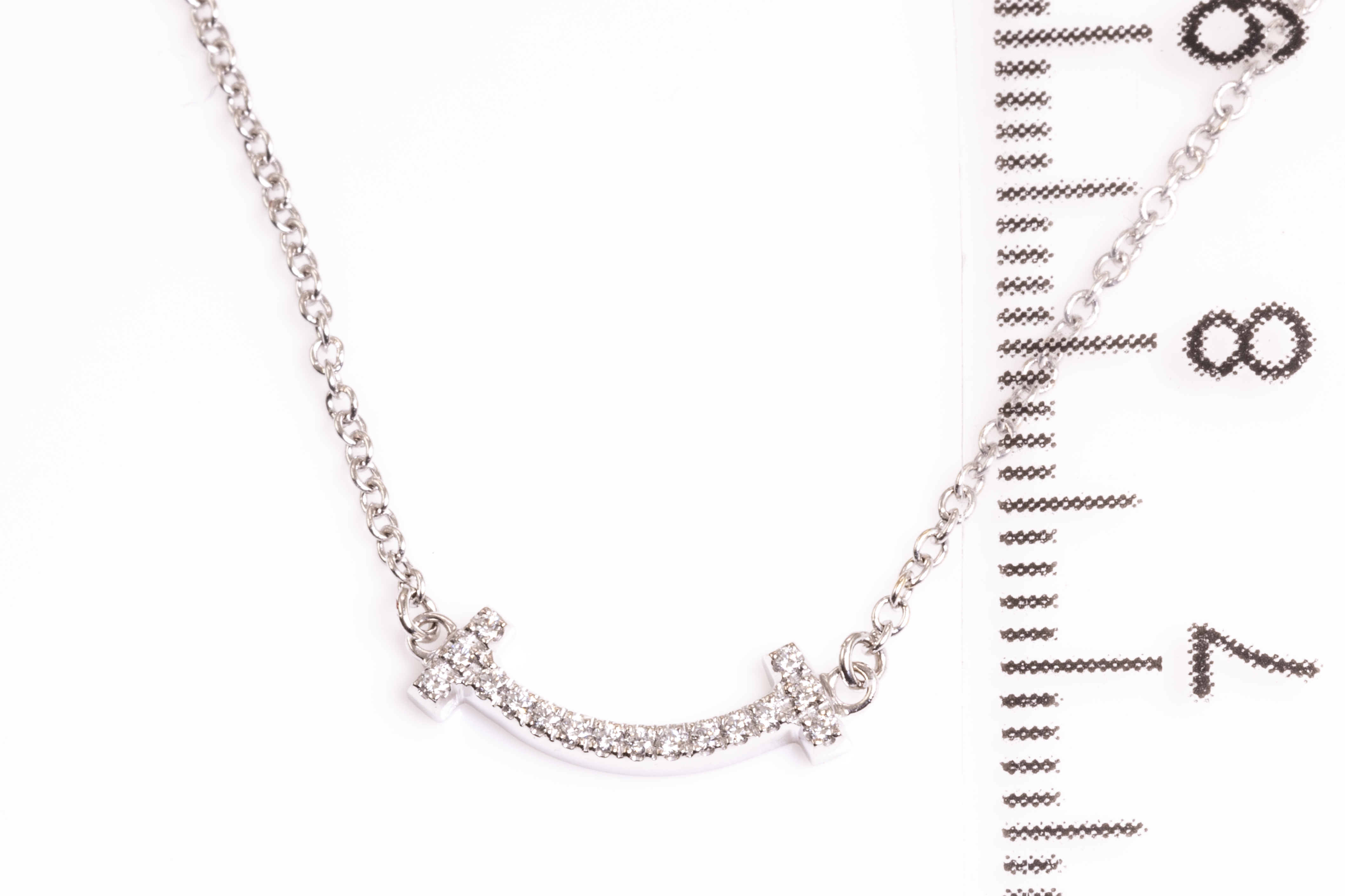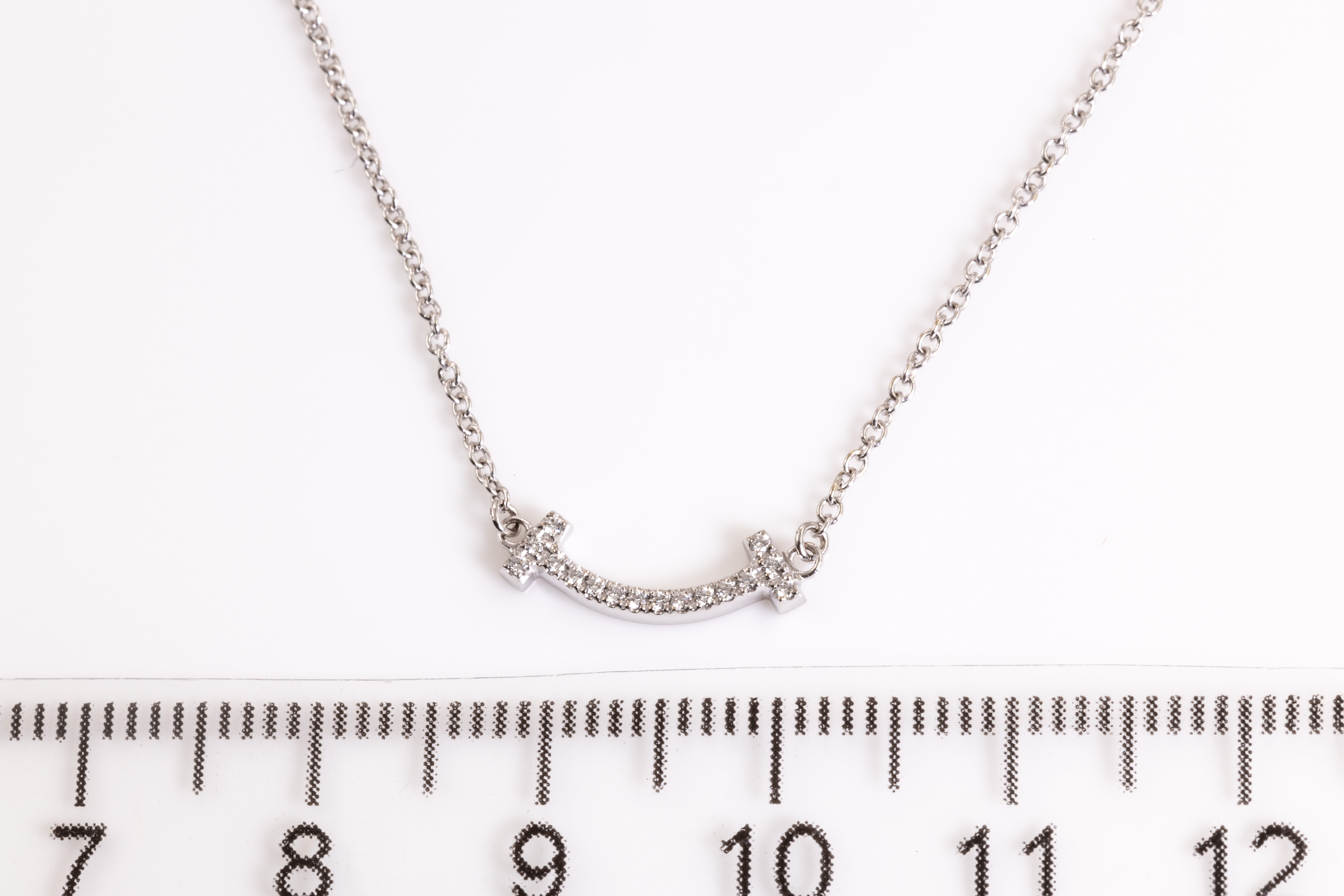 Tiffany & Co T Mini Smile Diamond pendant with round Diamonds totalling 0.03cts. 18ct white gold with attached 46cm chain. Weight: 2.4g. With Tiffany & Co box. (Pre-owned)